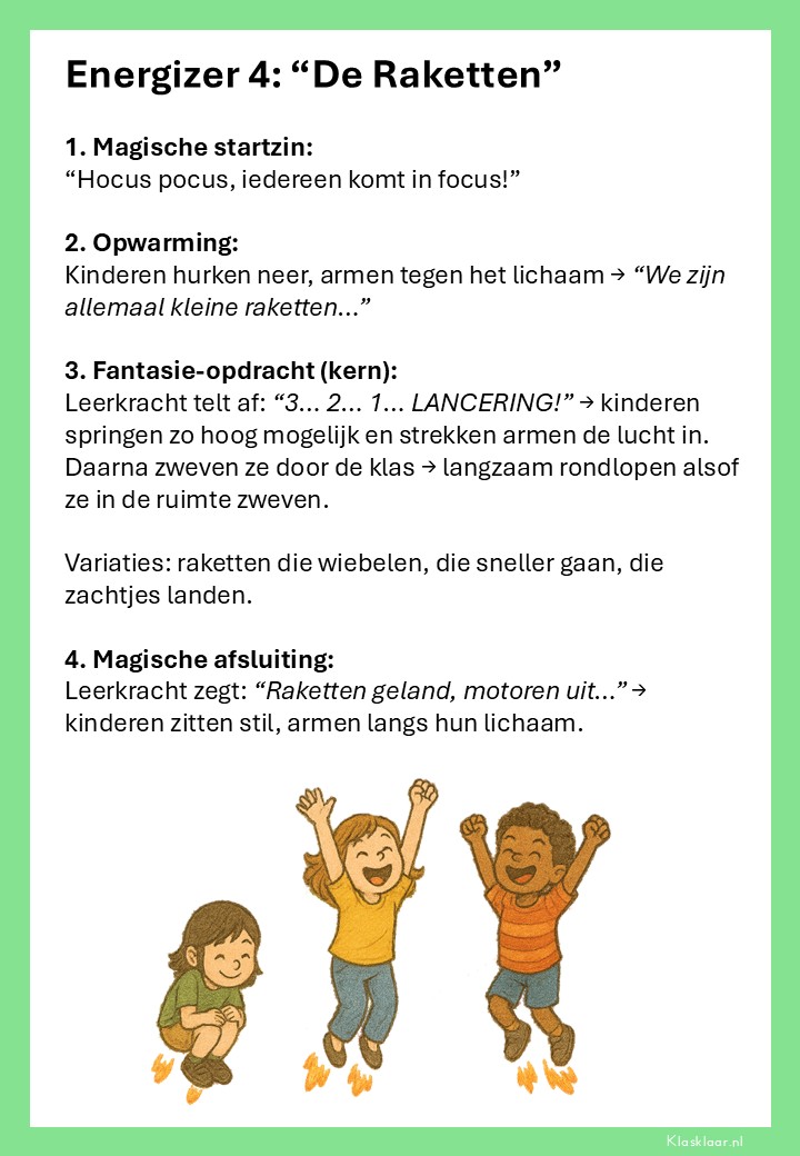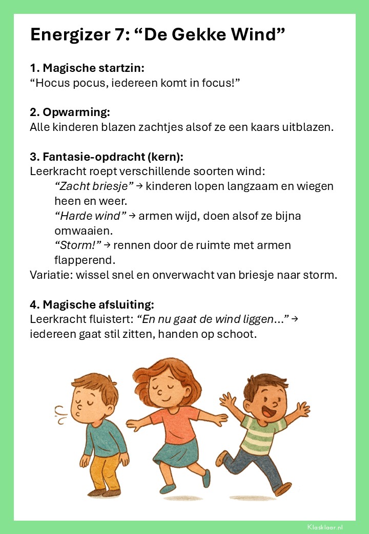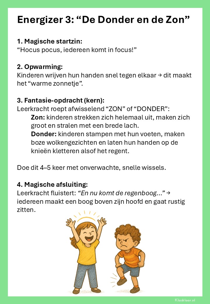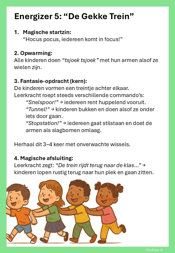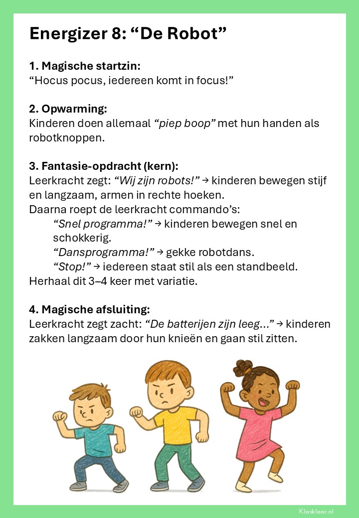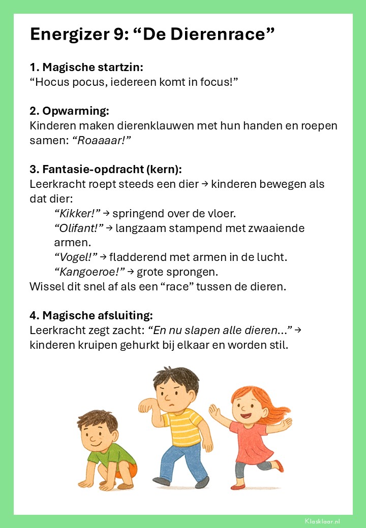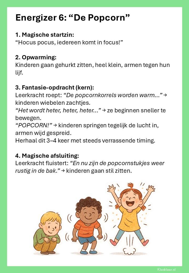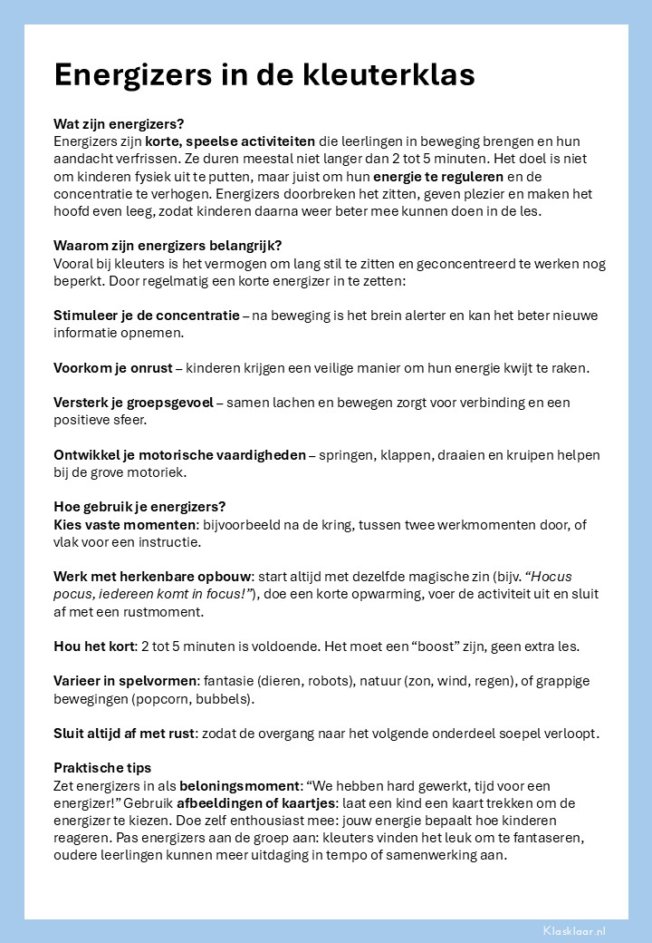 Energizers zijn korte, speelse oefeningen om de aandacht van leerlingen in groep 1/2 te herwinnen. Ze zorgen voor een frisse afwisseling: bewegen, lachen en toch leerzaam. Ideaal om in te zetten tussen langere lessen door of na pauzes, zodat kinderen met hernieuwde motivatie verder gaan. De opdrachten zijn eenvoudig op te zetten en vereisen weinig voorbereiding.
