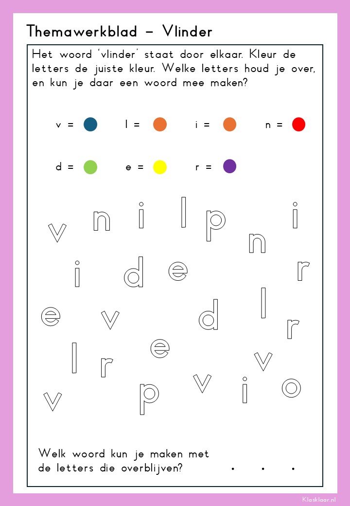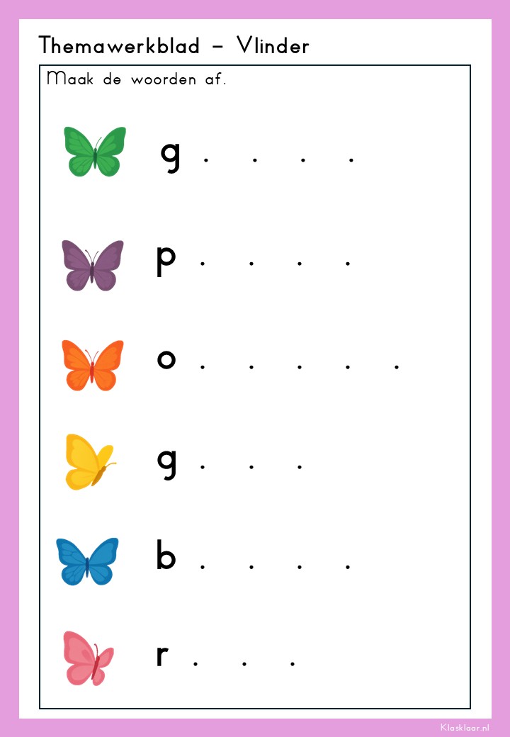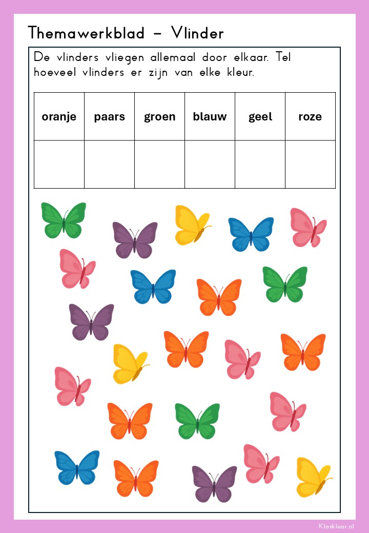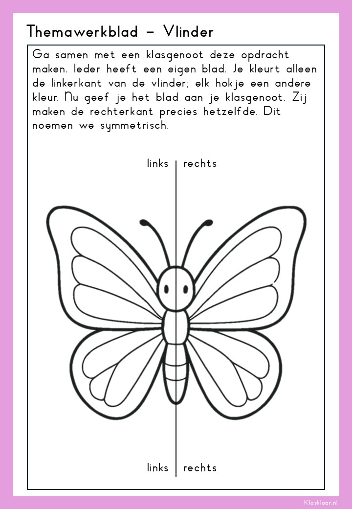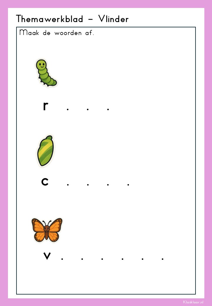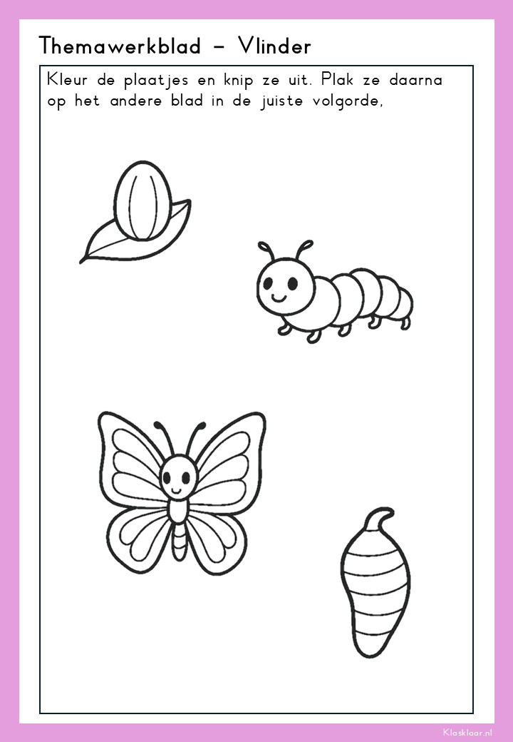 Thema ‘Vlinder’ laat kleuters de wonderlijke levenscyclus van de vlinder ontdekken: van rups tot cocon en prachtige vlinder. De werkbladen en activiteiten stimuleren zowel waarneming, fijne motoriek als taalontwikkeling. Kleuren, knippen, luisteren en symmetrie komen aan bod – speels en passend bij de belevingswereld van jonge kinderen. Perfect voor in de klas én thuis om de natuur écht te gaan beleven.