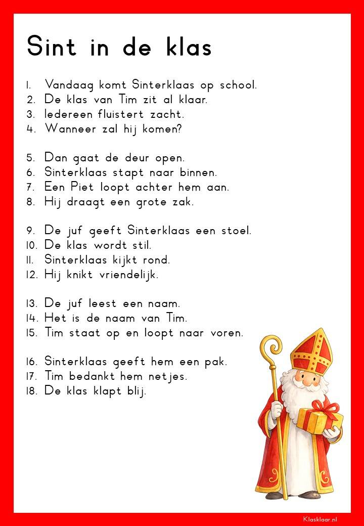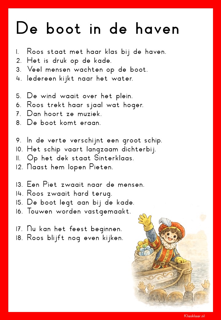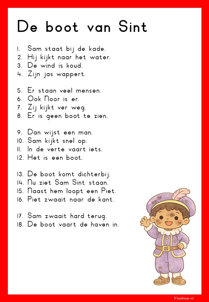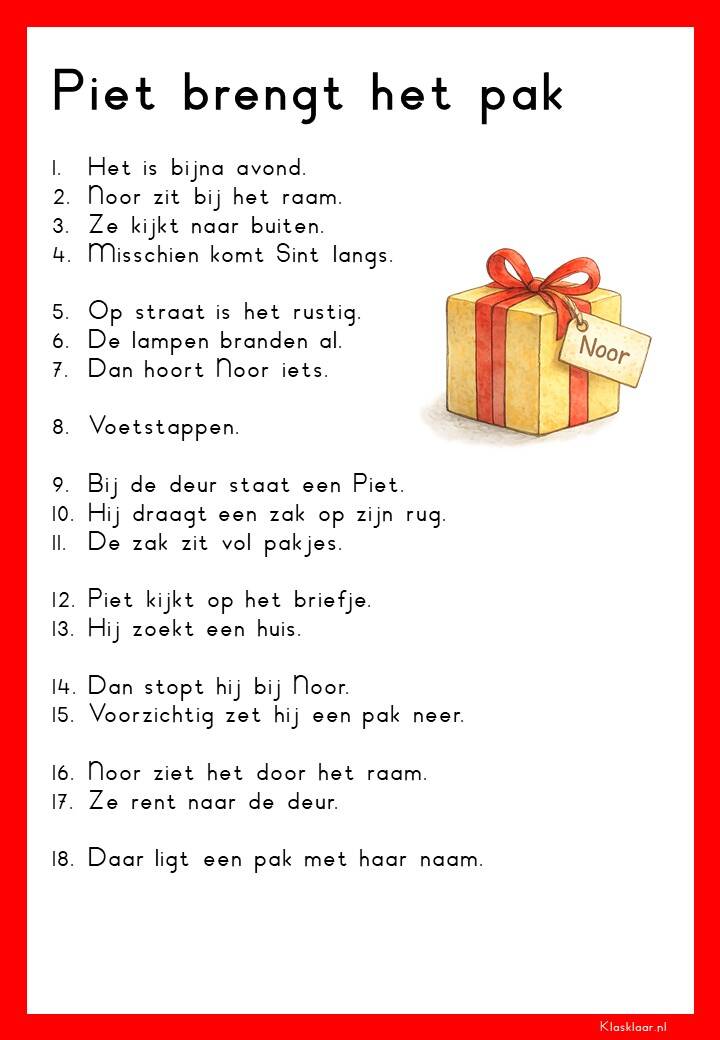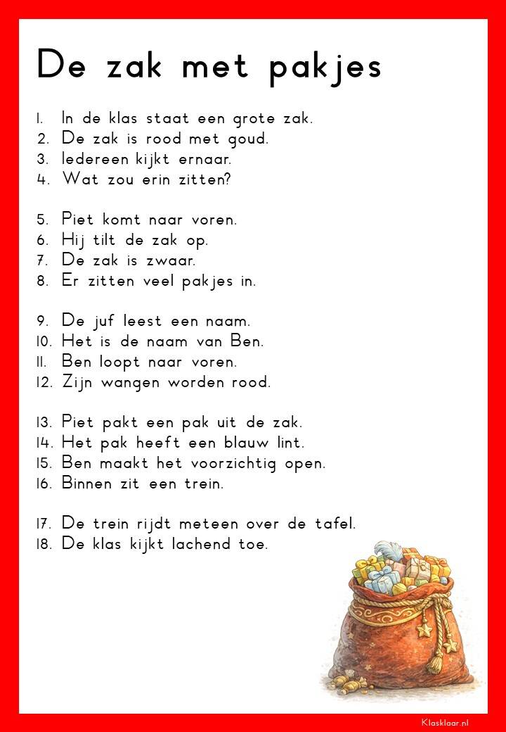 Op deze pagina vind je leesteksten voor groep 3 over het thema Sinterklaas. De verhalen sluiten aan bij de belevingswereld van jonge lezers en gaan over pakjes, Pieten, het paard en het feest in december. Elk thema bevat 12 teksten: 6 op M3-niveau en 6 op E3-niveau. Zo kunnen leerlingen stap voor stap oefenen met lezen terwijl ze genieten van een herkenbaar en gezellig onderwerp.