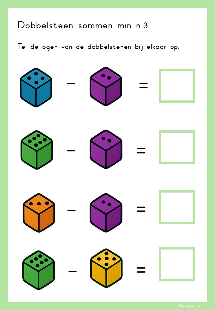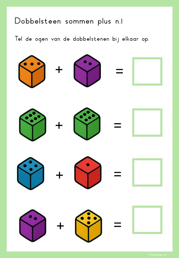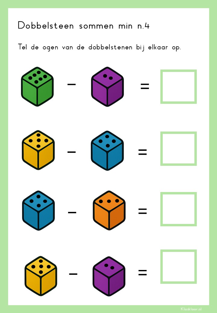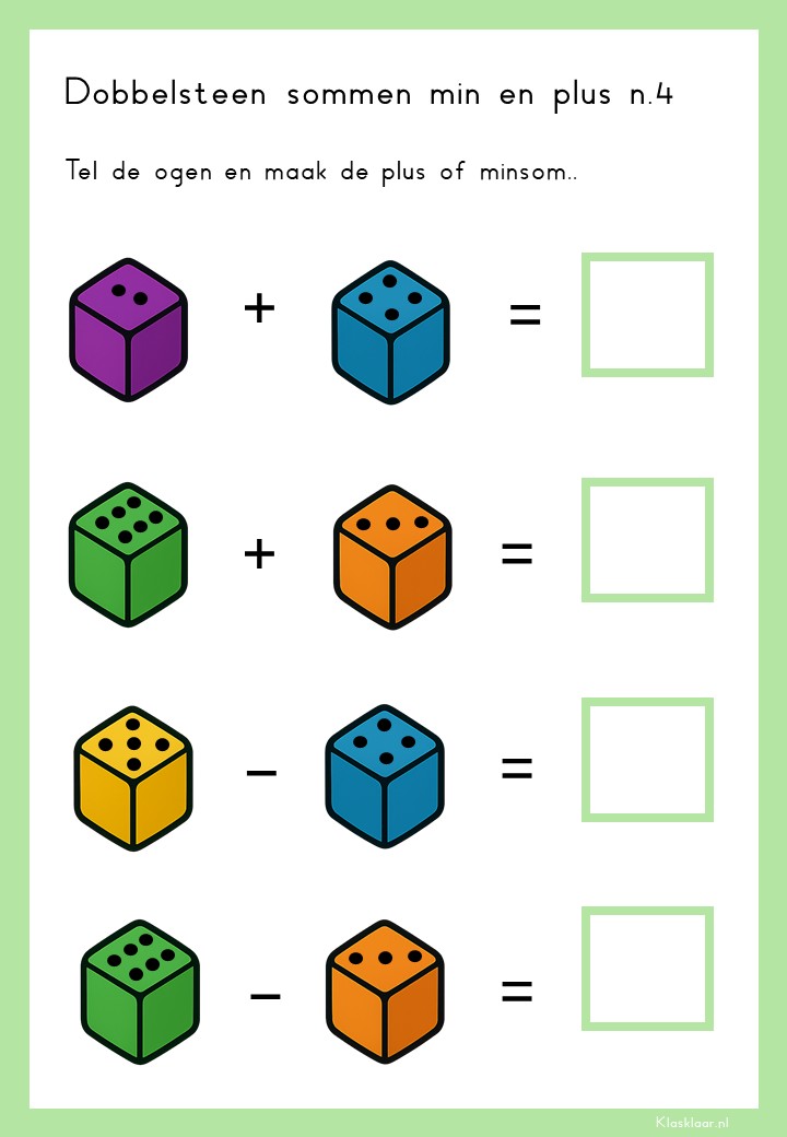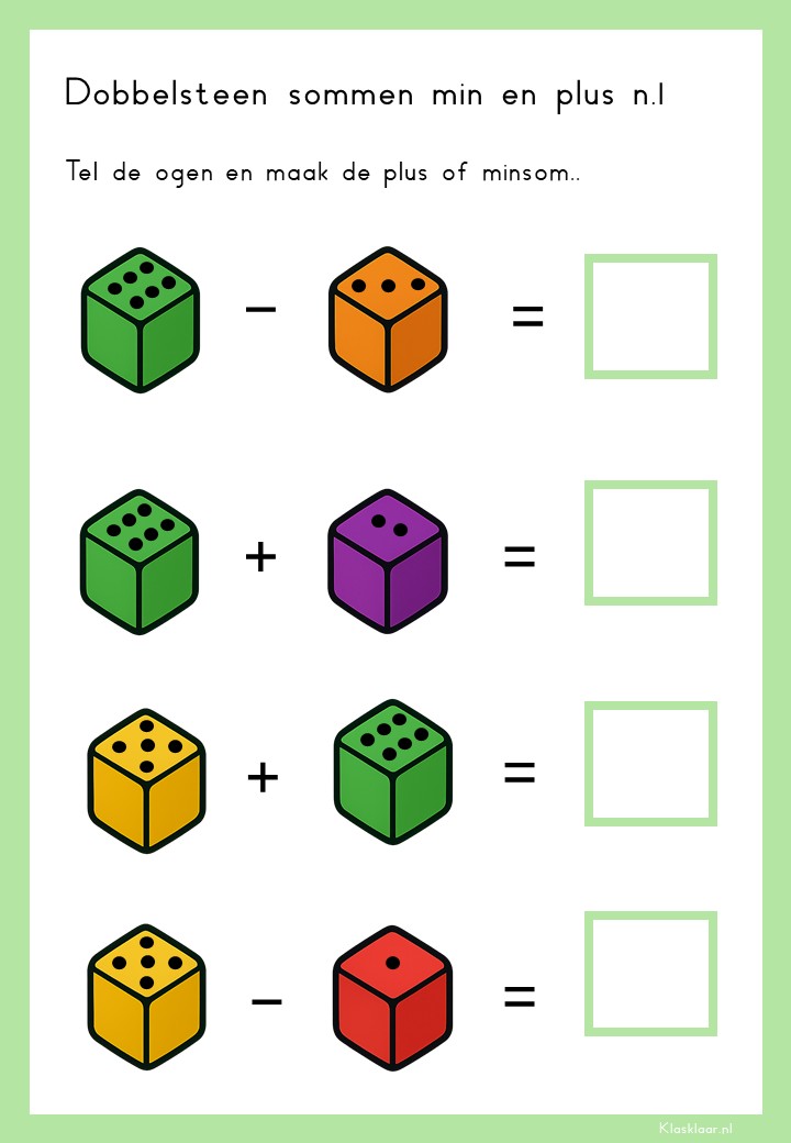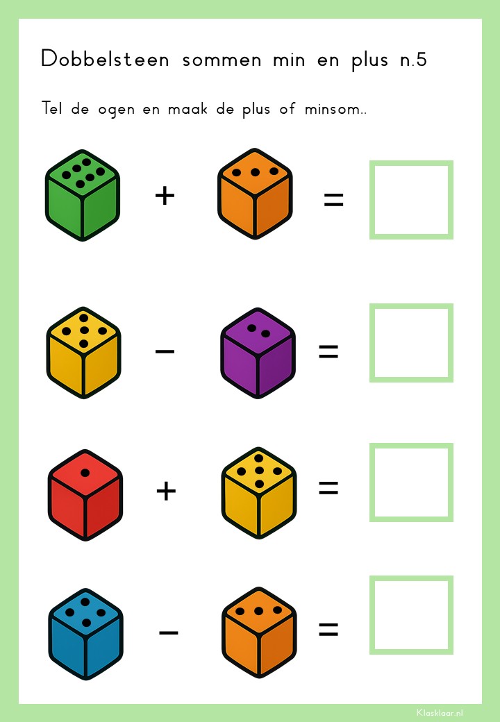 Dobbelsteen sommen zijn een leuke manier om optel- en aftreksommen te oefenen met kinderen uit groep 3. Elke worp met de dobbelsteen geeft een getal, zodat leerlingen spelenderwijs leren denken in hoeveelheden en de veranderingen zien. De opdrachten helpen bij het automatisch rekenen binnen 20 en versterken het inzicht in tellen, vergelijken en verkennen van verschillen. Perfect om in te zetten als warming-up, groepsoefening of thuis-extra.
