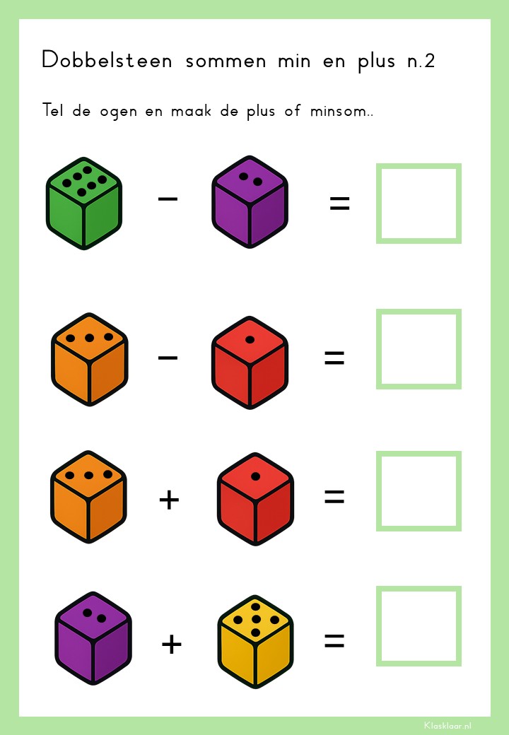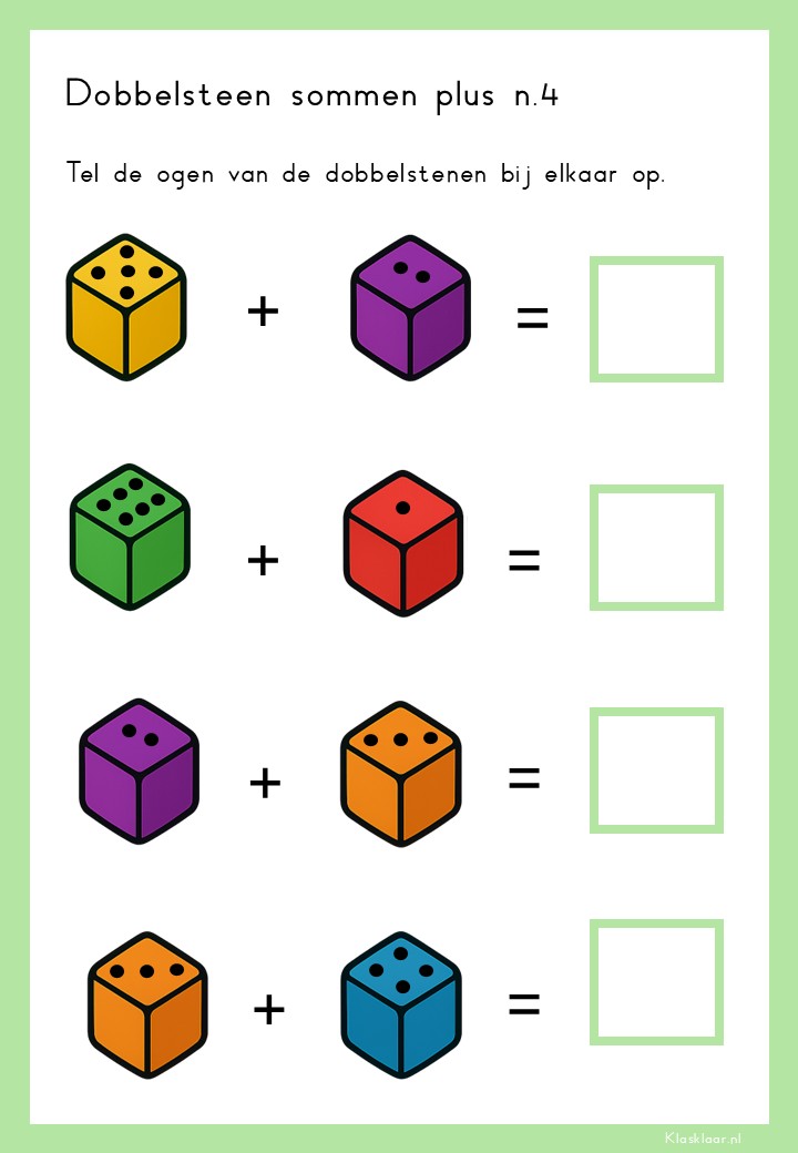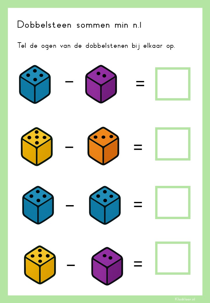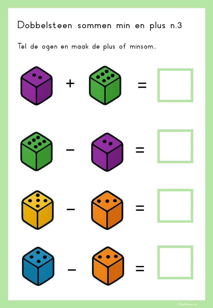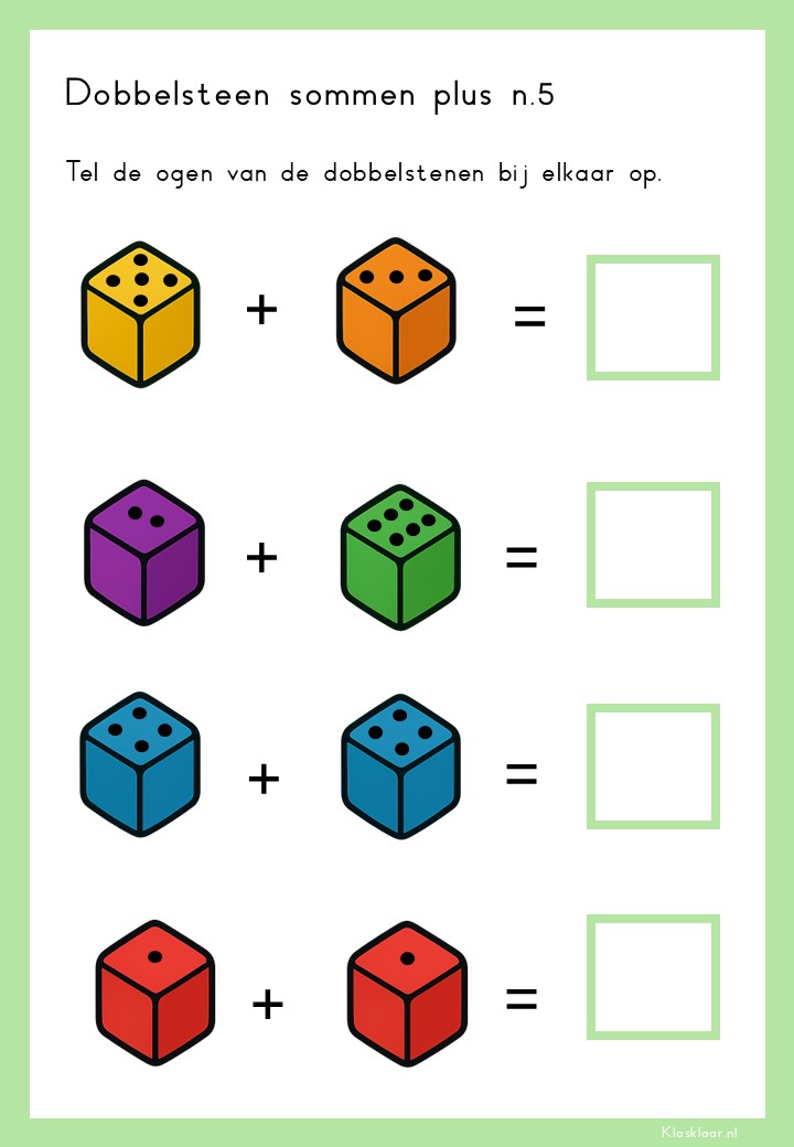 Dobbelsteen sommen zijn een leuke manier om optel- en aftreksommen te oefenen met kinderen uit groep 3. Elke worp met de dobbelsteen geeft een getal, zodat leerlingen spelenderwijs leren denken in hoeveelheden en de veranderingen zien. De opdrachten helpen bij het automatisch rekenen binnen 20 en versterken het inzicht in tellen, vergelijken en verkennen van verschillen. Perfect om in te zetten als warming-up, groepsoefening of thuis-extra.