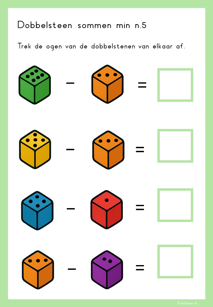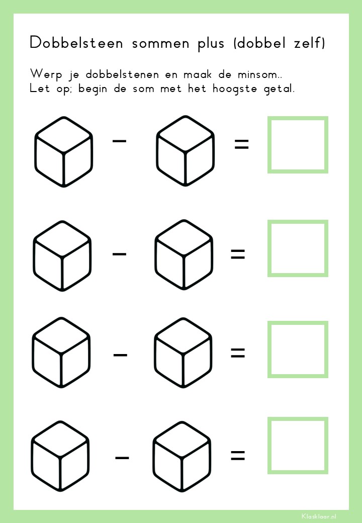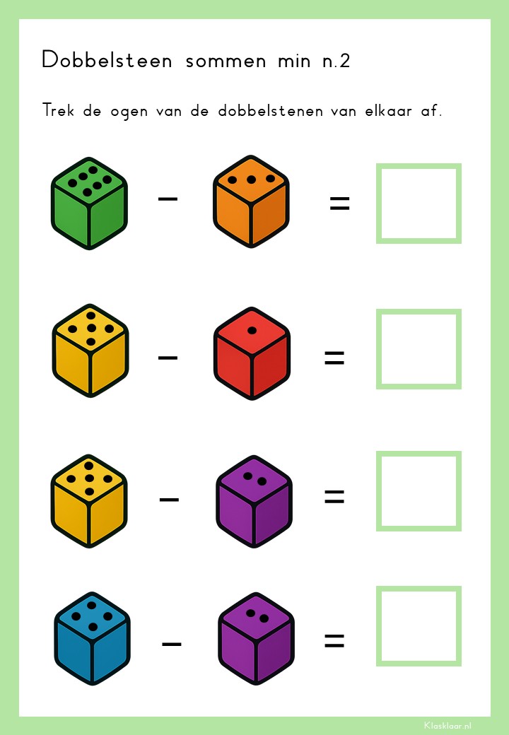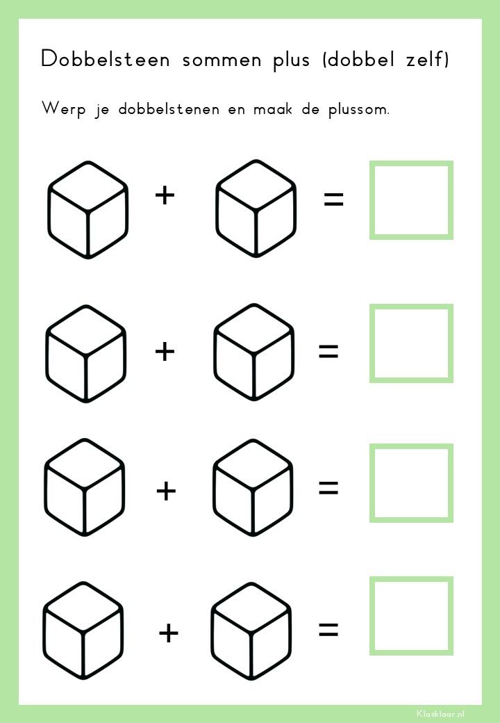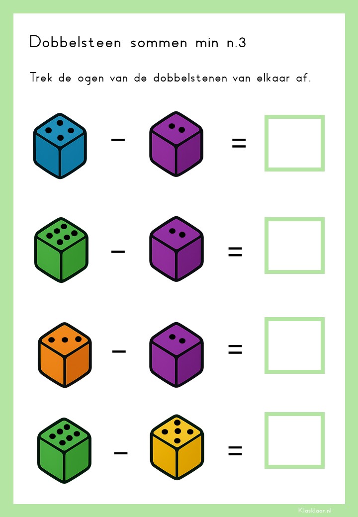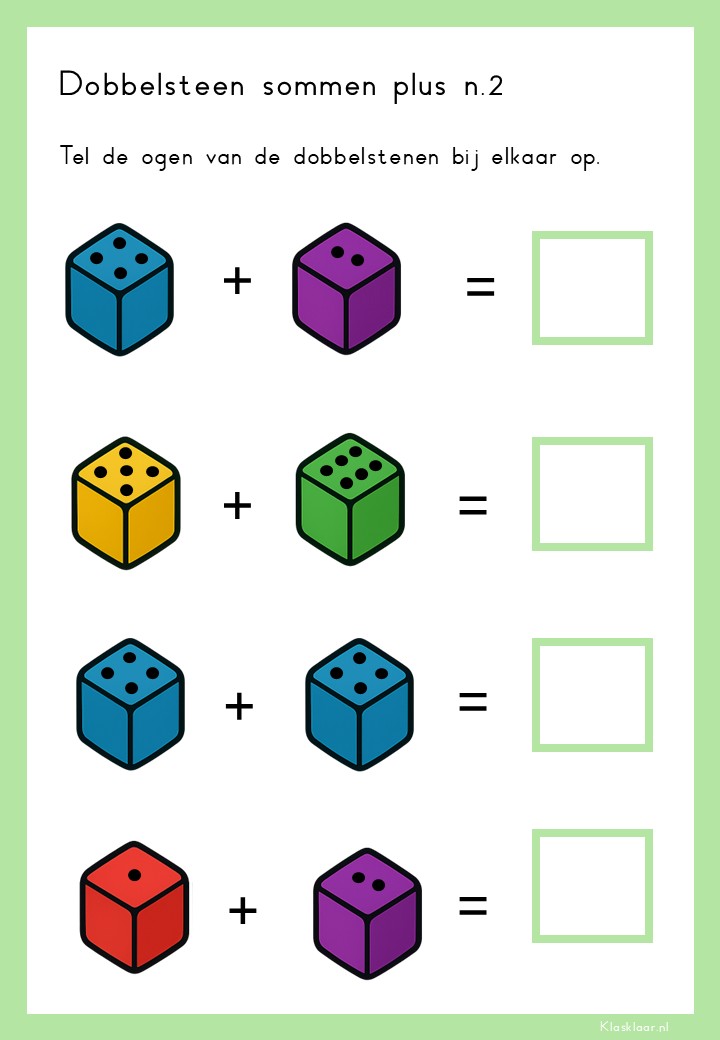Dobbelsteen sommen zijn een leuke manier om optel- en aftreksommen te oefenen met kinderen uit groep 3. Elke worp met de dobbelsteen geeft een getal, zodat leerlingen spelenderwijs leren denken in hoeveelheden en de veranderingen zien. De opdrachten helpen bij het automatisch rekenen binnen 20 en versterken het inzicht in tellen, vergelijken en verkennen van verschillen. Perfect om in te zetten als warming-up, groepsoefening of thuis-extra.