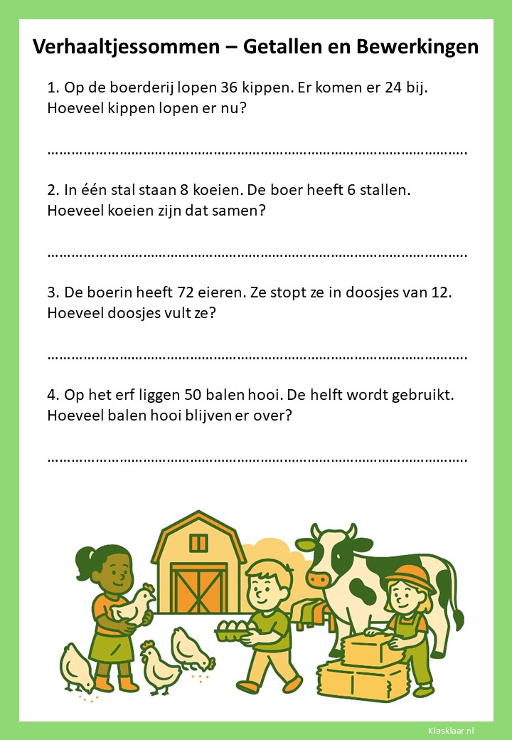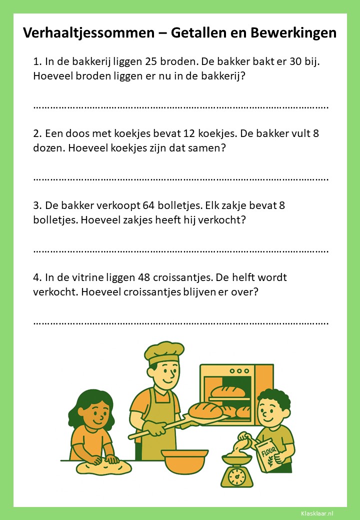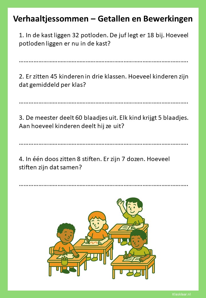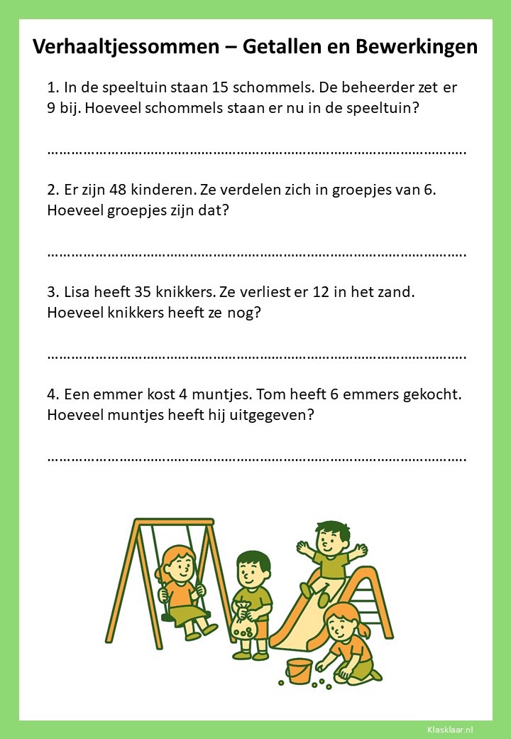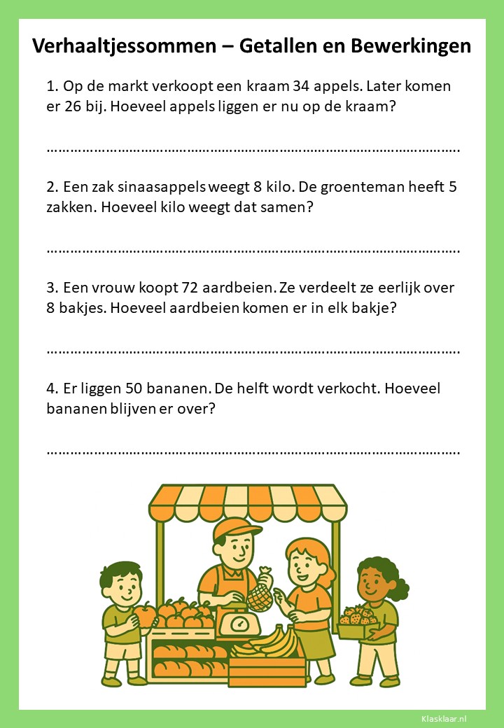 Met verhaaltjessommen leren kinderen in groep 4 rekenen in echte situaties. Ze oefenen met optellen, aftrekken en de eerste vermenigvuldigingen en delingen in contexten die herkenbaar zijn uit hun dagelijks leven. De werkbladen helpen leerlingen om goed te lezen, te begrijpen wat er gevraagd wordt en de juiste bewerking te kiezen. Zo versterken ze niet alleen hun rekenvaardigheid, maar ook hun taalbegrip en logisch denken.