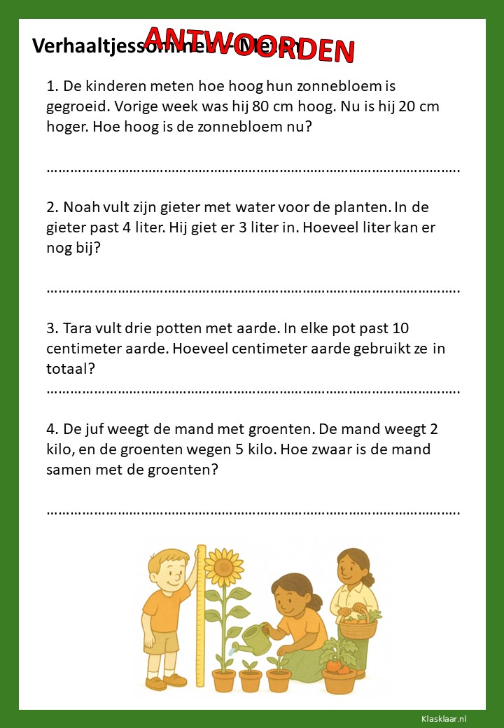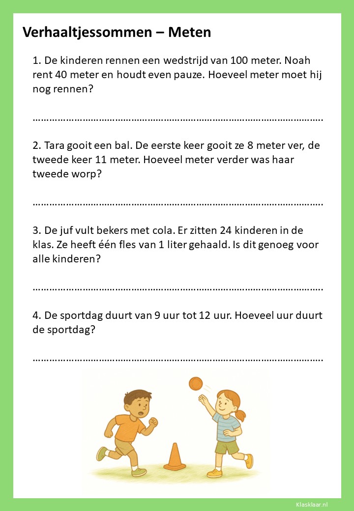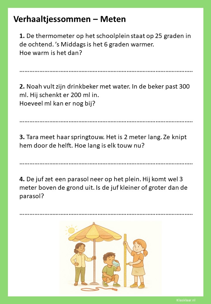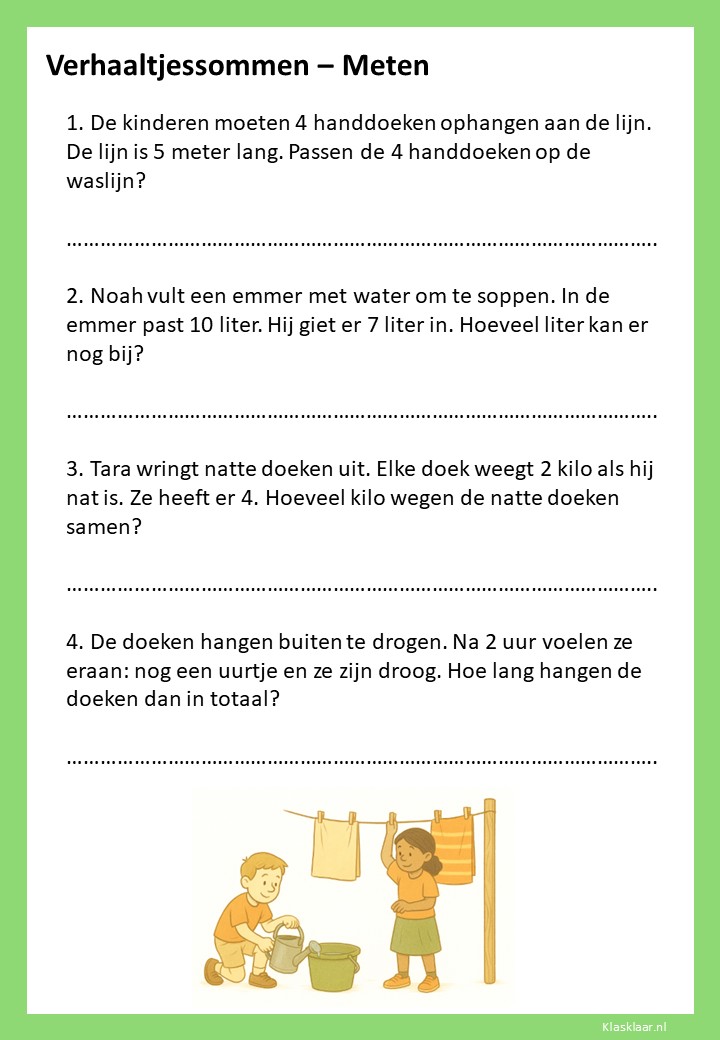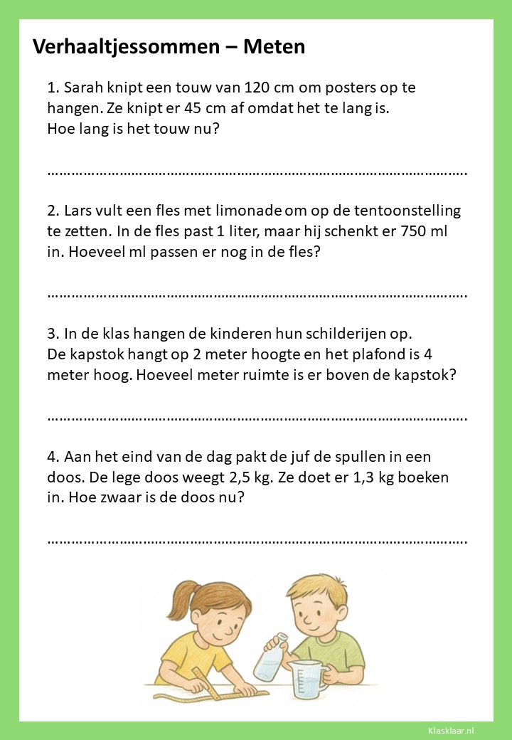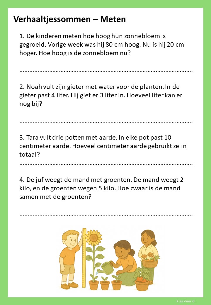 Bij deze verhaaltjessommen over meten oefenen kinderen met lengte, gewicht, inhoud en tijd in herkenbare situaties. Ze leren nadenken over welke maat of eenheid past bij een vraag en hoe je die gebruikt om een probleem op te lossen. De werkbladen combineren taal en rekenen, waardoor kinderen leren begrijpen wat een som écht betekent. Zo groeit hun inzicht in meten stap voor stap, met opdrachten die logisch én leuk zijn.