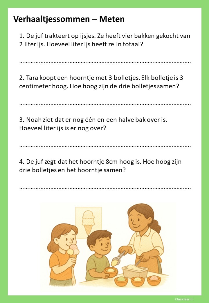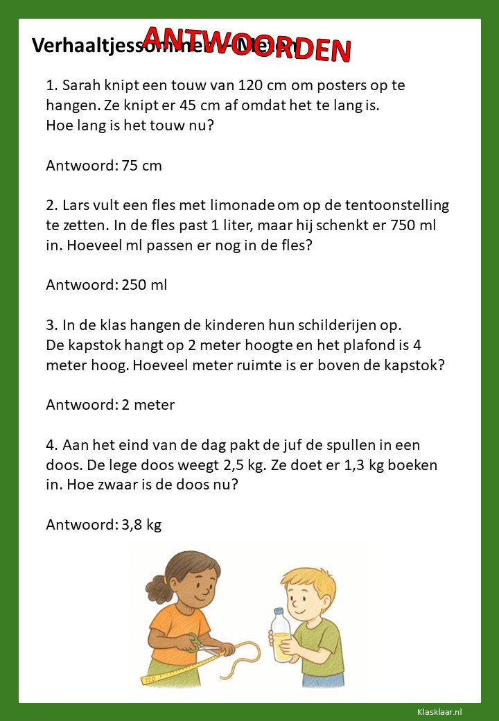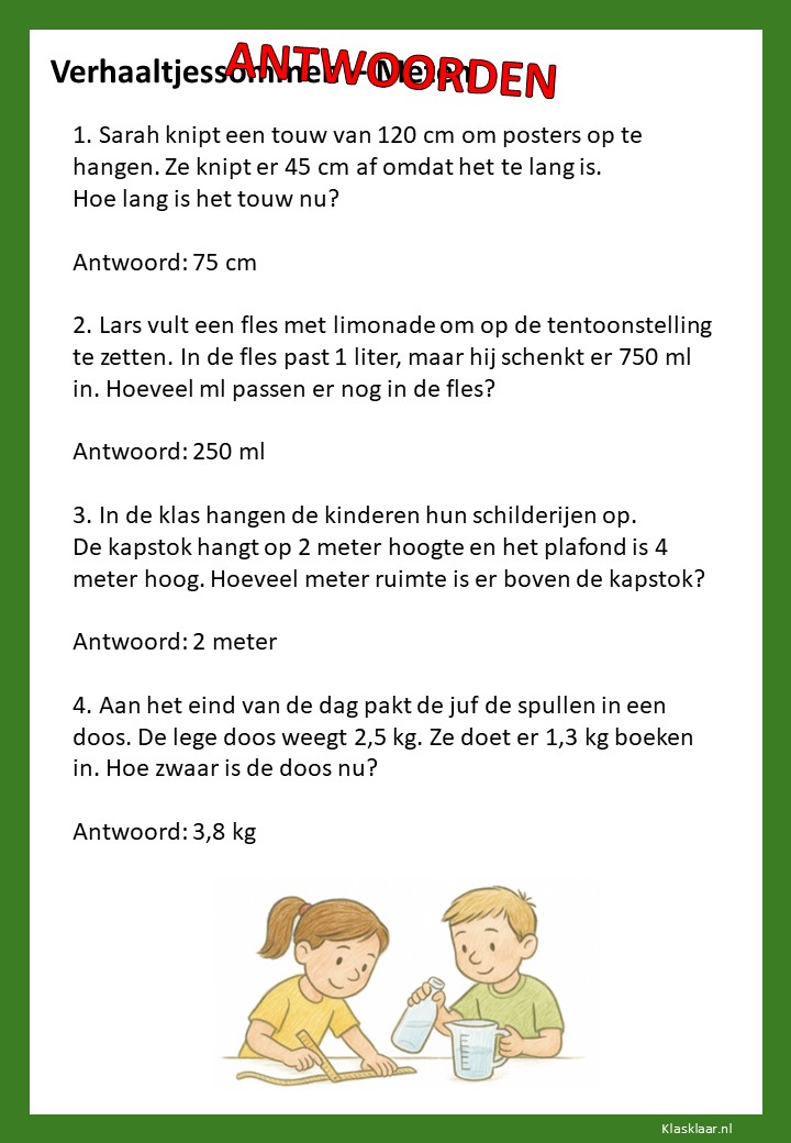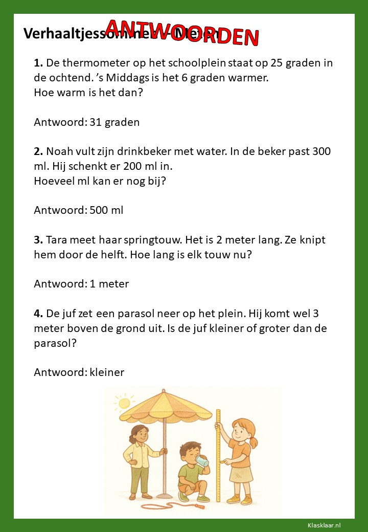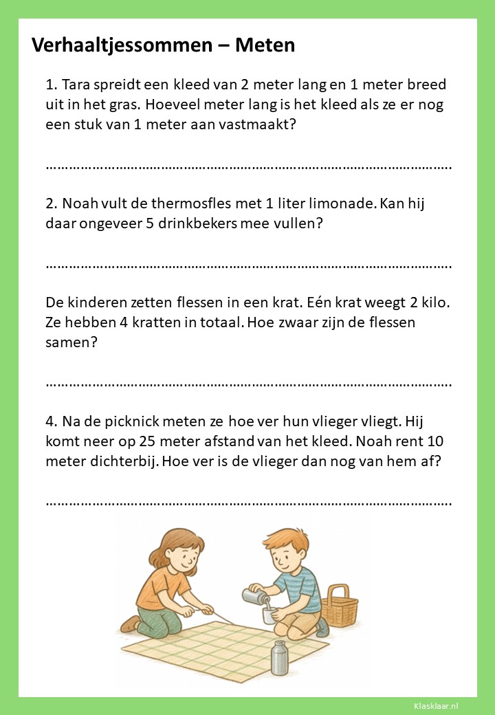 Bij deze verhaaltjessommen over meten oefenen kinderen met lengte, gewicht, inhoud en tijd in herkenbare situaties. Ze leren nadenken over welke maat of eenheid past bij een vraag en hoe je die gebruikt om een probleem op te lossen. De werkbladen combineren taal en rekenen, waardoor kinderen leren begrijpen wat een som écht betekent. Zo groeit hun inzicht in meten stap voor stap, met opdrachten die logisch én leuk zijn.