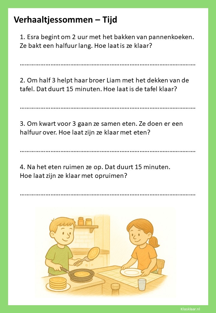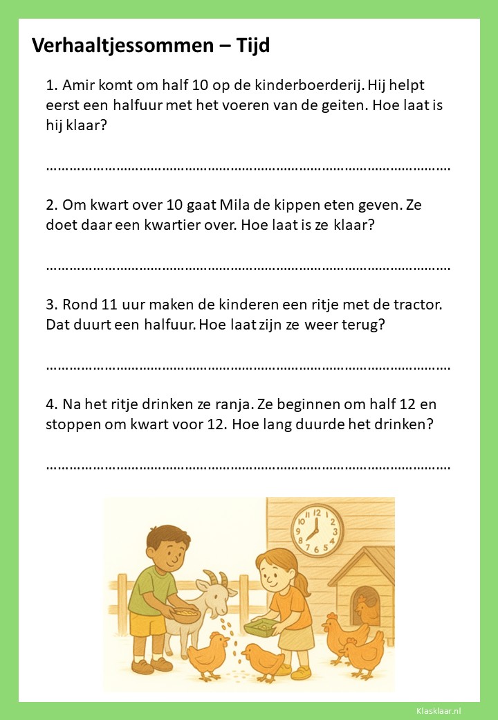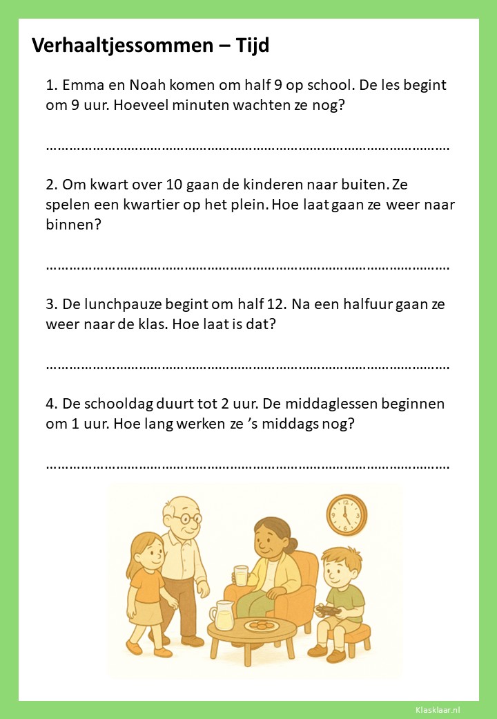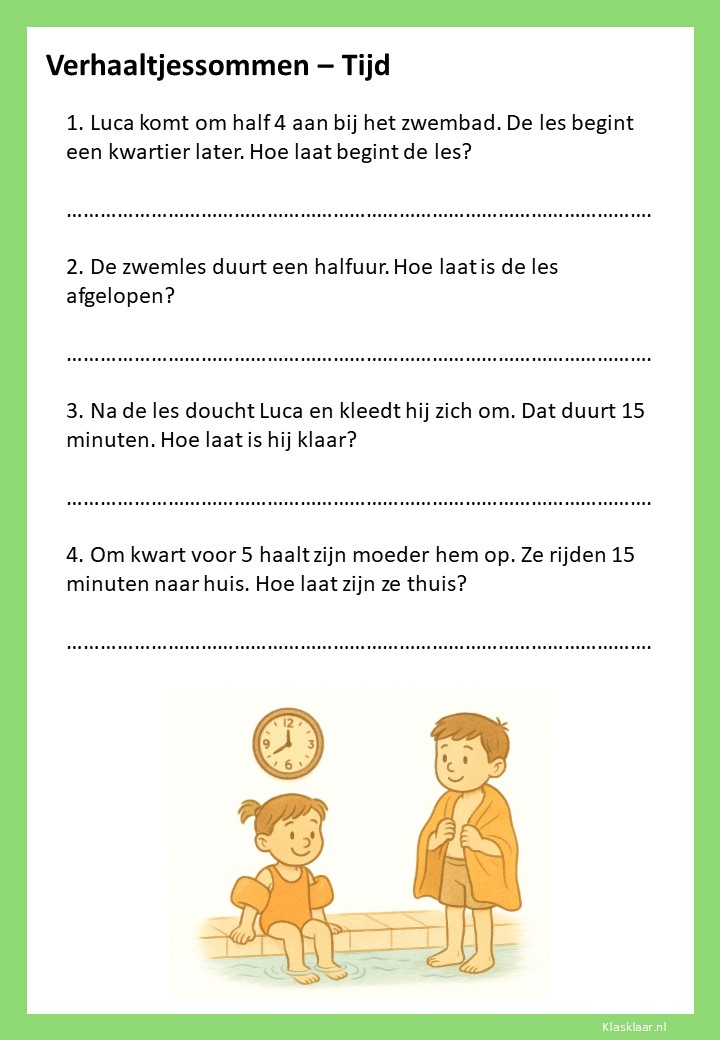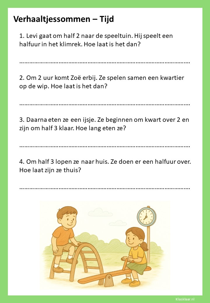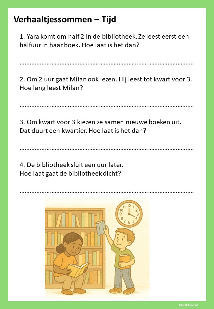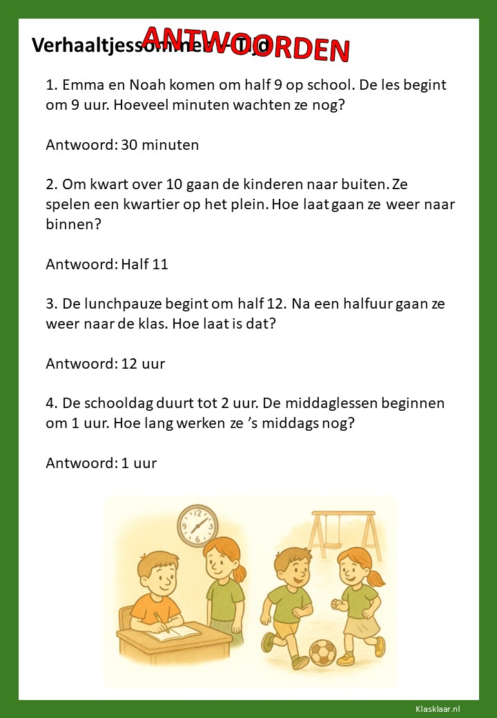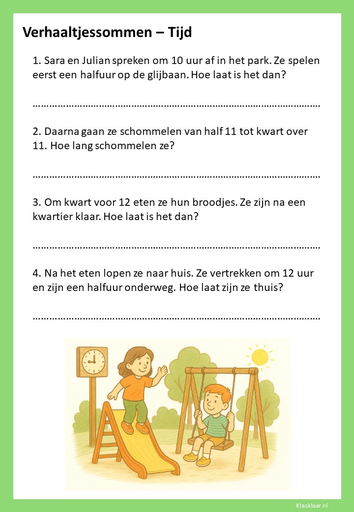 Met deze verhaaltjessommen over tijd leren kinderen klok kijken én rekenen met tijd in herkenbare situaties. Ze oefenen met hele uren, halve uren en kwartieren en leren tijdsverschillen berekenen. De opdrachten sluiten aan bij het dagelijks leven: van speeltijd tot reistijd en van etenstijd tot bedtijd. Zo ontdekken leerlingen stap voor stap hoe tijd werkt en hoe je er handig mee kunt rekenen.