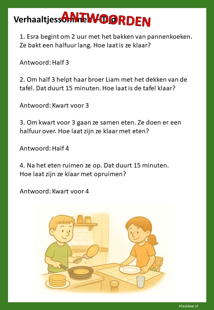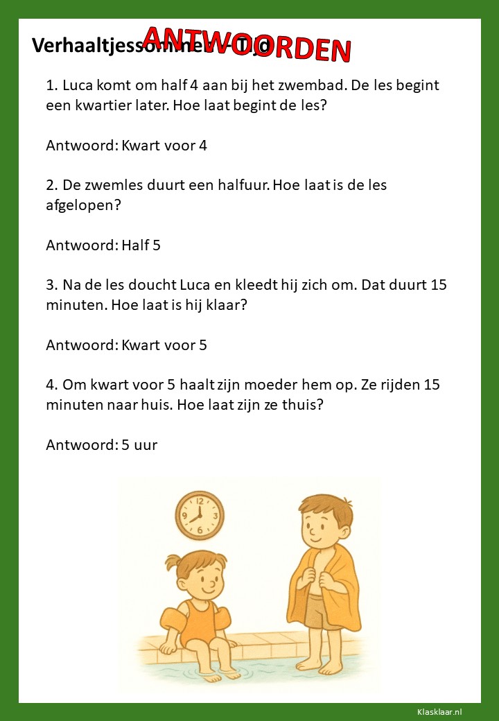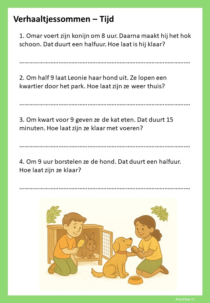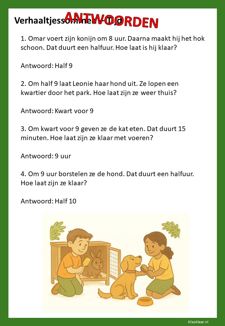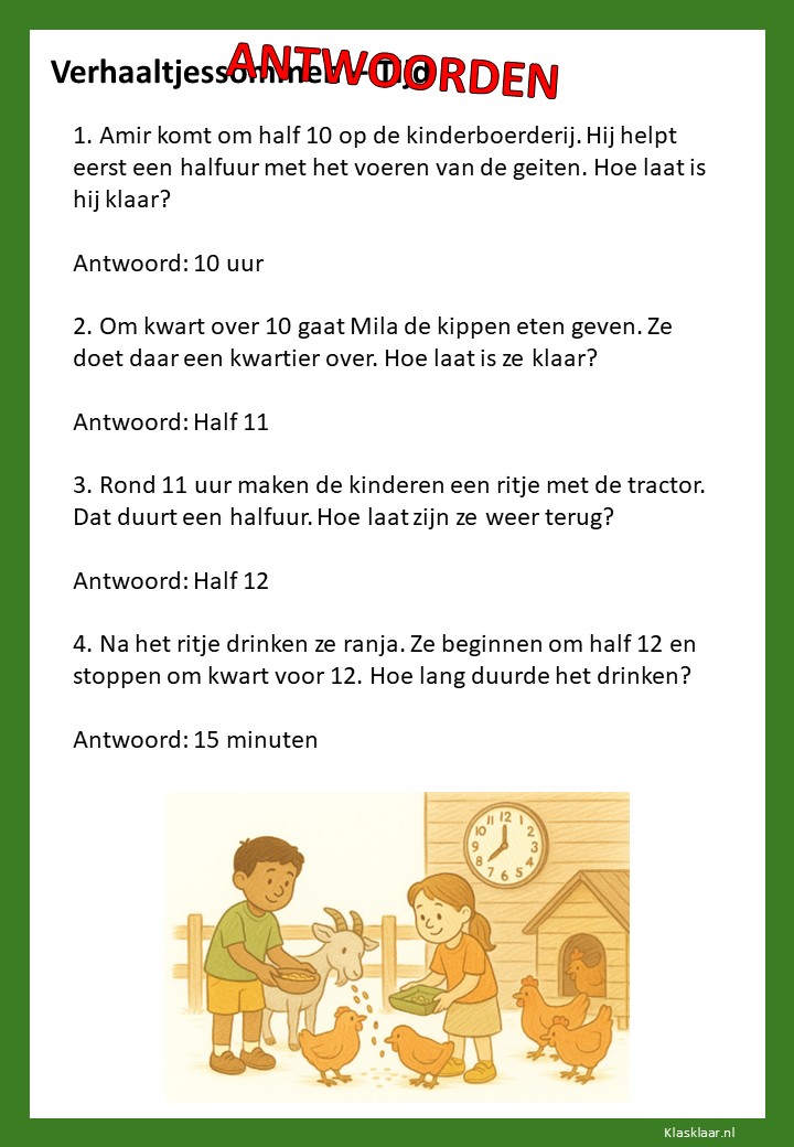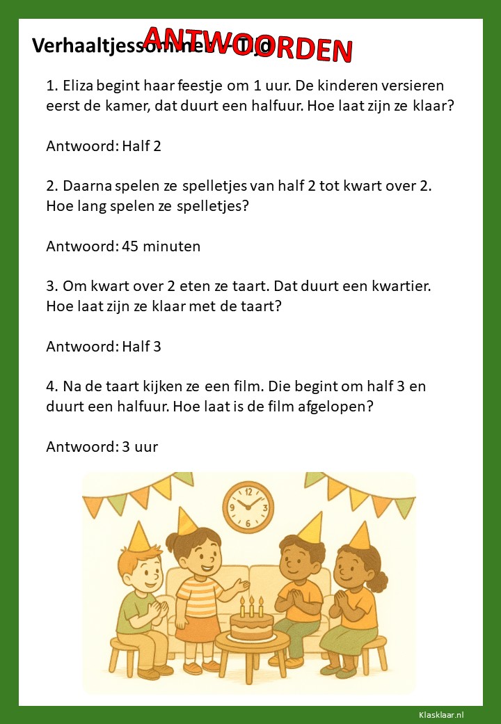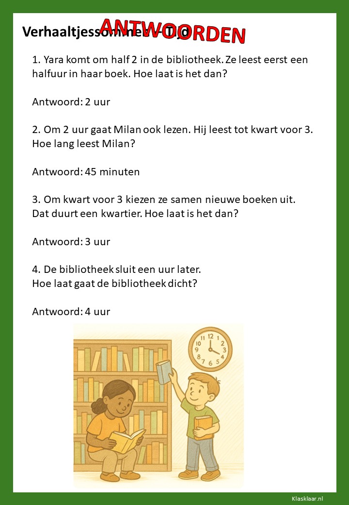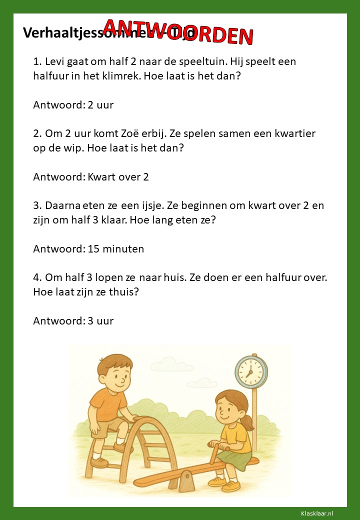 Met deze verhaaltjessommen over tijd leren kinderen klok kijken én rekenen met tijd in herkenbare situaties. Ze oefenen met hele uren, halve uren en kwartieren en leren tijdsverschillen berekenen. De opdrachten sluiten aan bij het dagelijks leven: van speeltijd tot reistijd en van etenstijd tot bedtijd. Zo ontdekken leerlingen stap voor stap hoe tijd werkt en hoe je er handig mee kunt rekenen.
