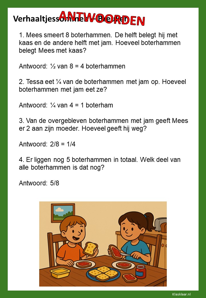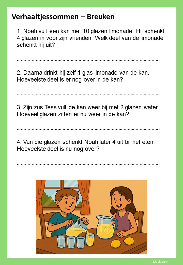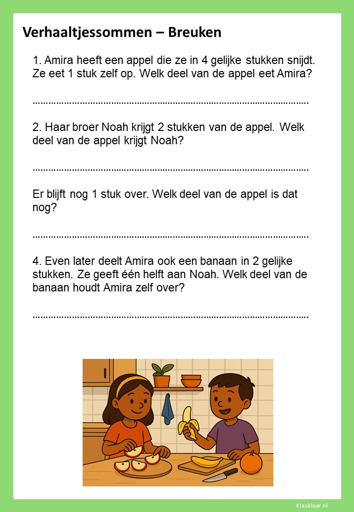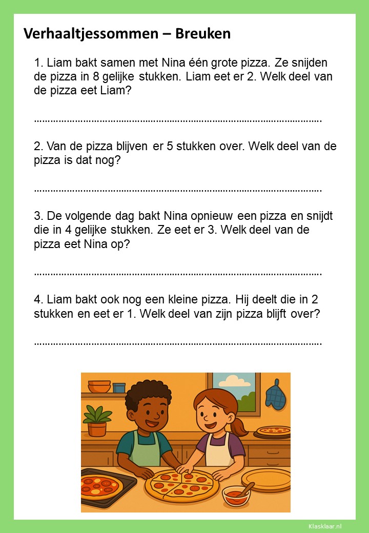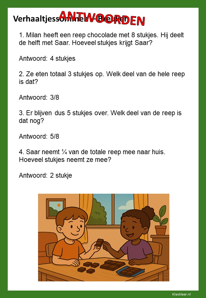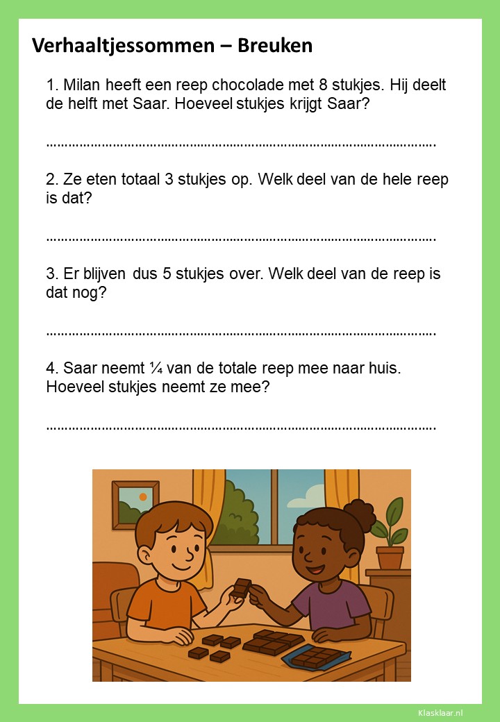Verhaaltjessommen over breuken helpen kinderen om breuken te begrijpen én toe te passen in echte situaties. Ze leren denken in delen van een geheel, vergelijken van hoeveelheden en redeneren over verhoudingen. De opdrachten maken breuken concreet en herkenbaar, van delen van een pizza tot het verdelen van een zak snoep. Zo ontwikkelen leerlingen inzicht, taal en logisch denkvermogen terwijl ze rekenen met plezier.