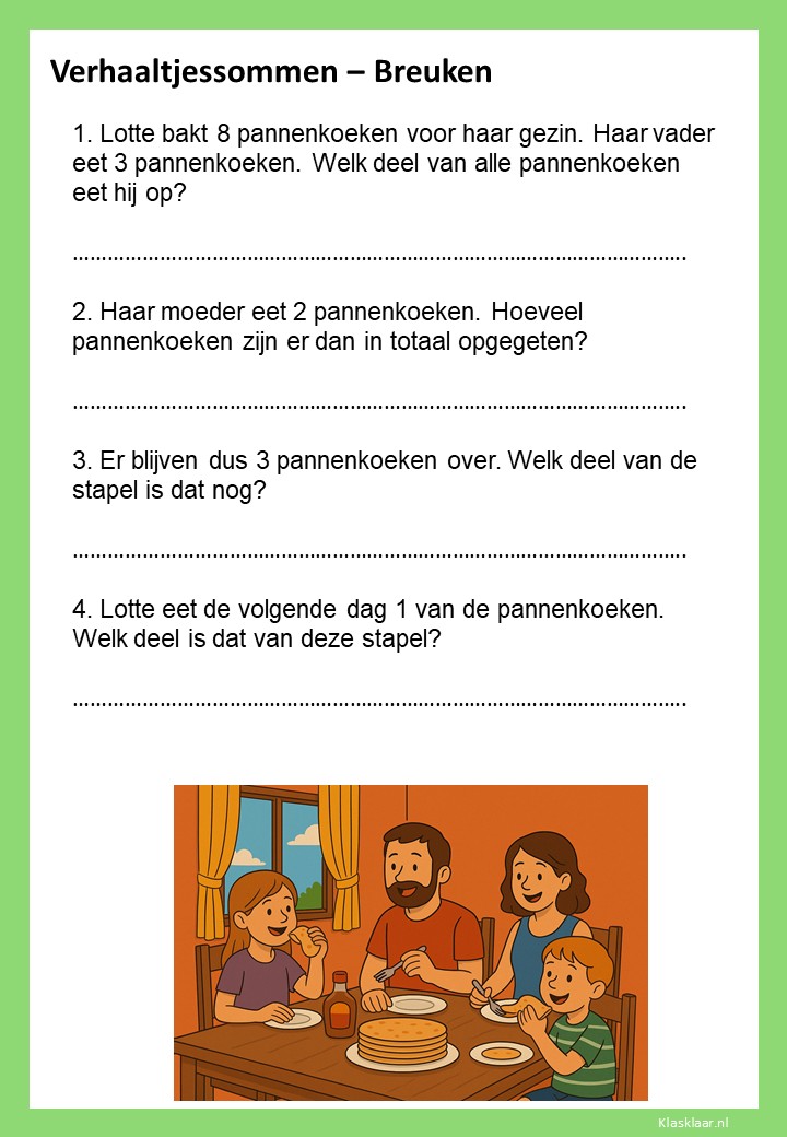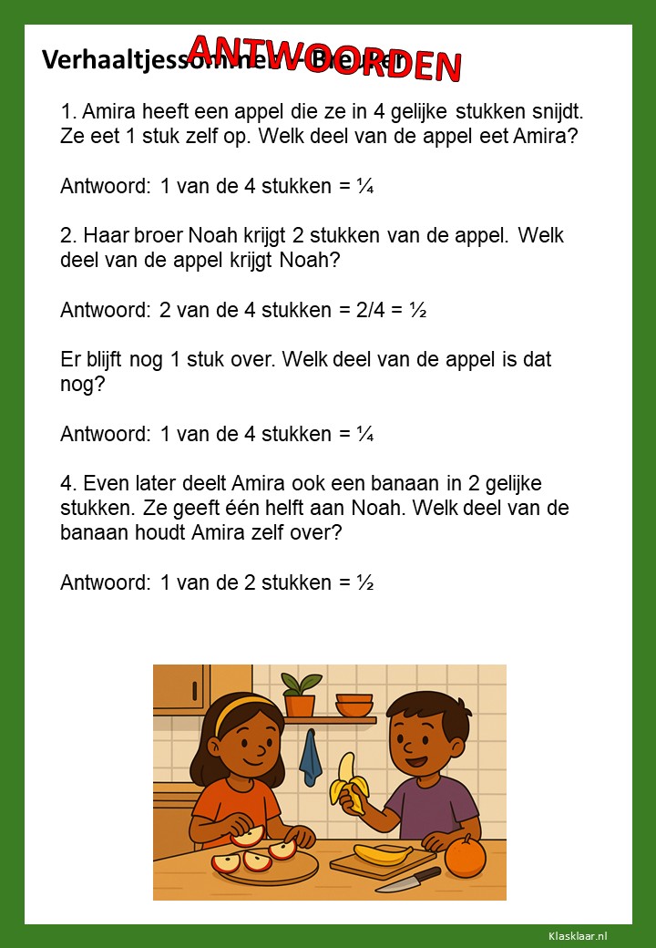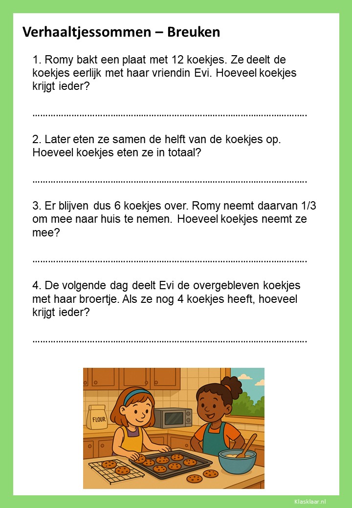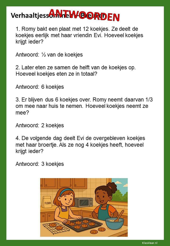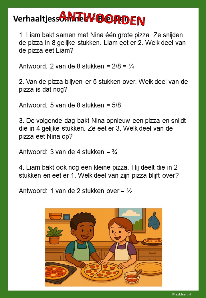 Verhaaltjessommen over breuken helpen kinderen om breuken te begrijpen én toe te passen in echte situaties. Ze leren denken in delen van een geheel, vergelijken van hoeveelheden en redeneren over verhoudingen. De opdrachten maken breuken concreet en herkenbaar, van delen van een pizza tot het verdelen van een zak snoep. Zo ontwikkelen leerlingen inzicht, taal en logisch denkvermogen terwijl ze rekenen met plezier.
