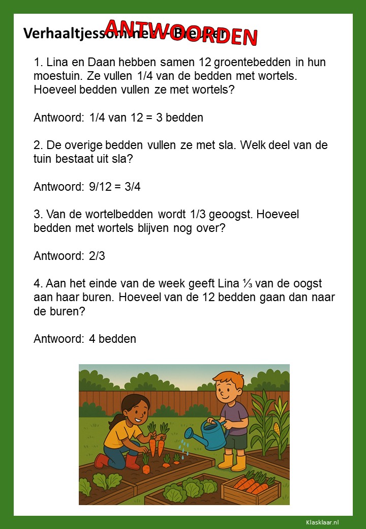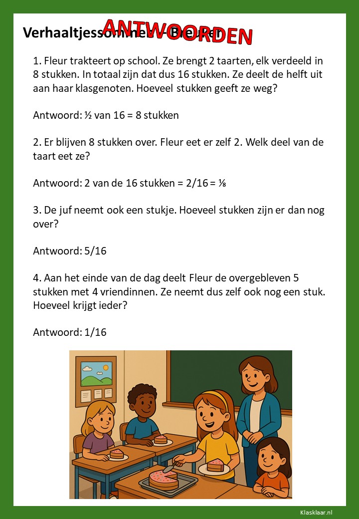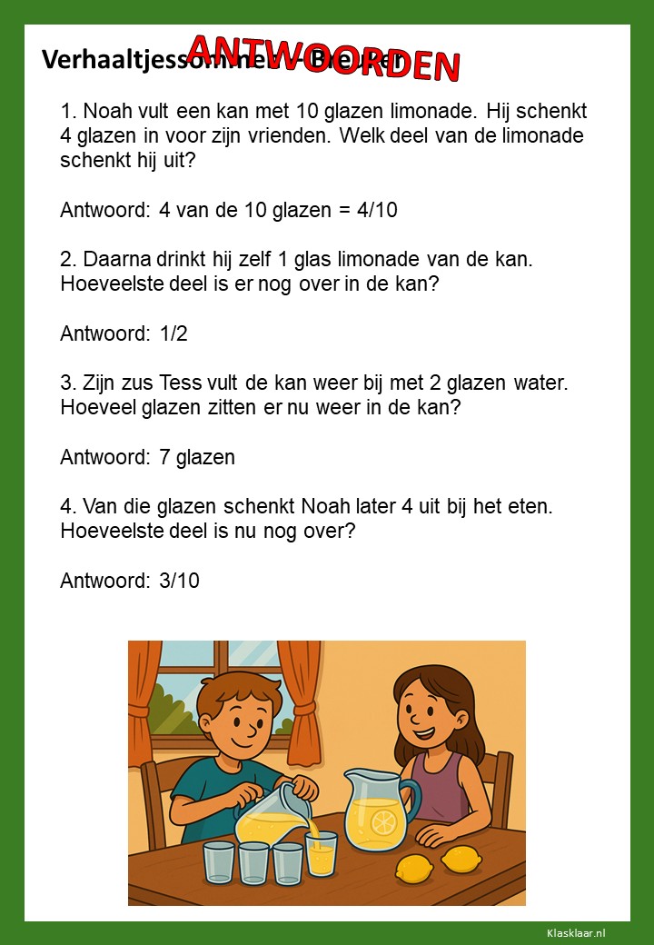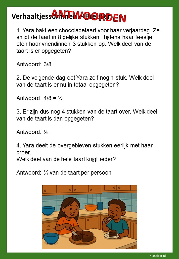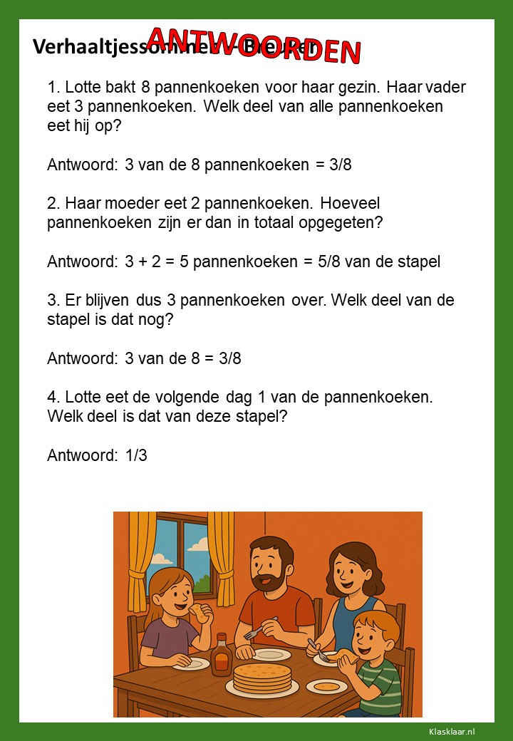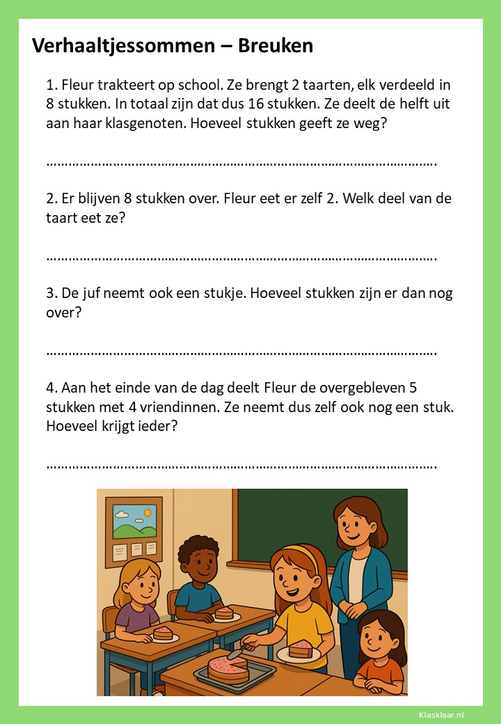 Verhaaltjessommen over breuken helpen kinderen om breuken te begrijpen én toe te passen in echte situaties. Ze leren denken in delen van een geheel, vergelijken van hoeveelheden en redeneren over verhoudingen. De opdrachten maken breuken concreet en herkenbaar, van delen van een pizza tot het verdelen van een zak snoep. Zo ontwikkelen leerlingen inzicht, taal en logisch denkvermogen terwijl ze rekenen met plezier.