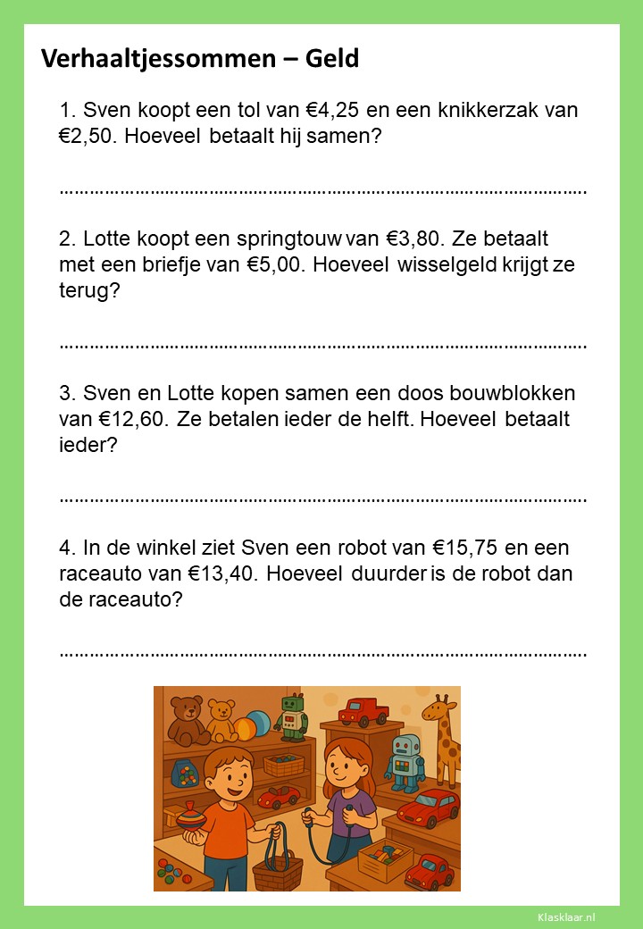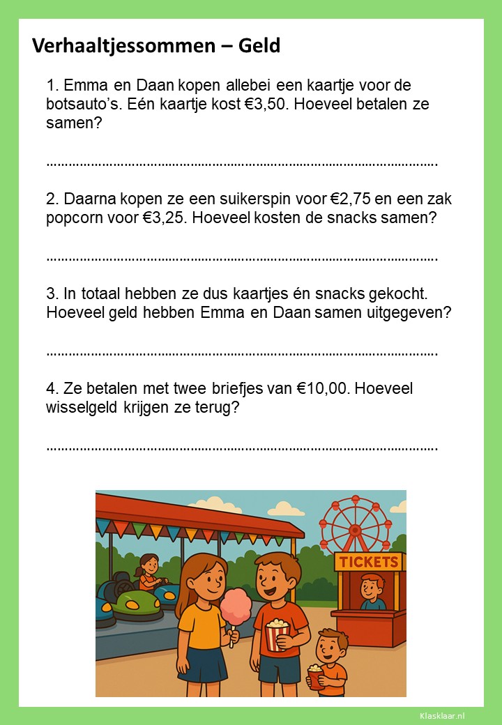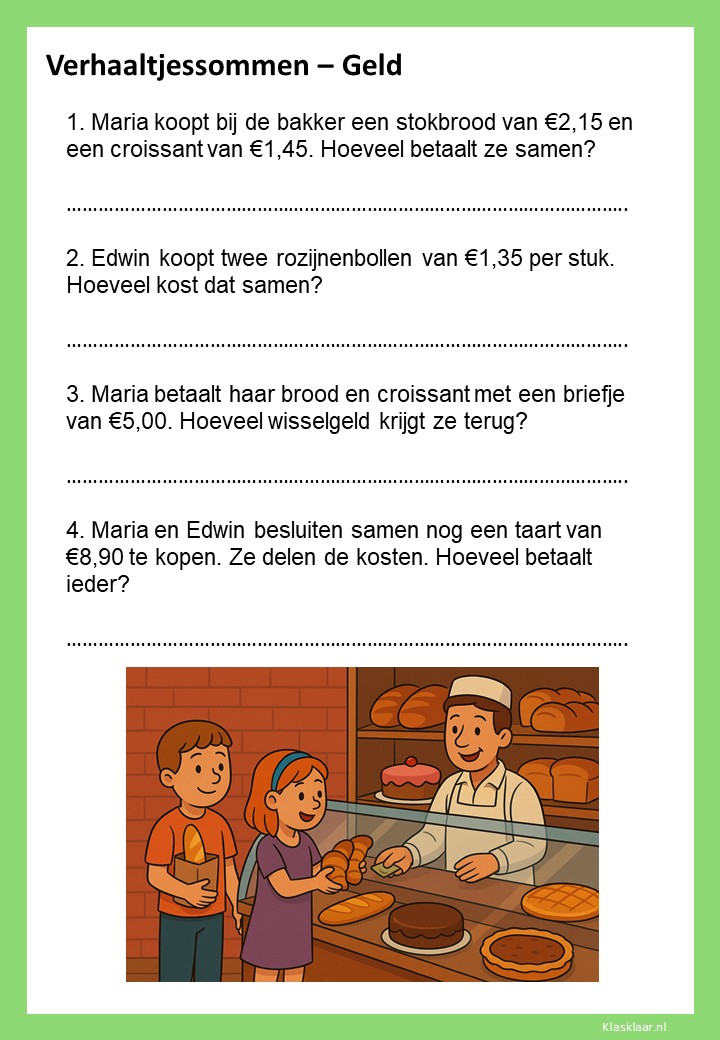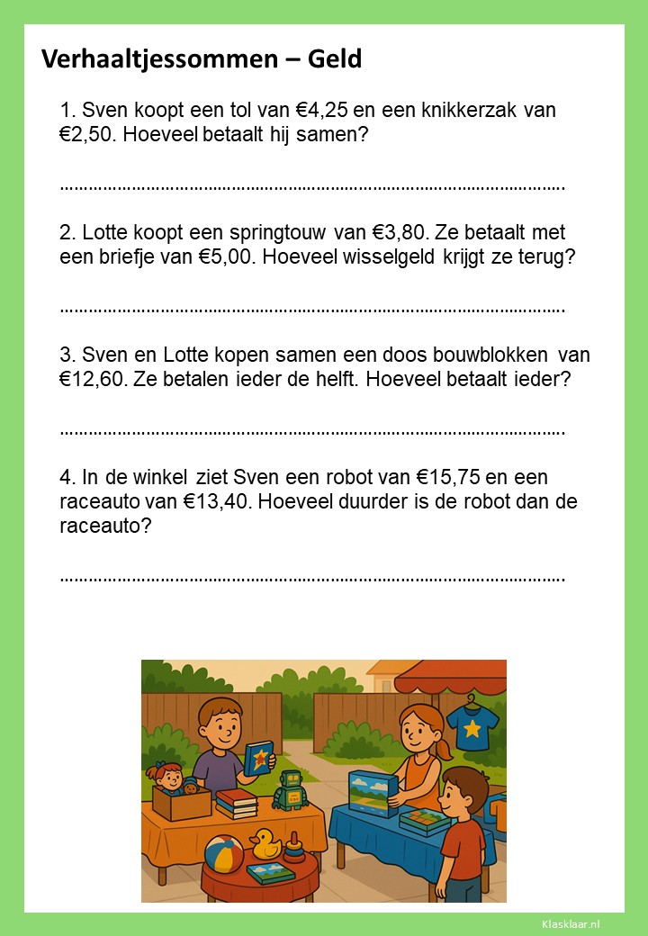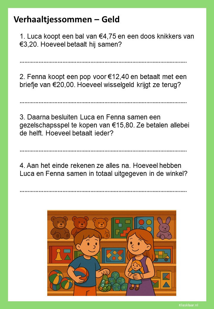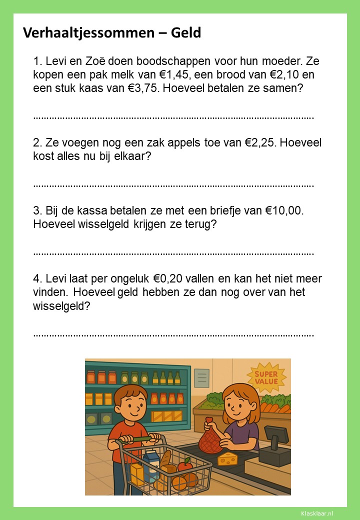 Met deze werkbladen over geld oefenen kinderen het rekenen met euro’s en centen. Ze leren bedragen lezen, optellen, aftrekken en wisselgeld berekenen in herkenbare situaties. De opdrachten sluiten aan bij dagelijkse ervaringen zoals winkelen, sparen en prijzen vergelijken. Zo wordt rekenen met geld concreet, praktisch en leuk – perfect voor in de klas of om thuis te oefenen.