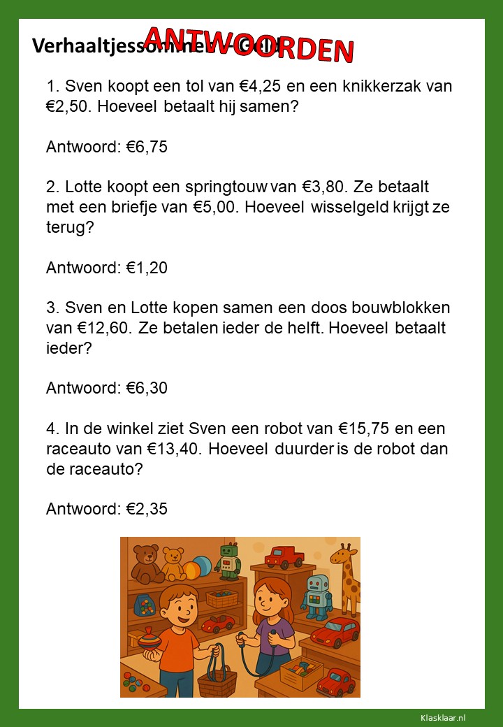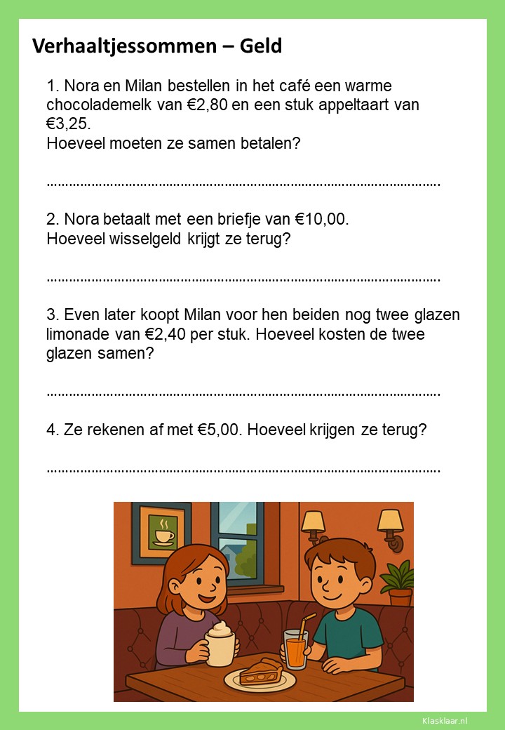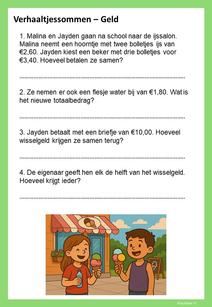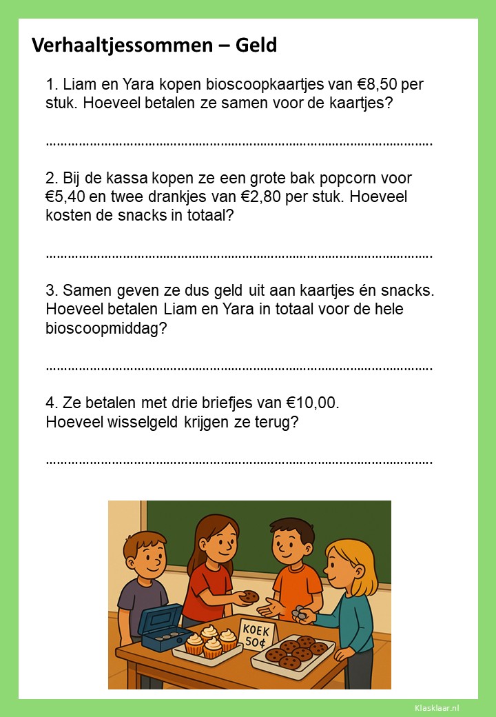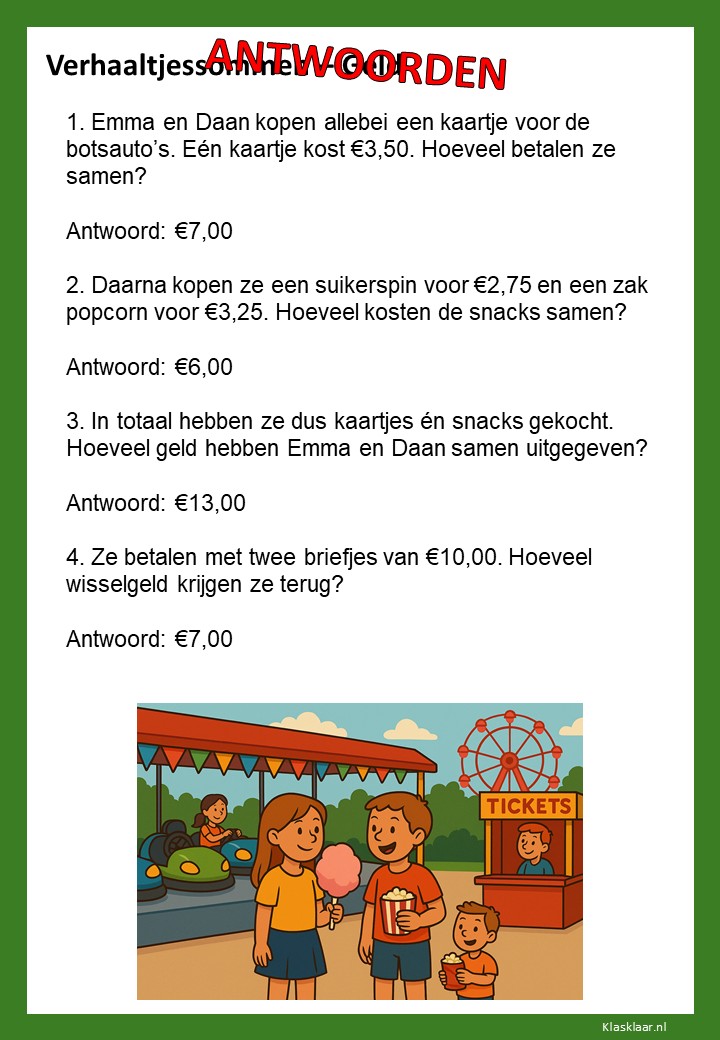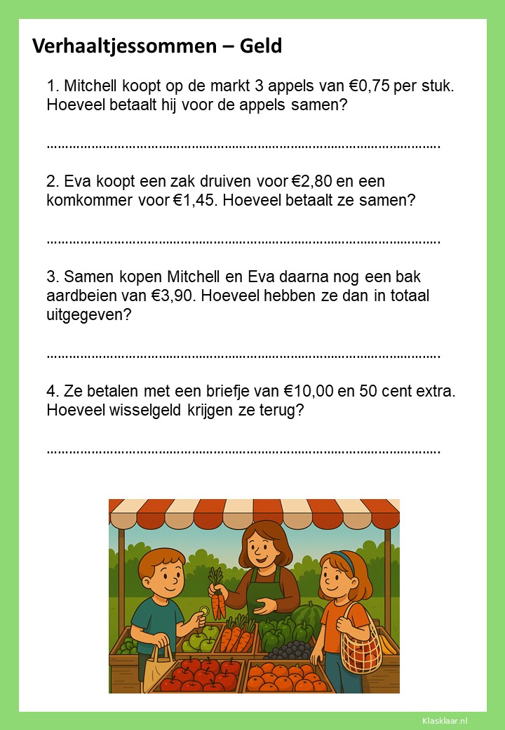Met deze werkbladen over geld oefenen kinderen het rekenen met euro’s en centen. Ze leren bedragen lezen, optellen, aftrekken en wisselgeld berekenen in herkenbare situaties. De opdrachten sluiten aan bij dagelijkse ervaringen zoals winkelen, sparen en prijzen vergelijken. Zo wordt rekenen met geld concreet, praktisch en leuk – perfect voor in de klas of om thuis te oefenen.