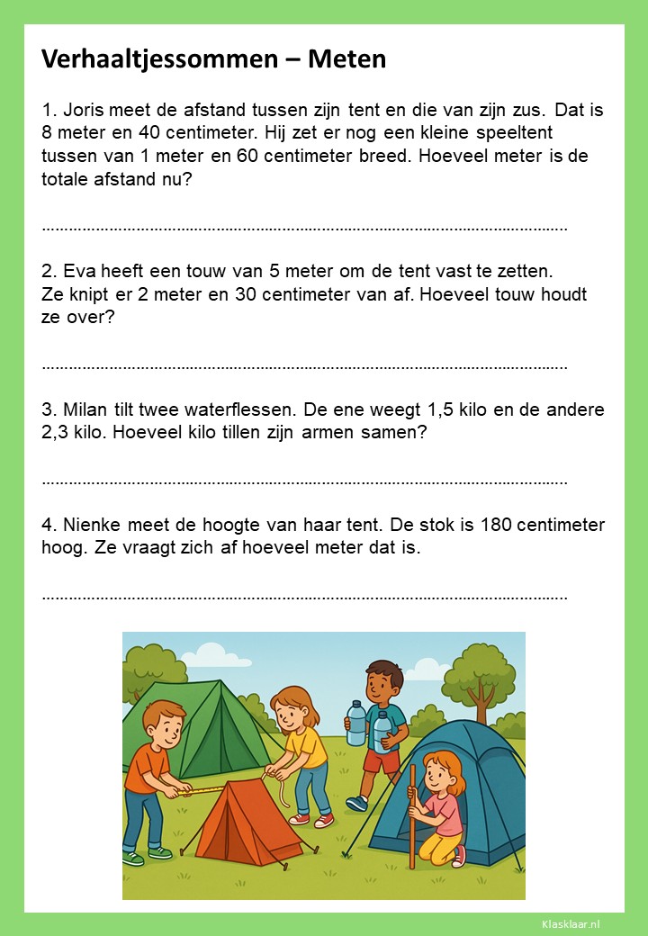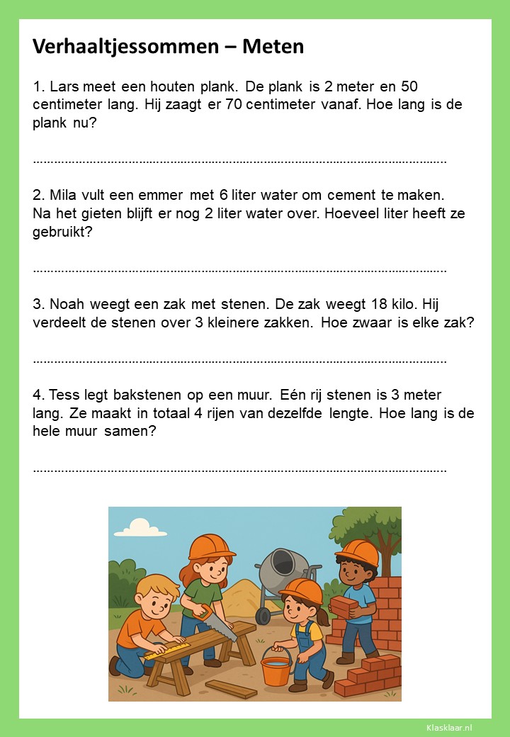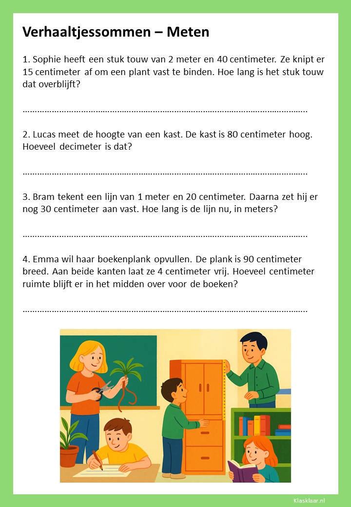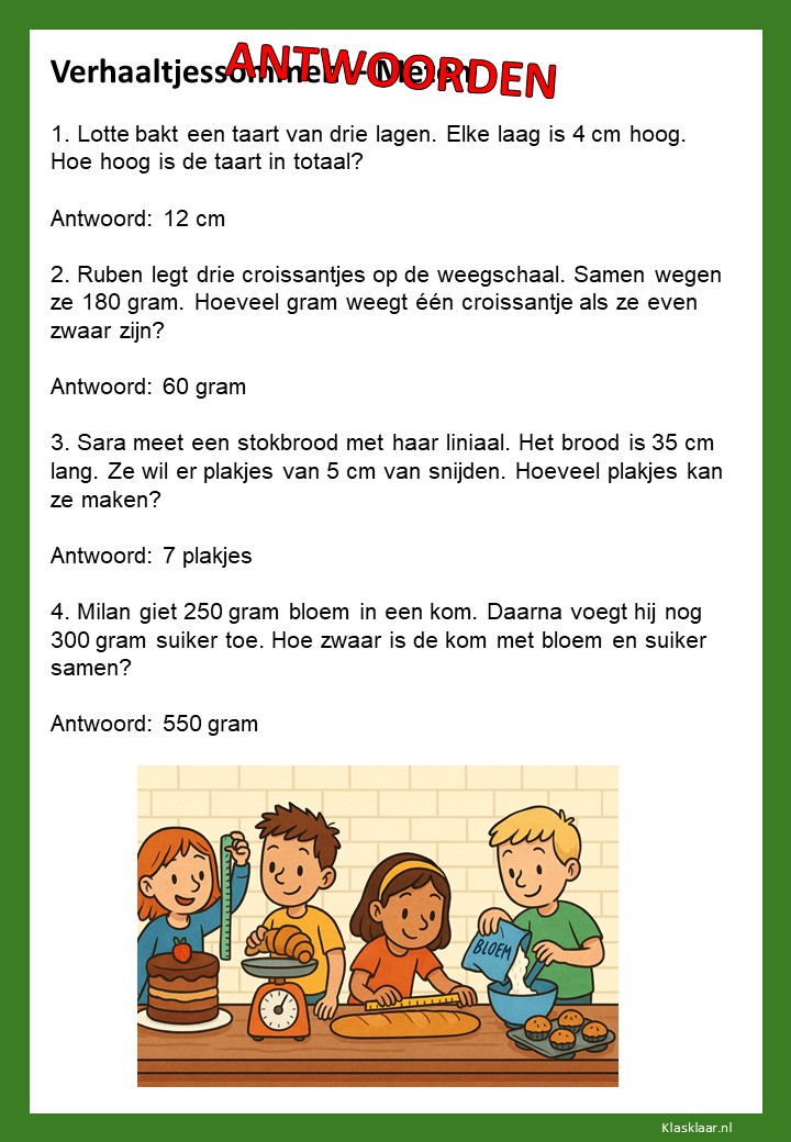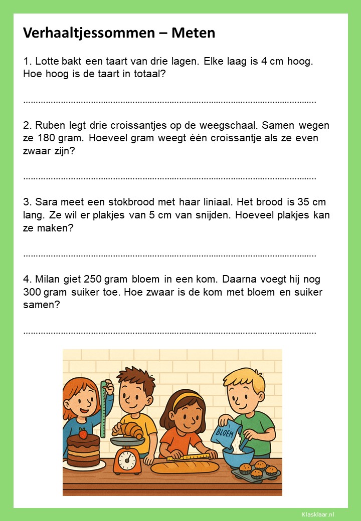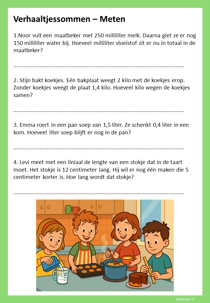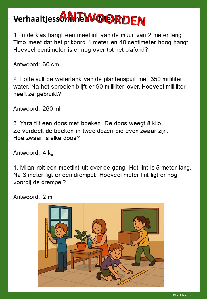 Verhaaltjessommen over meten maken rekenen concreet en betekenisvol. Kinderen passen hun kennis over lengte, gewicht, inhoud, tijd en temperatuur toe in herkenbare situaties. Ze leren lezen, redeneren en de juiste eenheid of bewerking kiezen om tot een oplossing te komen. De opdrachten helpen leerlingen om logisch te denken en verbanden te leggen tussen rekenen en de wereld om hen heen.