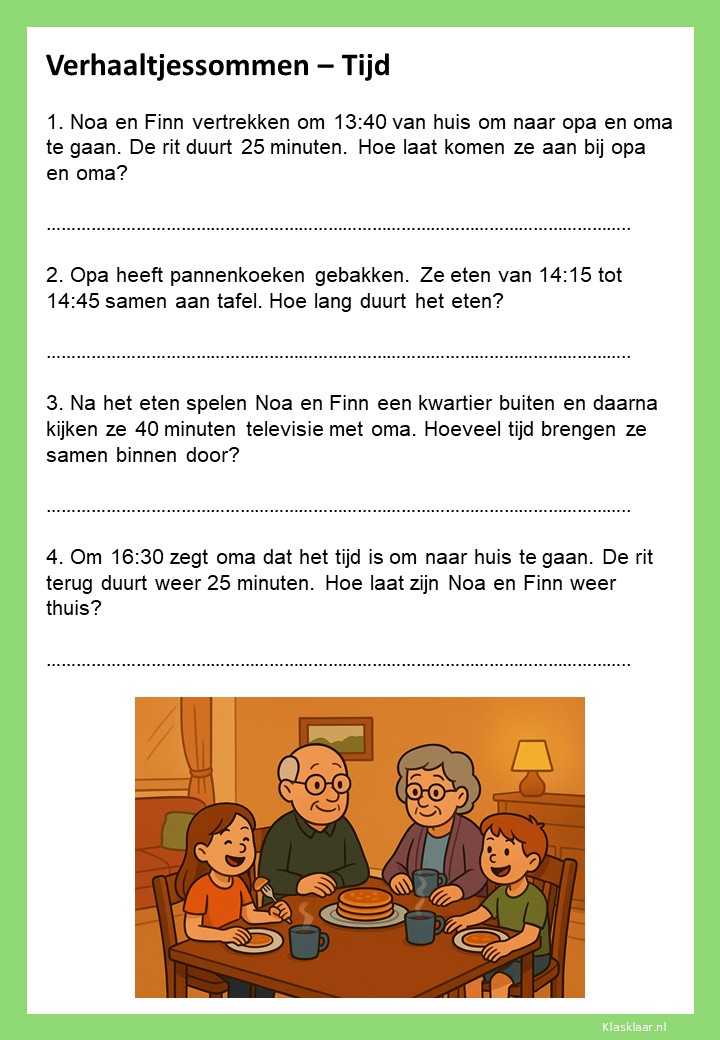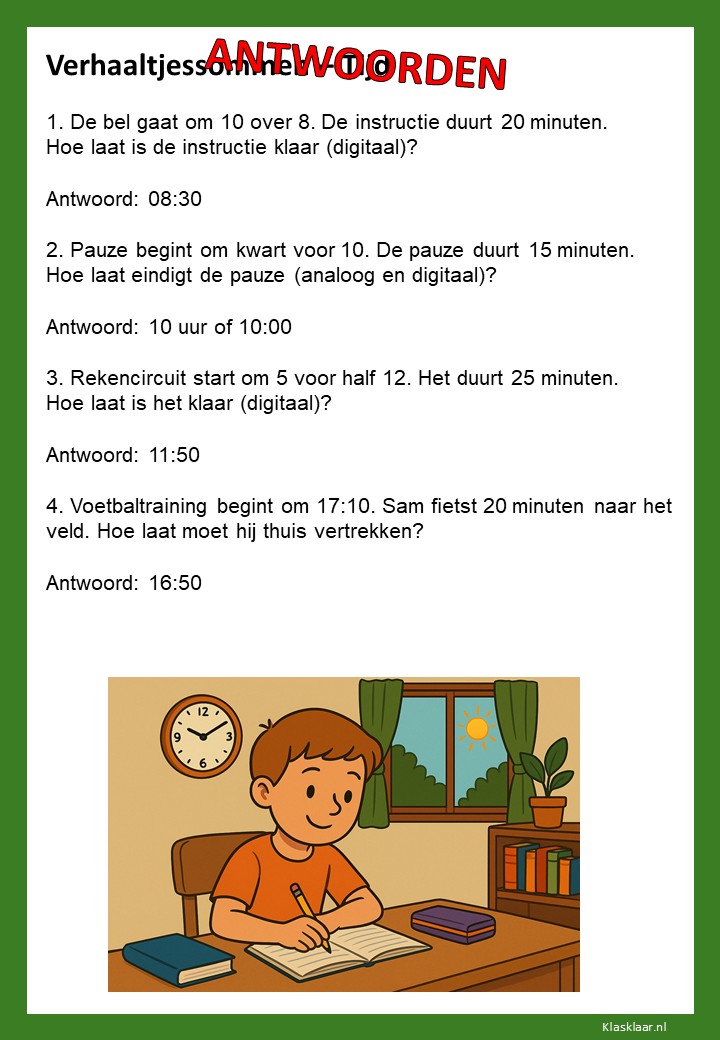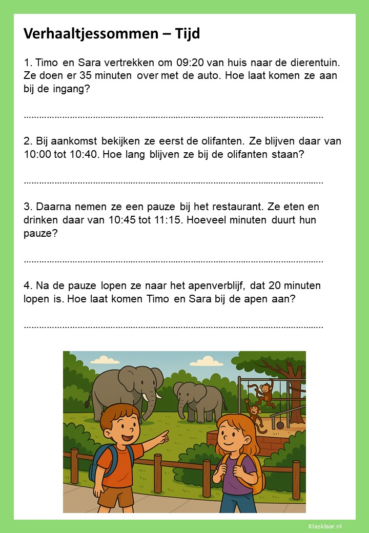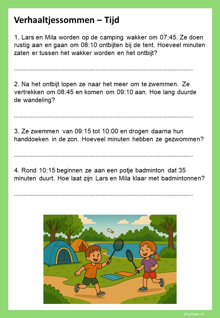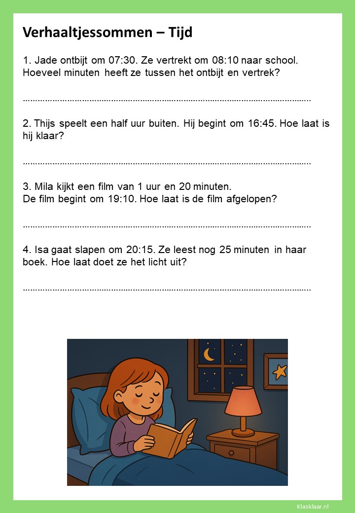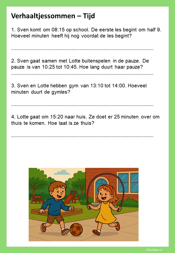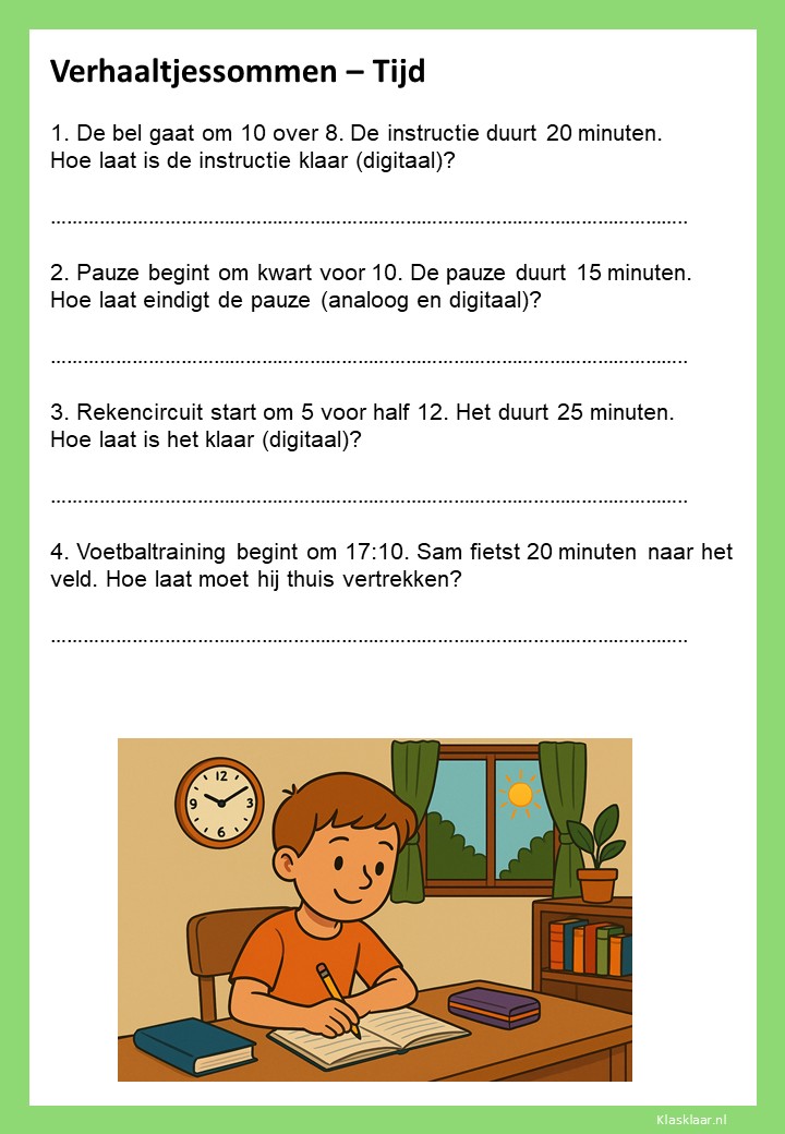 Verhaaltjessommen over tijd helpen kinderen om klok kijken en tijdsbesef toe te passen in echte situaties. Ze leren nadenken over begin- en eindtijden, tijdsverschillen en de duur van activiteiten. De opdrachten sluiten aan bij herkenbare voorbeelden uit het dagelijks leven, zoals schooltijden, reizen of sporten. Zo oefenen leerlingen niet alleen met rekenen, maar ook met plannen en logisch nadenken over tijd.