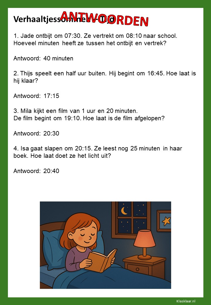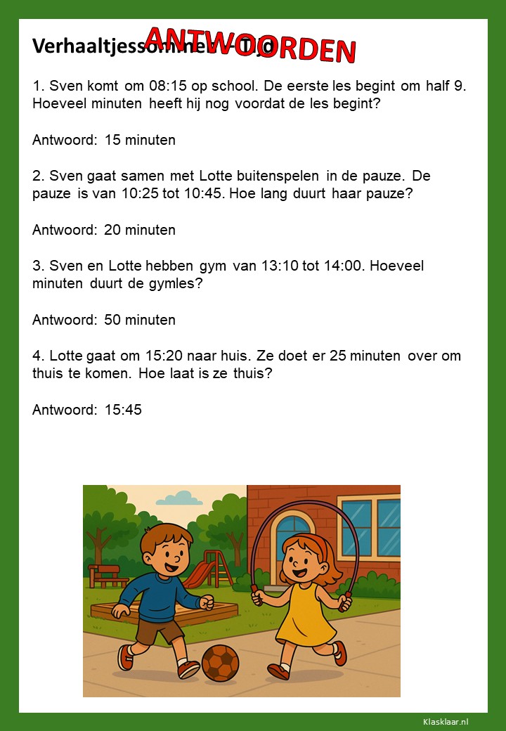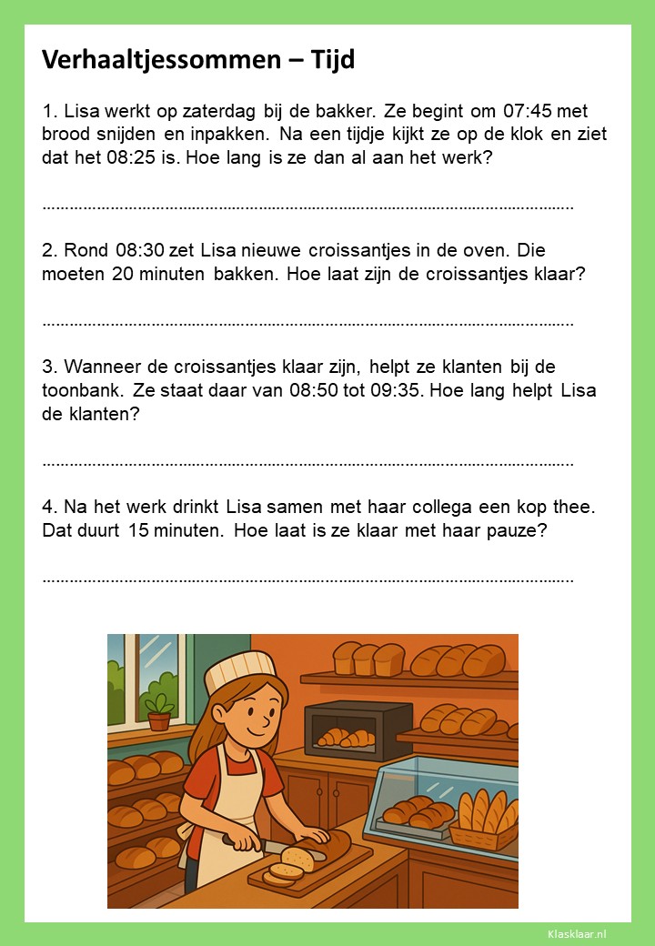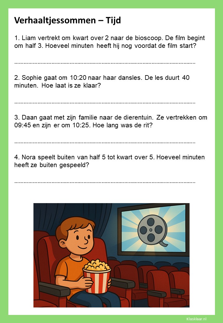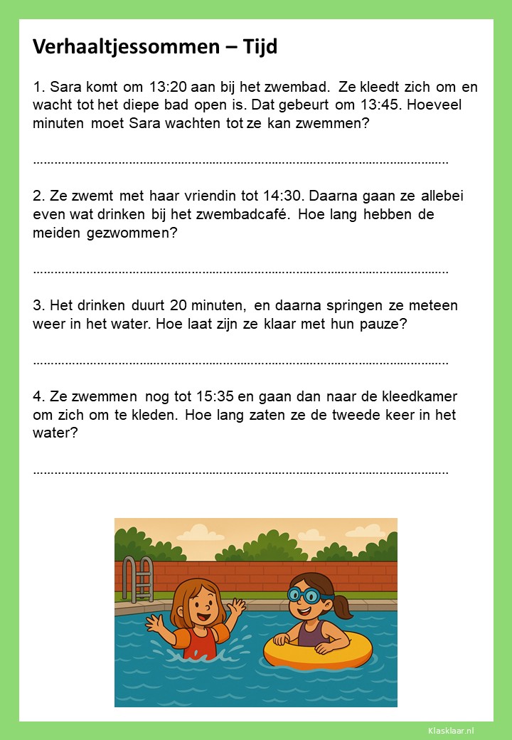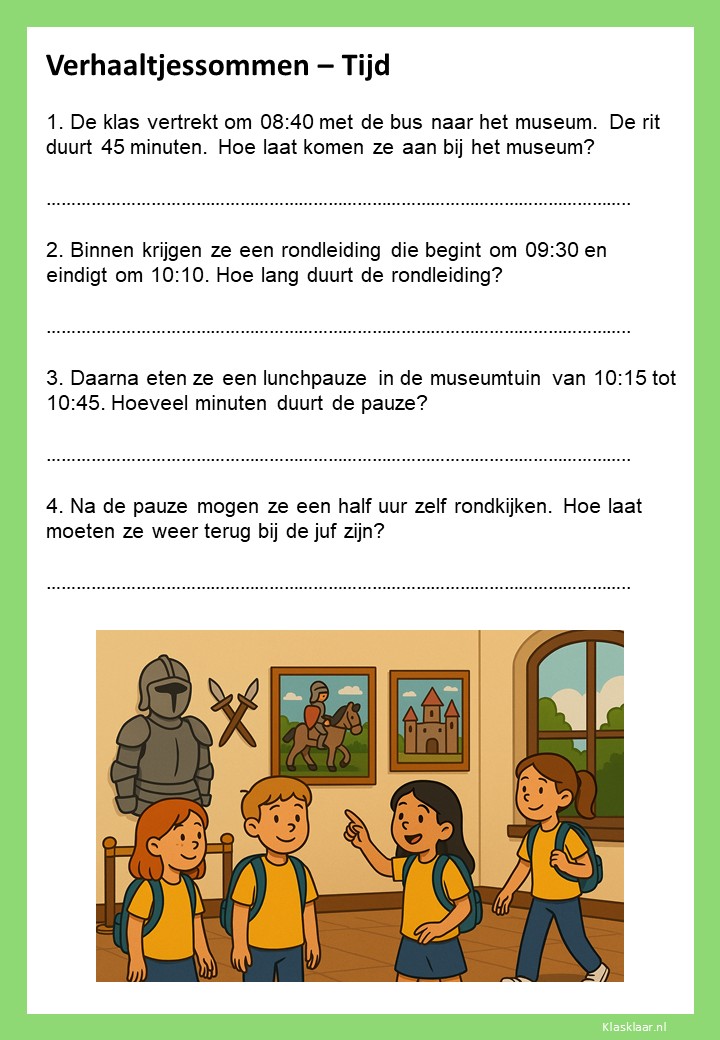 Verhaaltjessommen over tijd helpen kinderen om klok kijken en tijdsbesef toe te passen in echte situaties. Ze leren nadenken over begin- en eindtijden, tijdsverschillen en de duur van activiteiten. De opdrachten sluiten aan bij herkenbare voorbeelden uit het dagelijks leven, zoals schooltijden, reizen of sporten. Zo oefenen leerlingen niet alleen met rekenen, maar ook met plannen en logisch nadenken over tijd.