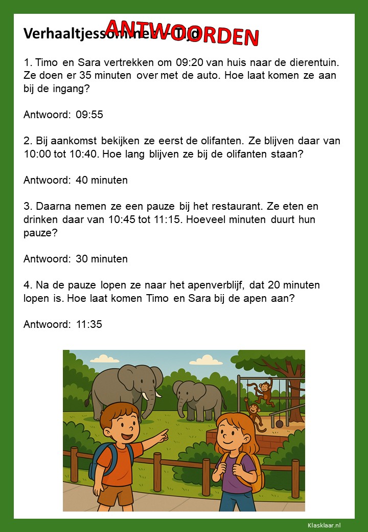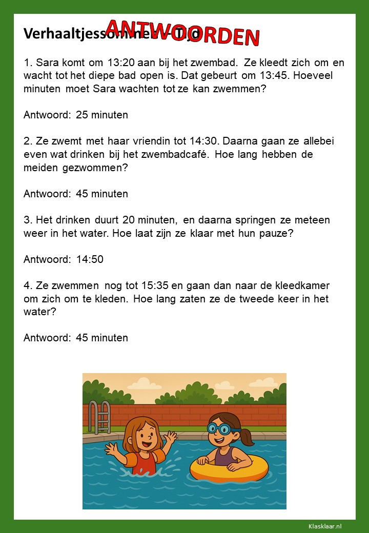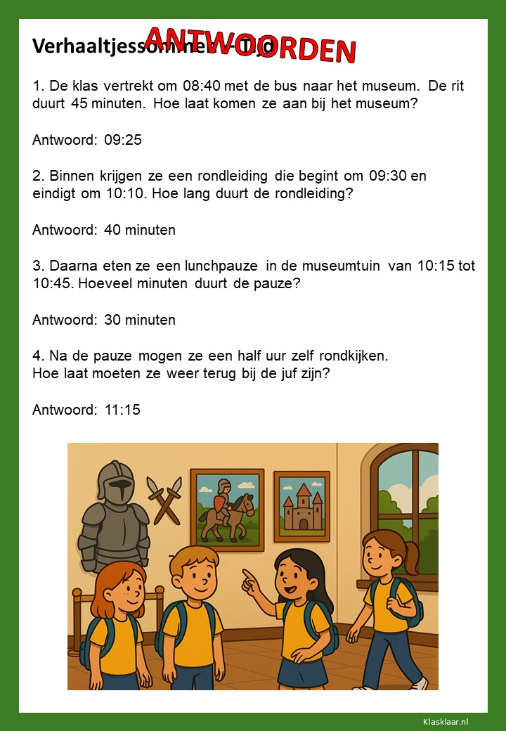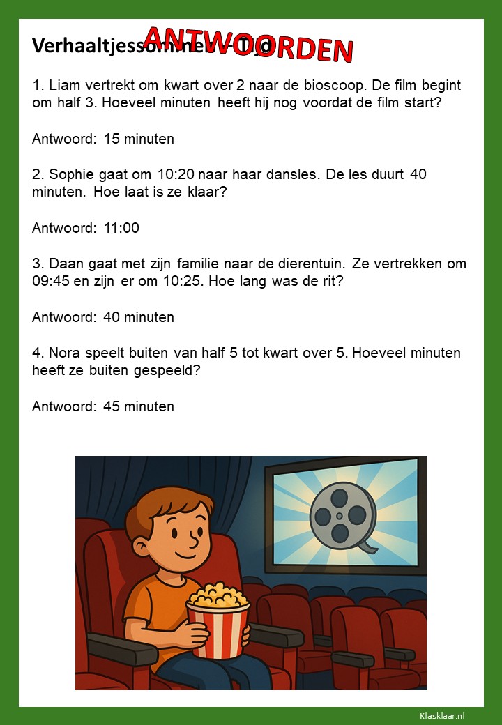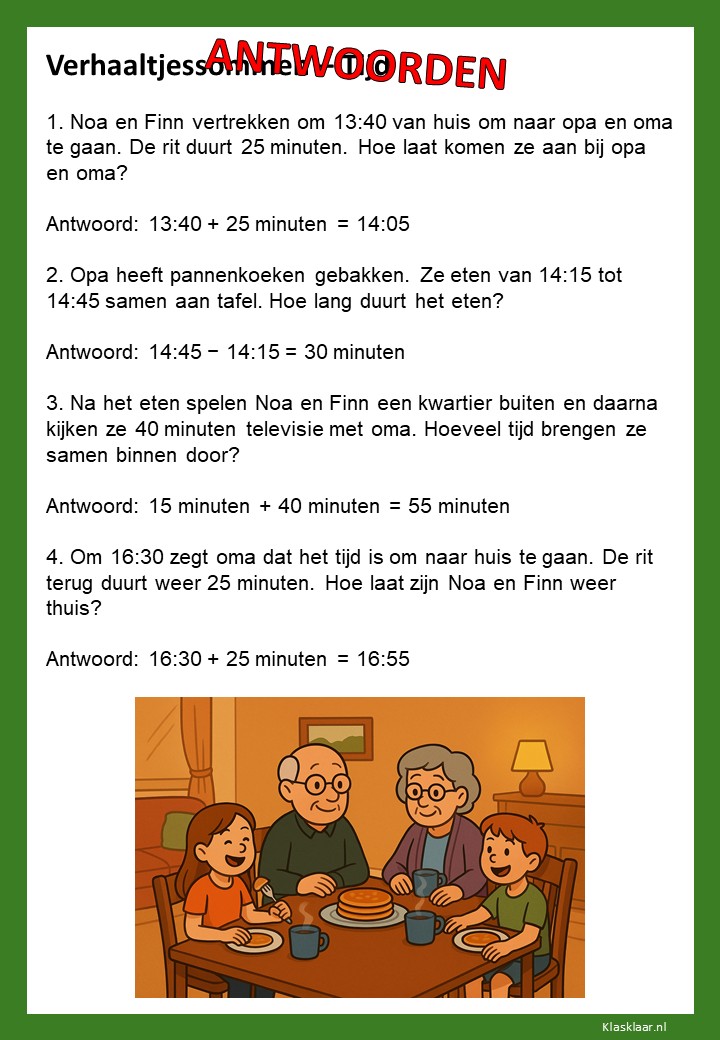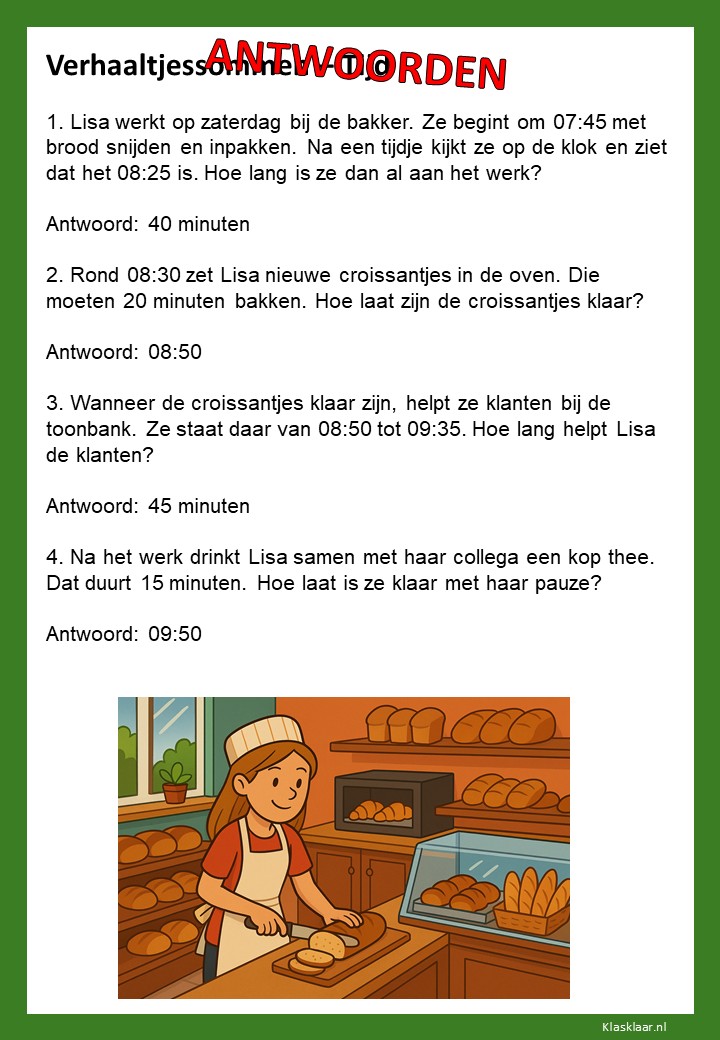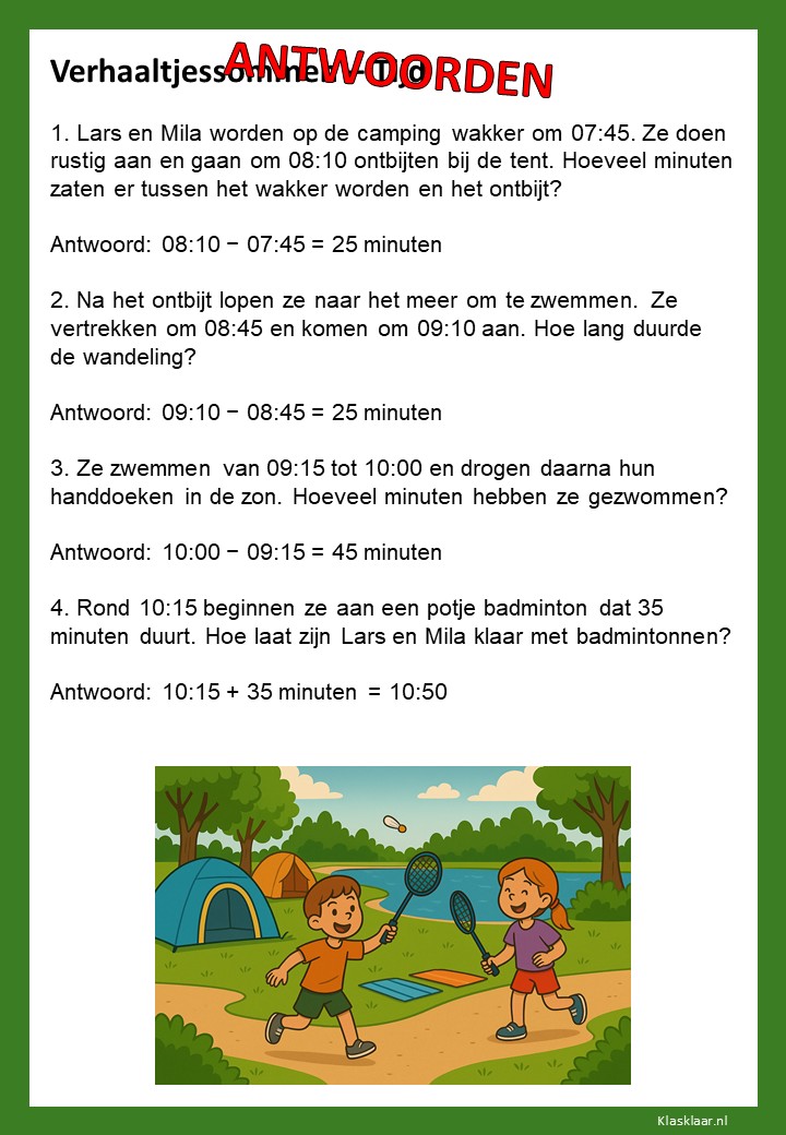 Verhaaltjessommen over tijd helpen kinderen om klok kijken en tijdsbesef toe te passen in echte situaties. Ze leren nadenken over begin- en eindtijden, tijdsverschillen en de duur van activiteiten. De opdrachten sluiten aan bij herkenbare voorbeelden uit het dagelijks leven, zoals schooltijden, reizen of sporten. Zo oefenen leerlingen niet alleen met rekenen, maar ook met plannen en logisch nadenken over tijd.