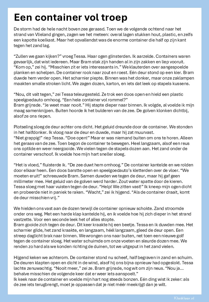 Met deze teksten oefenen leerlingen om langere en complexere teksten vloeiend te lezen. De verhalen en onderwerpen sluiten goed aan bij hun belevingswereld en dagen uit tot nadenken en begrijpen. Perfect om leesvaardigheid verder te versterken en leerlingen meer zelfvertrouwen te geven. Geschikt voor in de klas of om thuis extra te oefenen.
