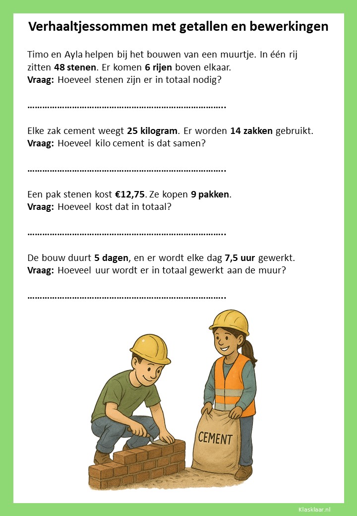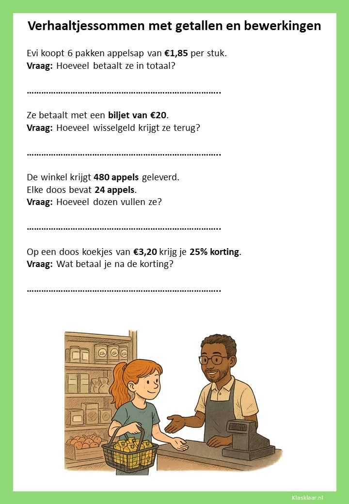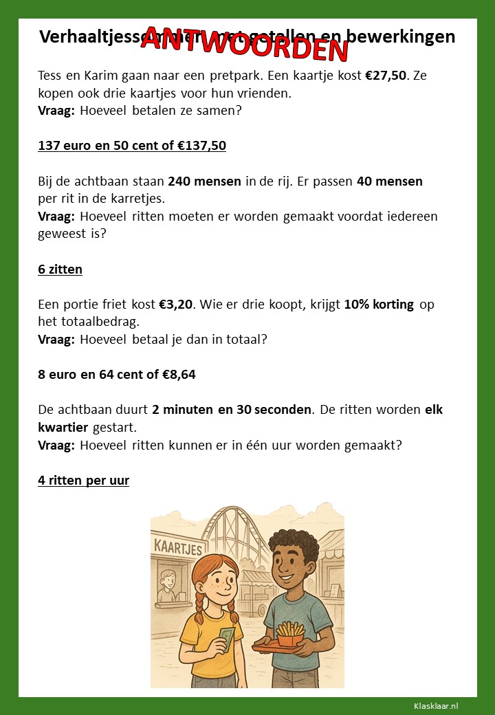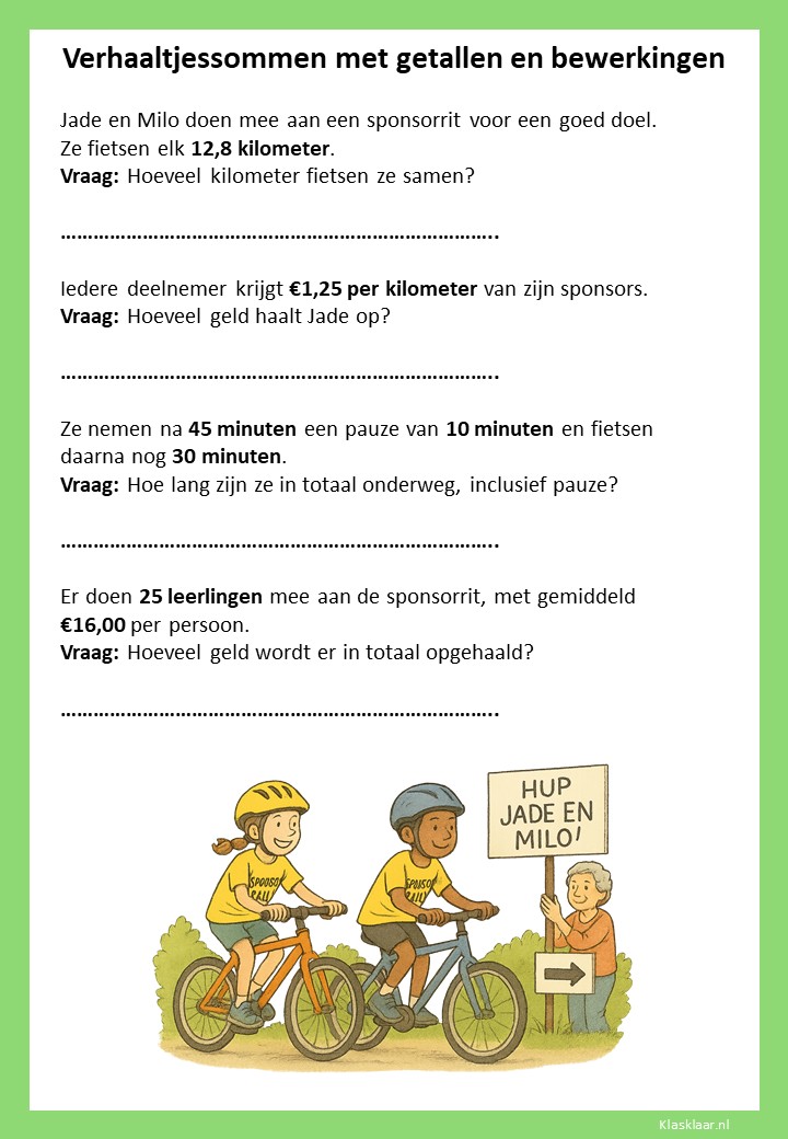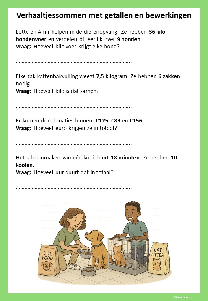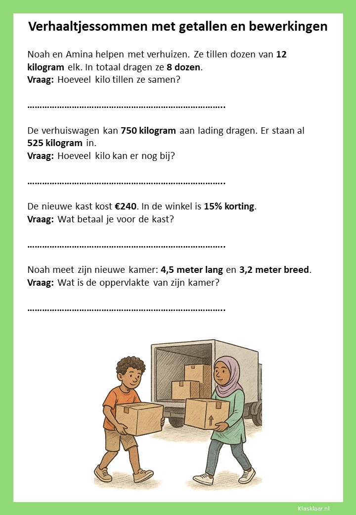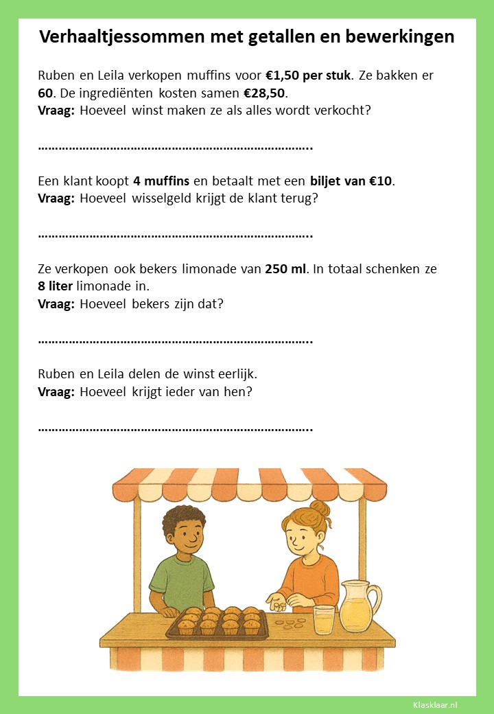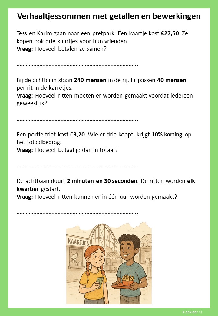 Met deze verhaaltjessommen leren kinderen in groep 7 rekenen in betekenisvolle situaties. Ze passen optellen, aftrekken, vermenigvuldigen en delen toe in realistische contexten en leren goed lezen om te begrijpen wat er precies gevraagd wordt. De opdrachten stimuleren logisch denken, het kiezen van de juiste strategie en het verbinden van taal en rekenen. Zo bouwen leerlingen inzicht én zelfvertrouwen op.