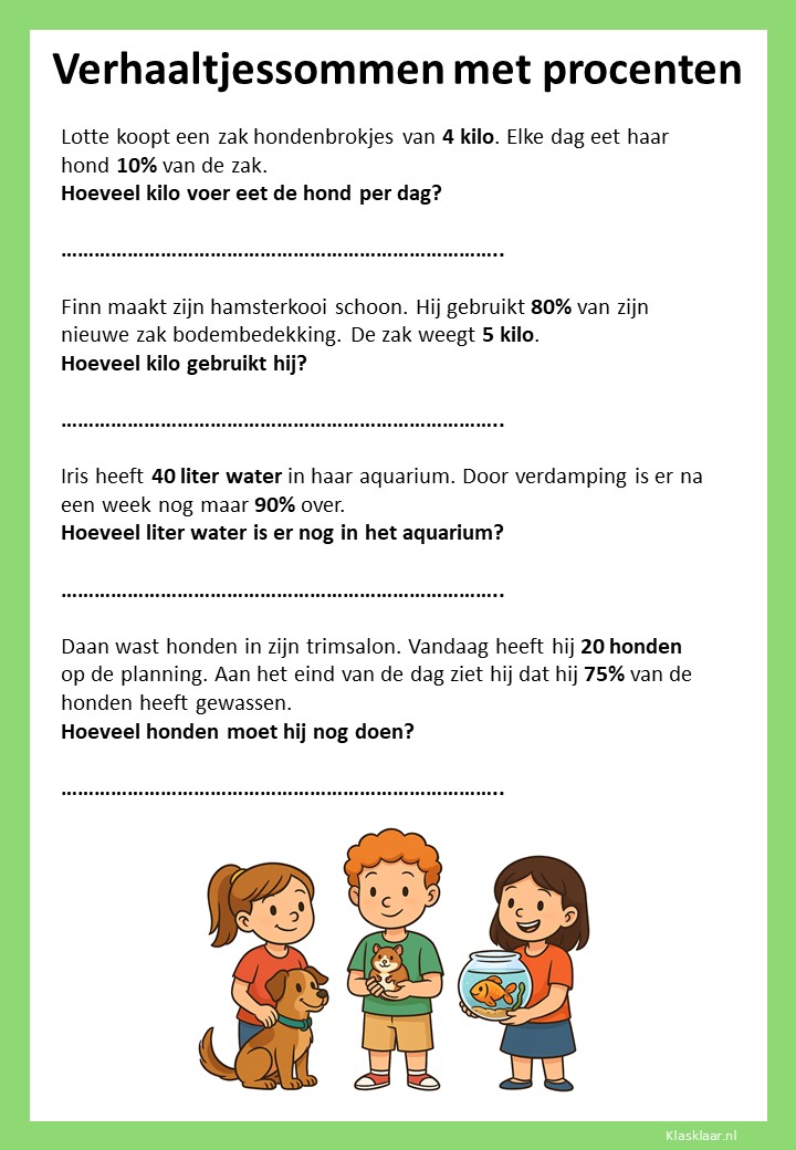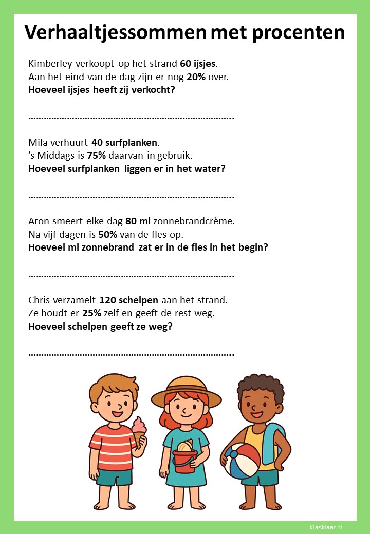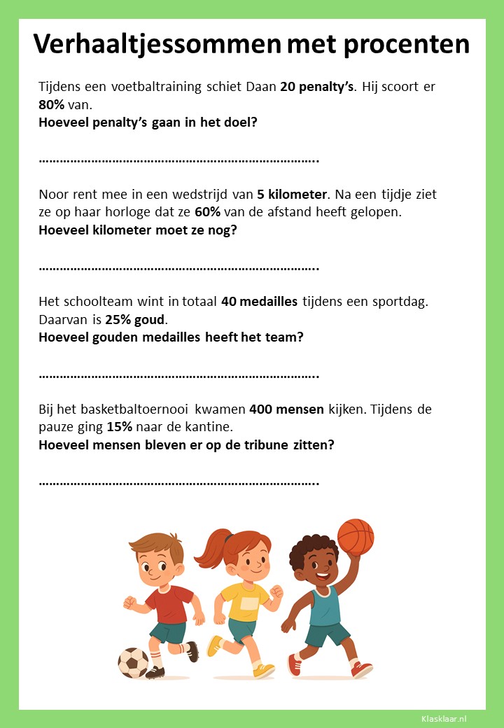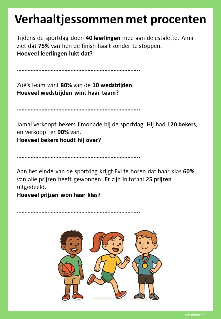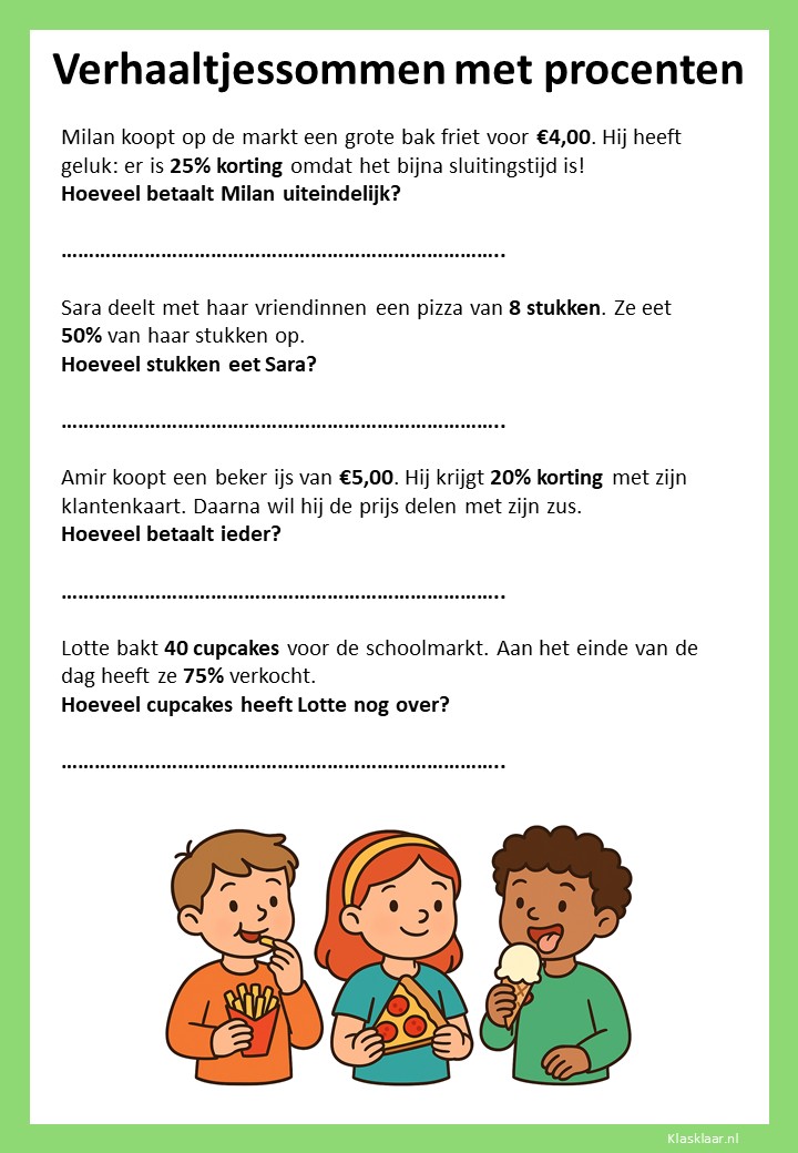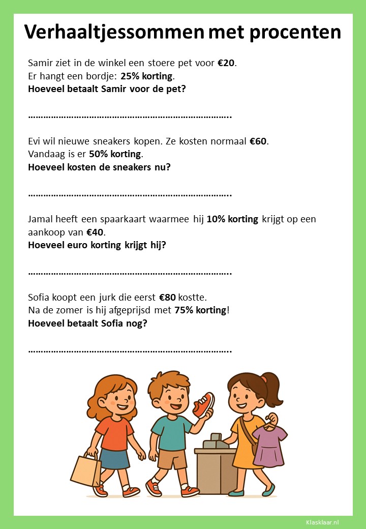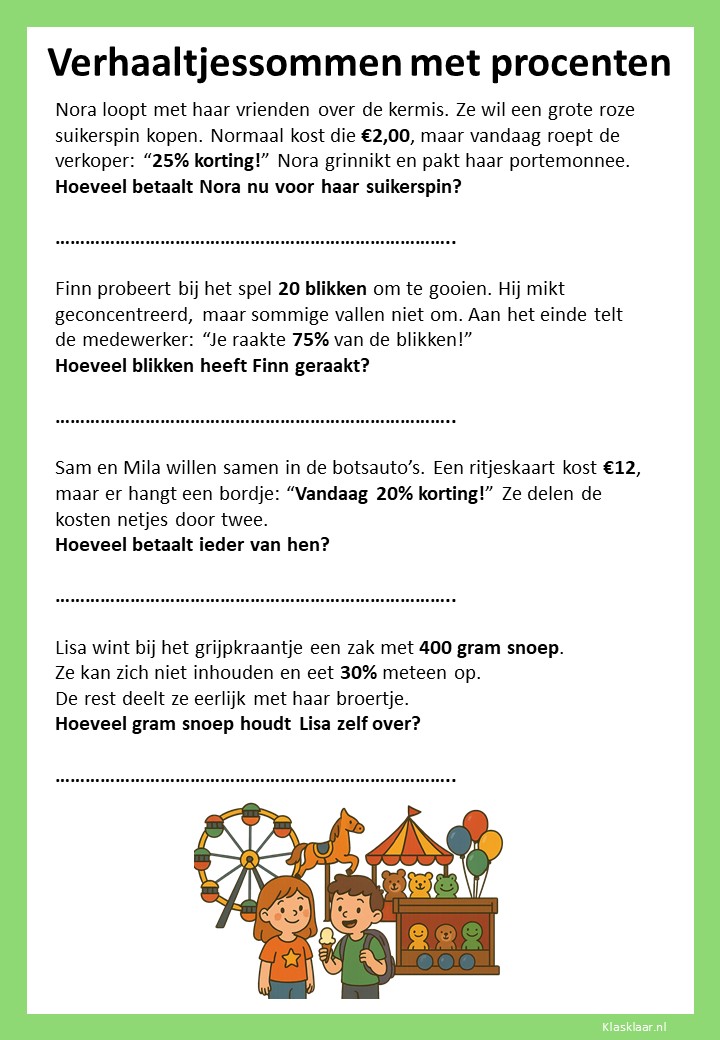 Met deze verhaaltjessommen leren kinderen in groep 7 procenten toepassen in herkenbare situaties. Ze oefenen met eenvoudige kortingen, delen van een geheel en het omrekenen tussen procenten, kommagetallen en breuken. De opdrachten stimuleren logisch denken en helpen leerlingen om procenten écht te begrijpen, niet alleen uit te rekenen.