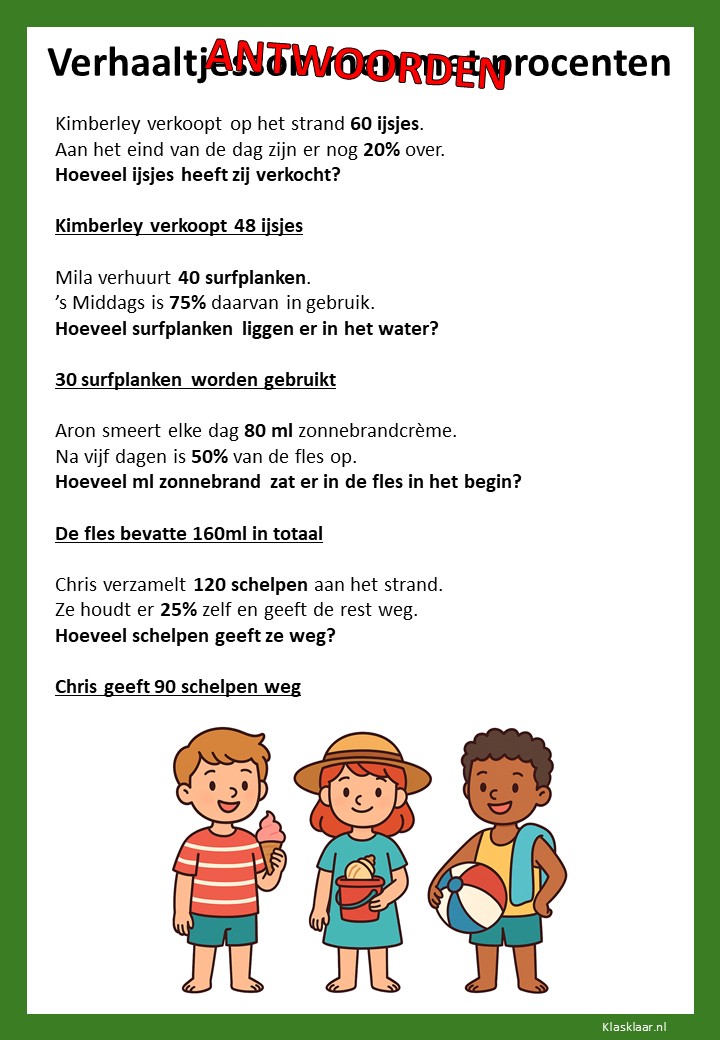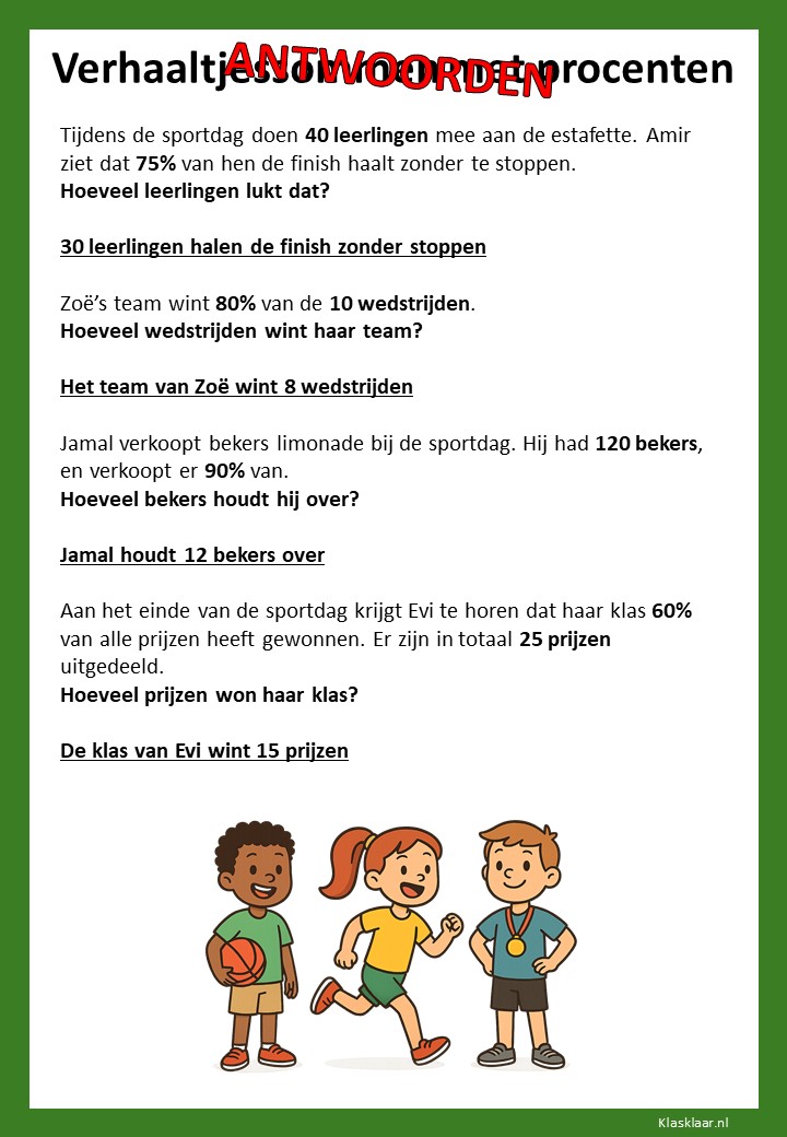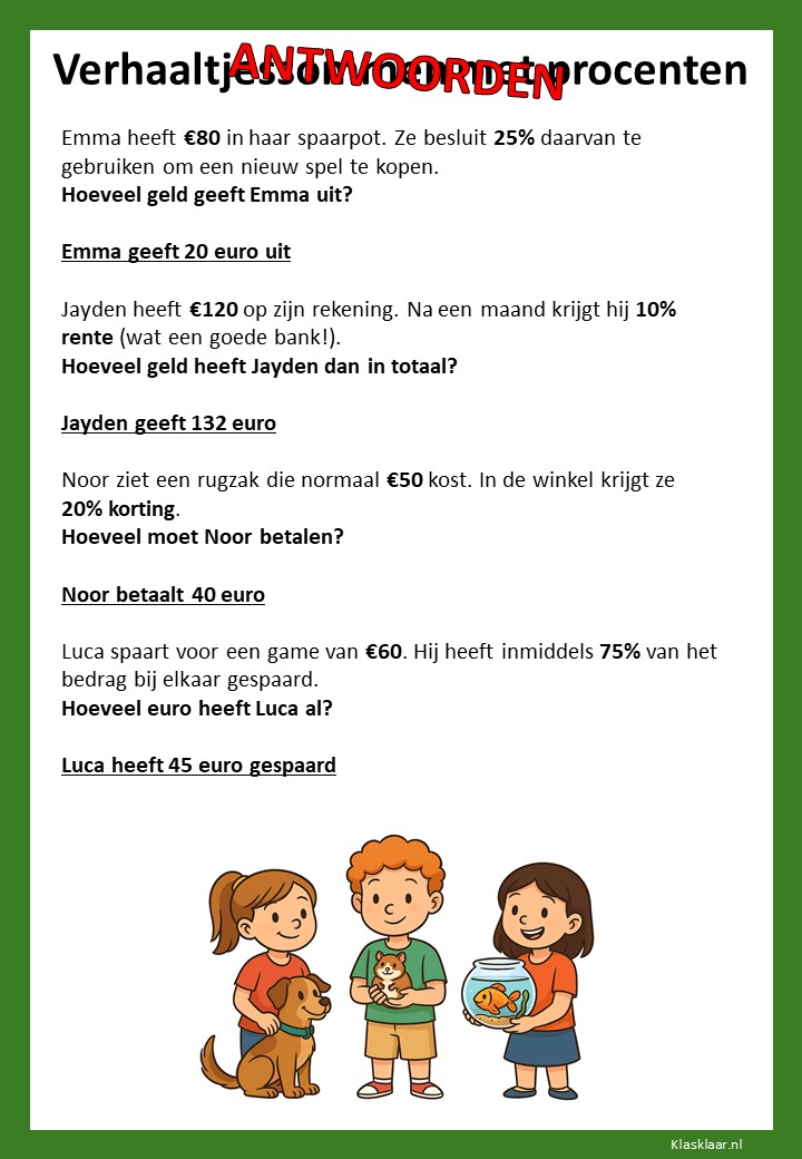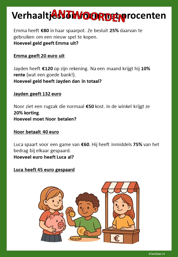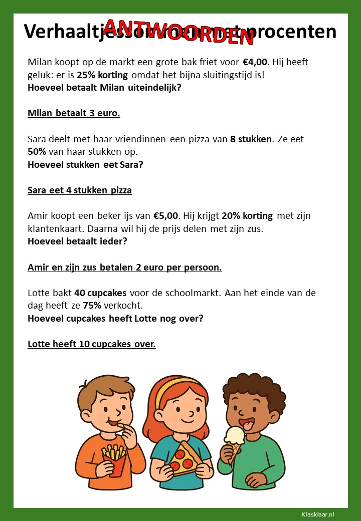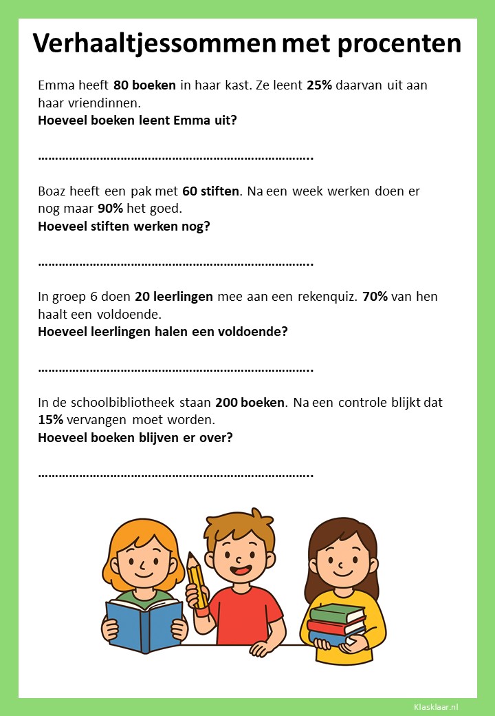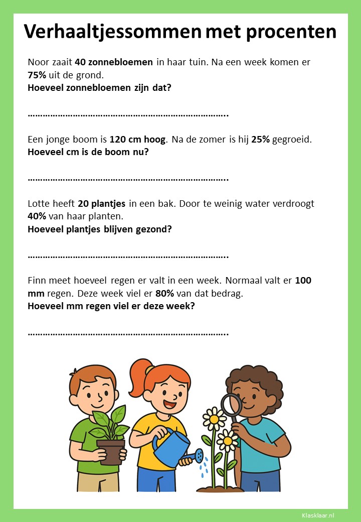 Met deze verhaaltjessommen leren kinderen in groep 7 procenten toepassen in herkenbare situaties. Ze oefenen met eenvoudige kortingen, delen van een geheel en het omrekenen tussen procenten, kommagetallen en breuken. De opdrachten stimuleren logisch denken en helpen leerlingen om procenten écht te begrijpen, niet alleen uit te rekenen.
