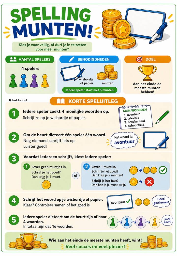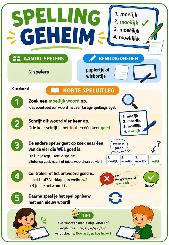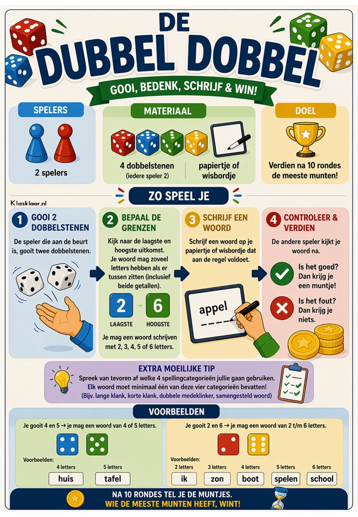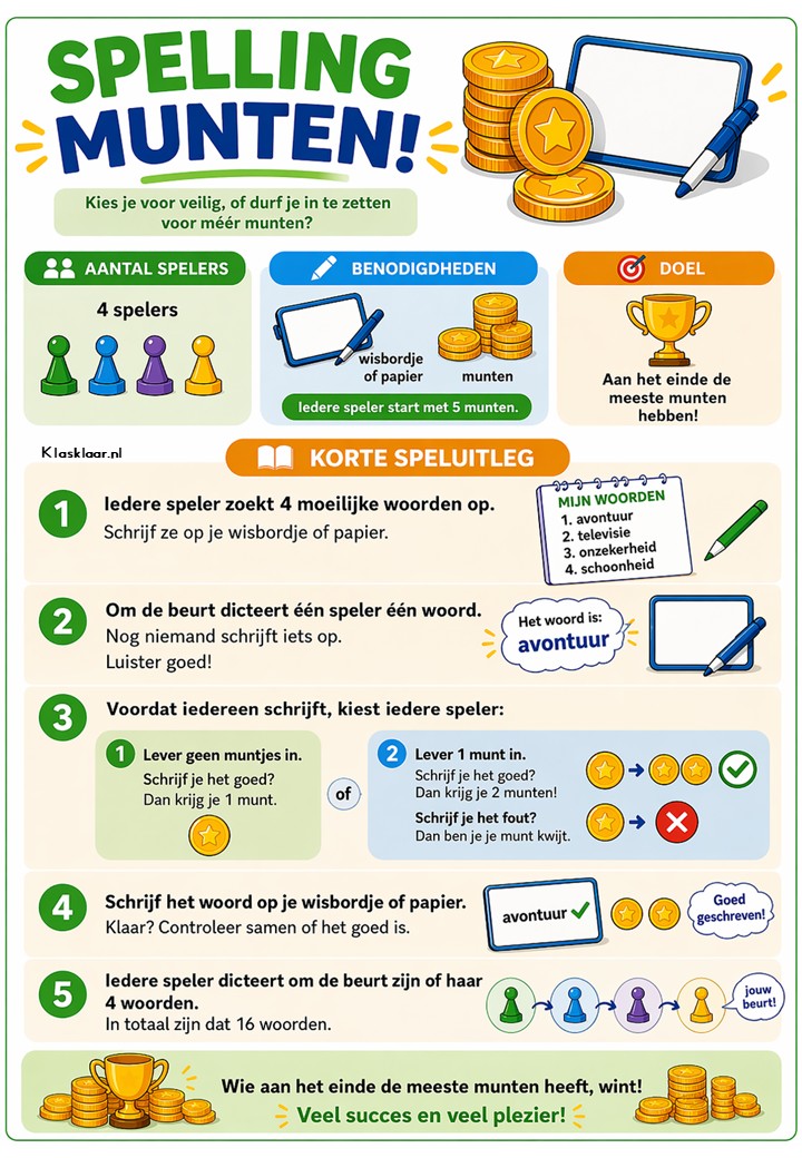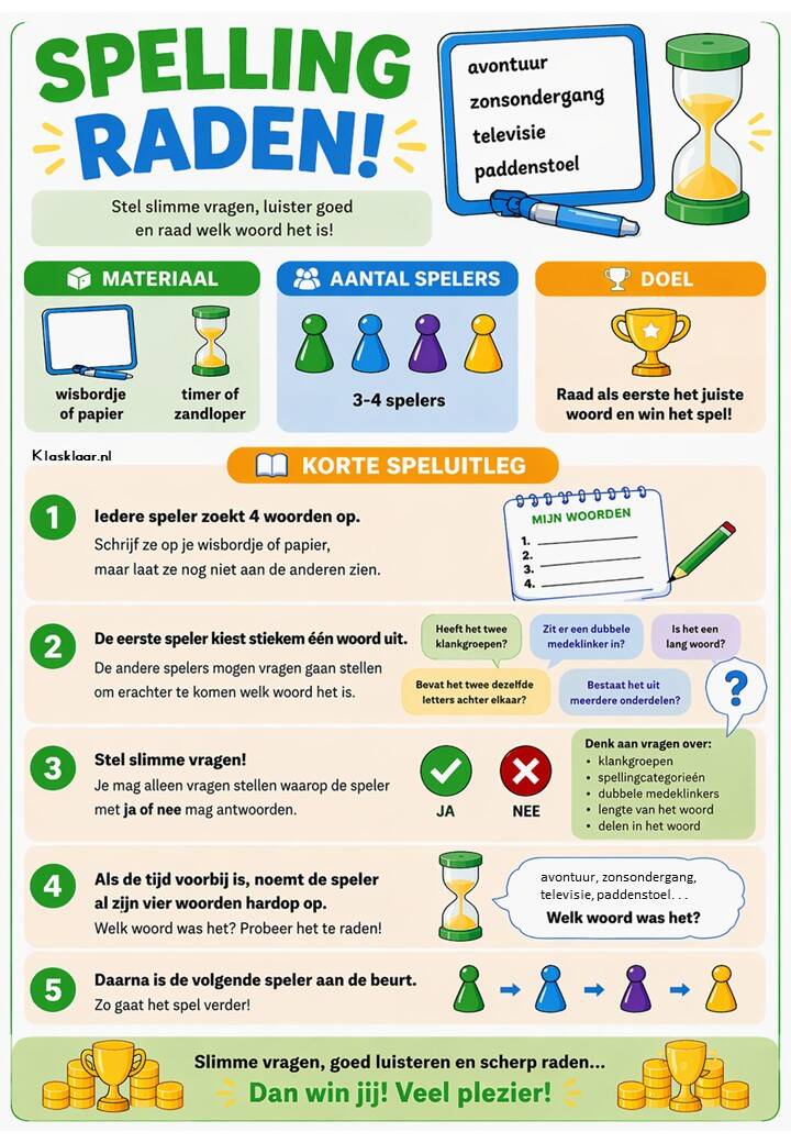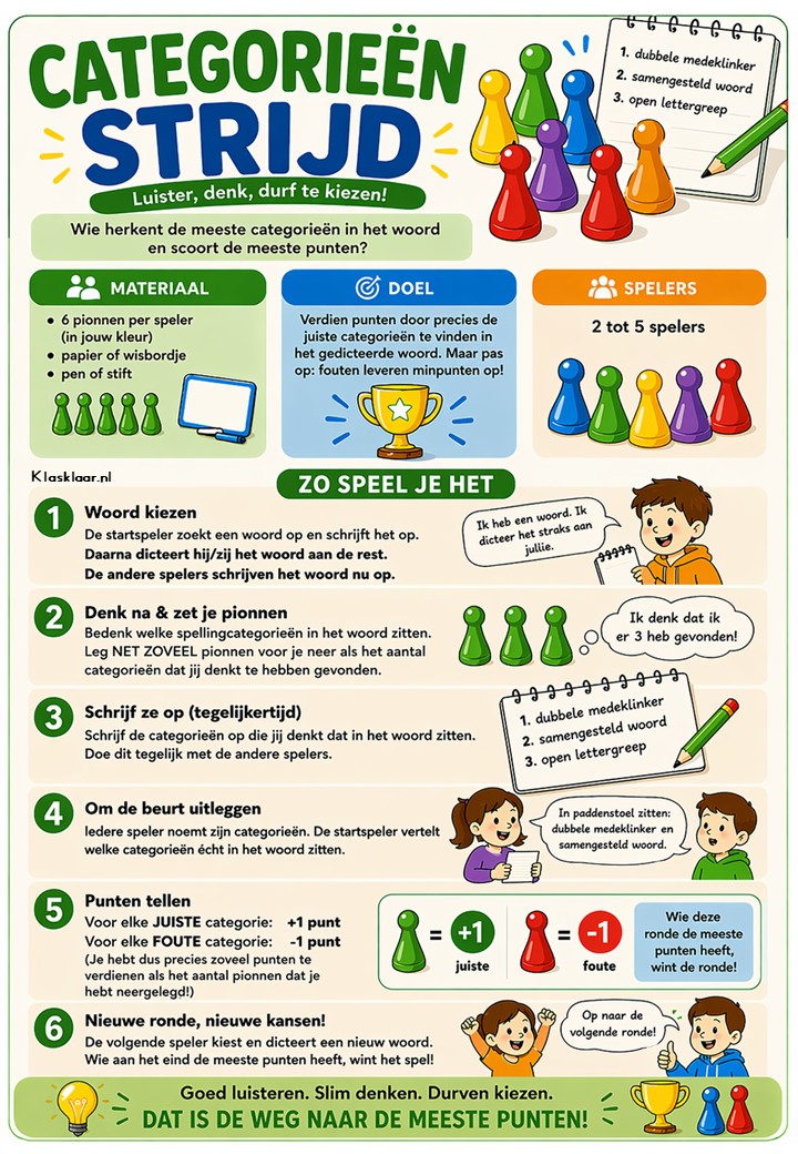 Met deze spellingsspellen werk je op een speelse en effectieve manier aan herhaling, inoefening en automatisering van spellingcategorieën. De spellen zijn zo ontworpen dat kinderen zelfstandig of samen aan de slag kunnen met het oefenen van woorden, spellingregels en categorieën. Woorden kunnen ze vinden in werkboeken, boeken of lijsten vanuit de methode bijvoorbeeld.