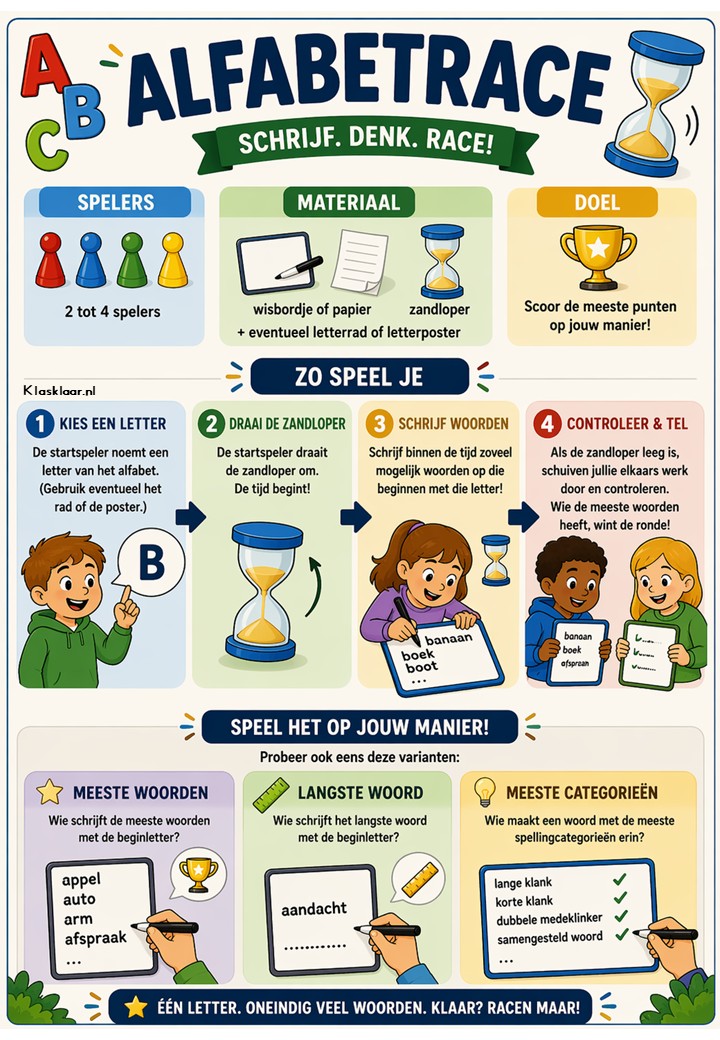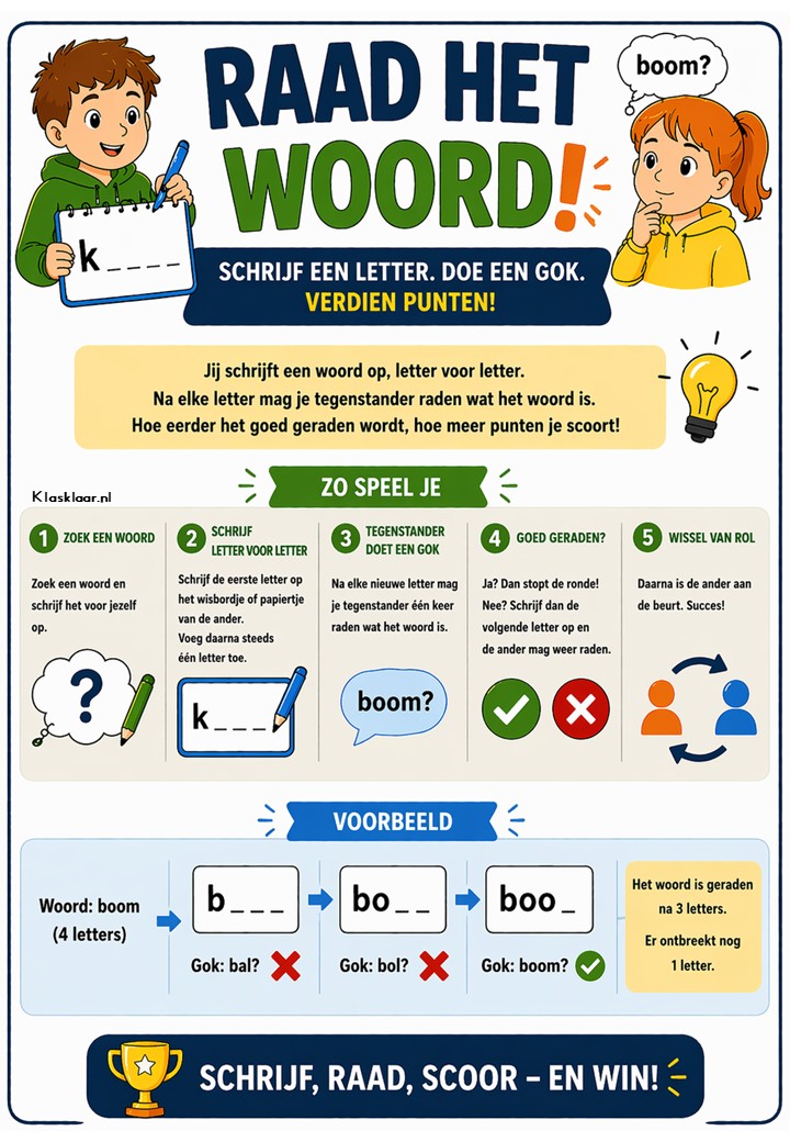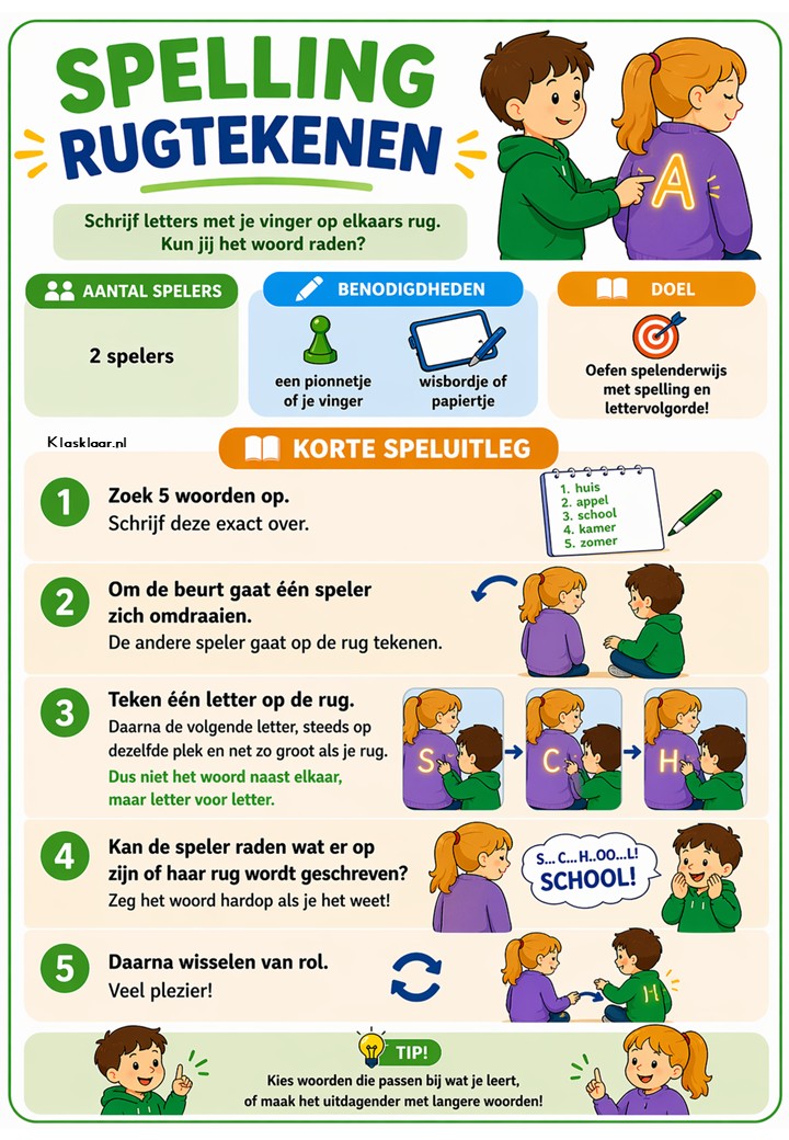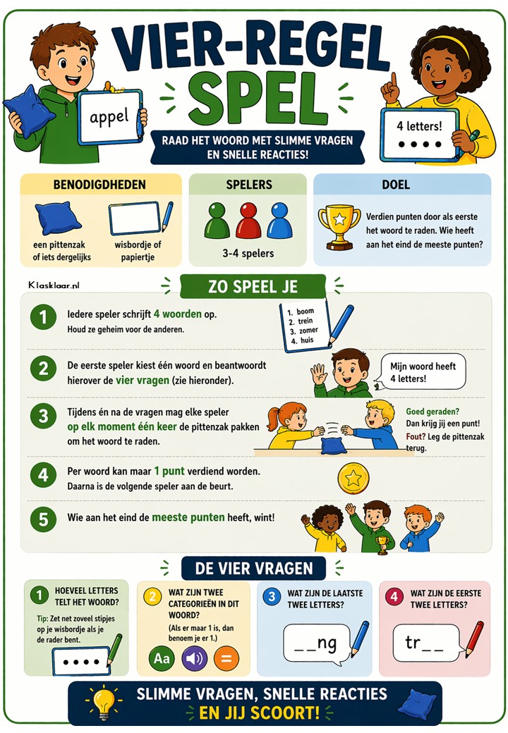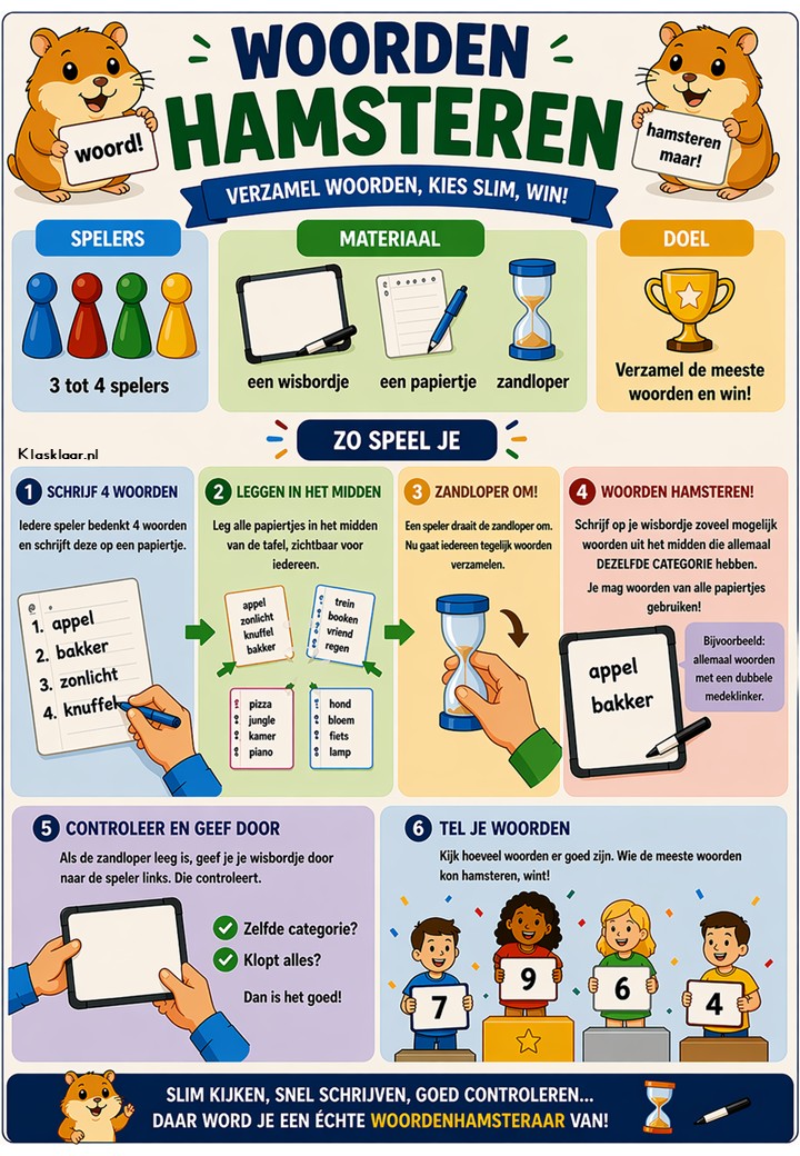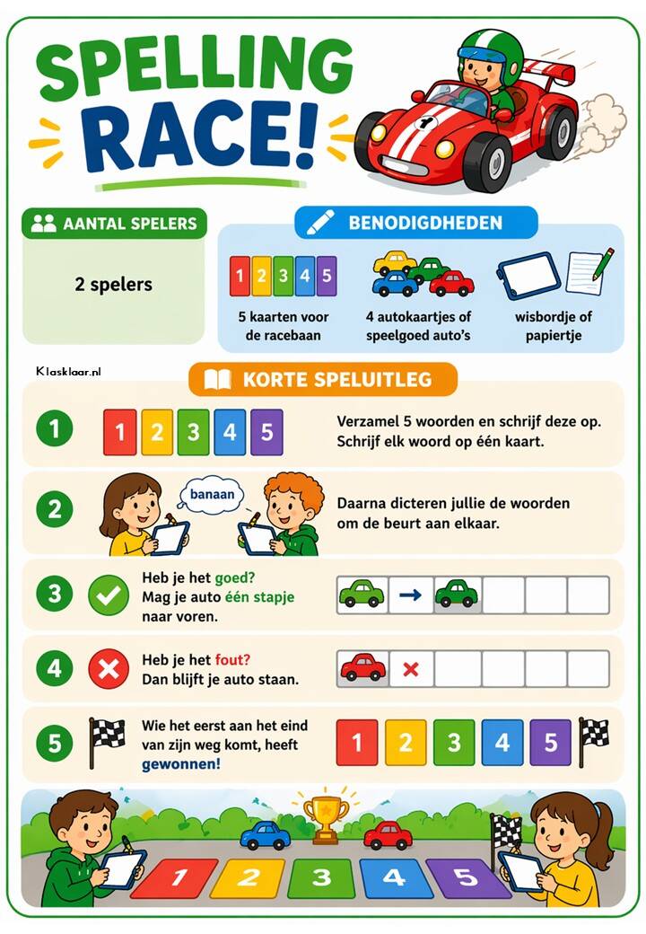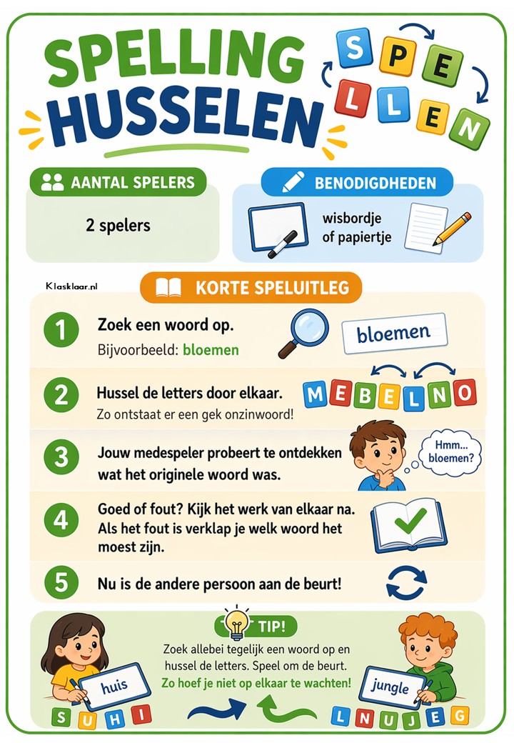 Met deze spellingsspellen werk je op een speelse en effectieve manier aan herhaling, inoefening en automatisering van spellingcategorieën. De spellen zijn zo ontworpen dat kinderen zelfstandig of samen aan de slag kunnen met het oefenen van woorden, spellingregels en categorieën. Woorden kunnen ze vinden in werkboeken, boeken of lijsten vanuit de methode bijvoorbeeld.