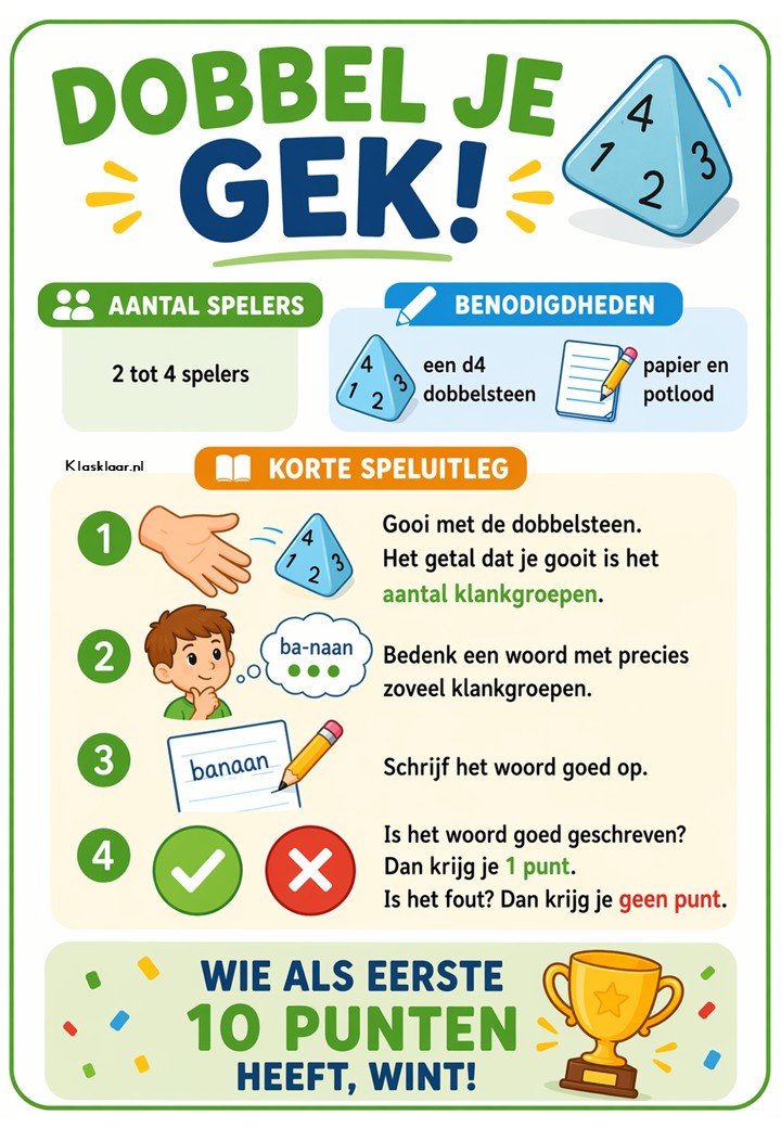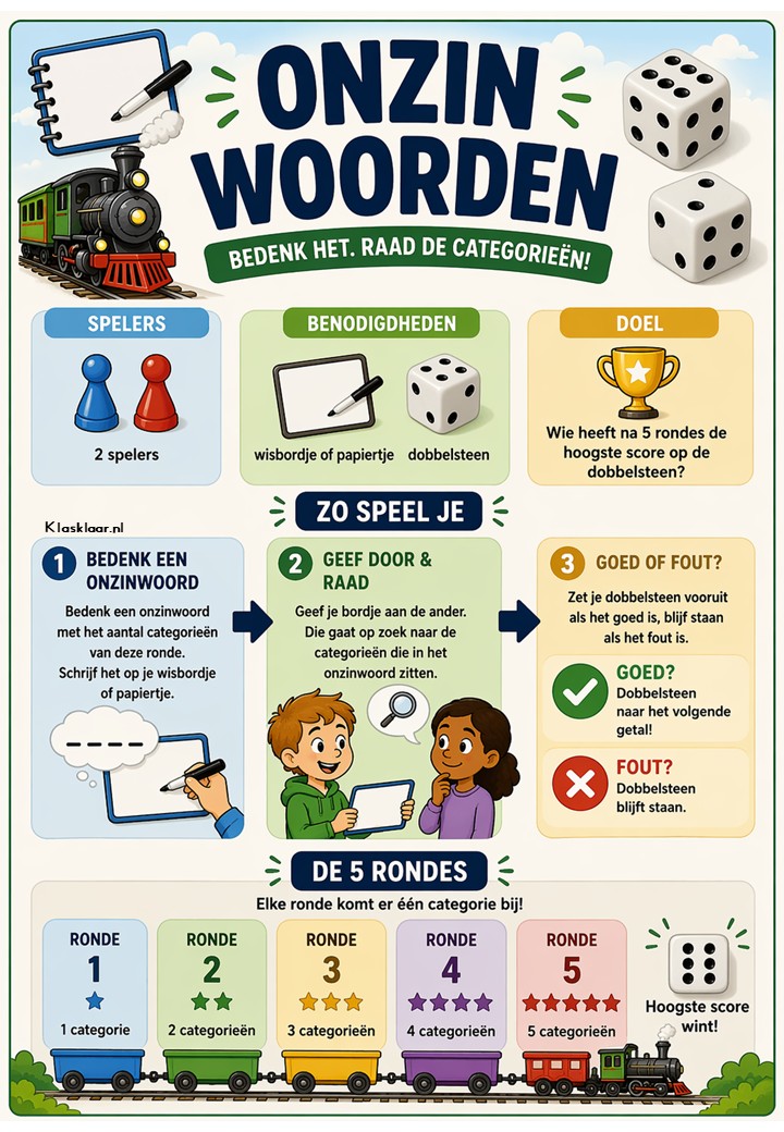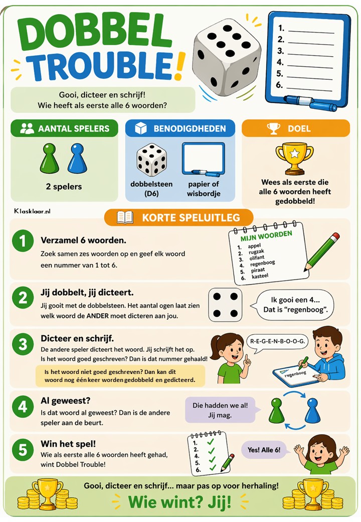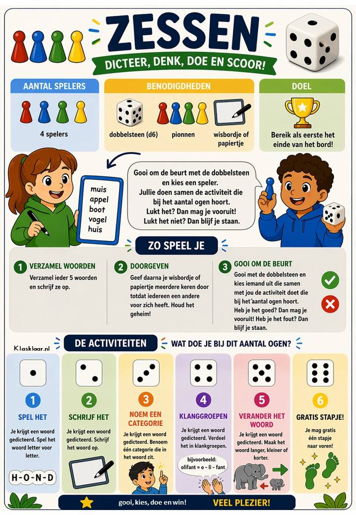 Voor deze werkbladen heb je vaak maar een paar eenvoudige materialen nodig, zoals een dobbelsteen, pionnen, woordkaarten, een wisbordje of papier en een stift of potlood. Juist door deze simpele opzet kun je met weinig voorbereiding een hele klas tegelijk laten oefenen.