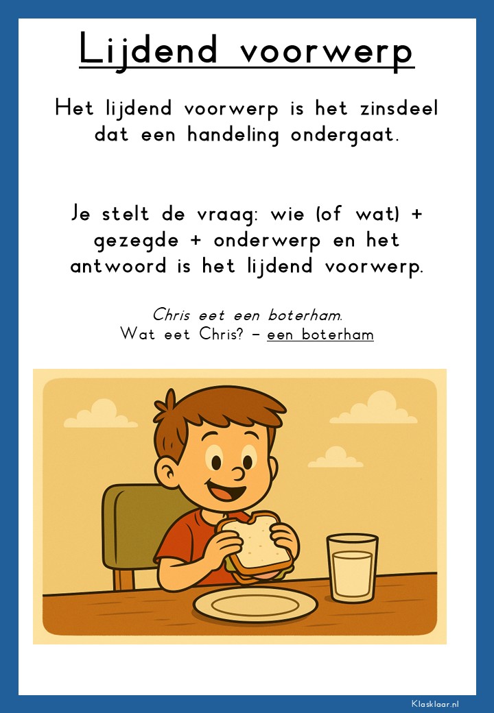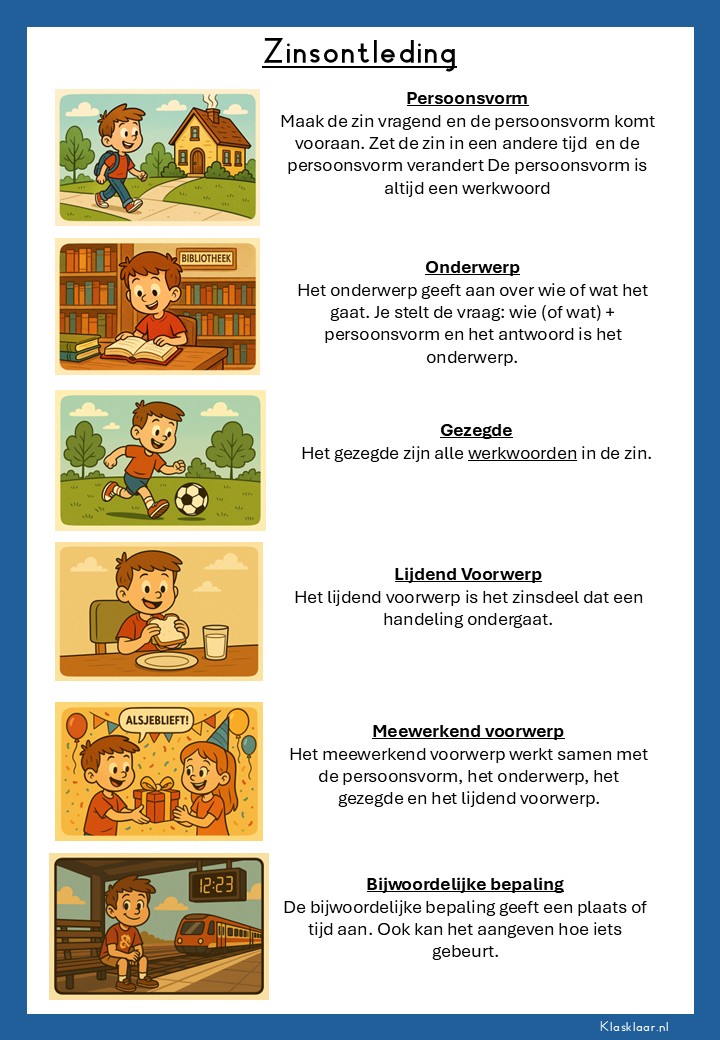 Met deze poster over zinsontleding krijgen leerlingen een duidelijk overzicht van de belangrijkste zinsdelen. Persoonsvorm, onderwerp, gezegde, lijdend voorwerp, meewerkend voorwerp en bijwoordelijke bepaling worden stap voor stap uitgelegd met voorbeelden. De poster maakt grammatica visueel en concreet, zodat leerlingen sneller verbanden zien en de theorie beter onthouden. Ideaal als geheugensteun in de klas of om thuis te oefenen.