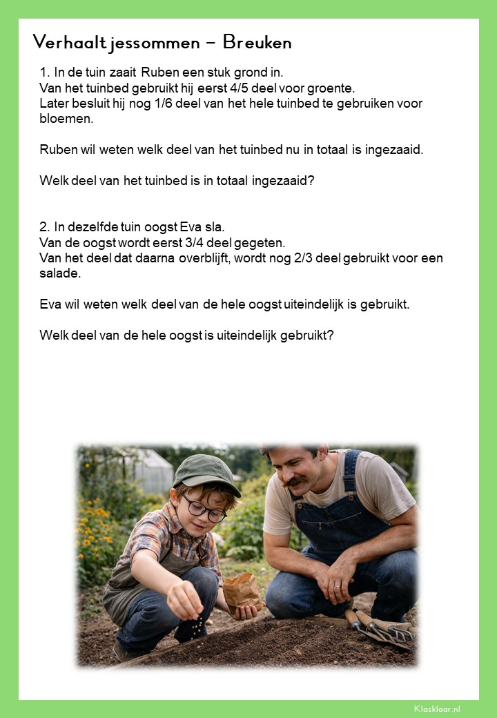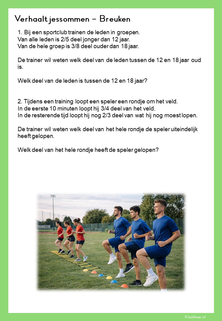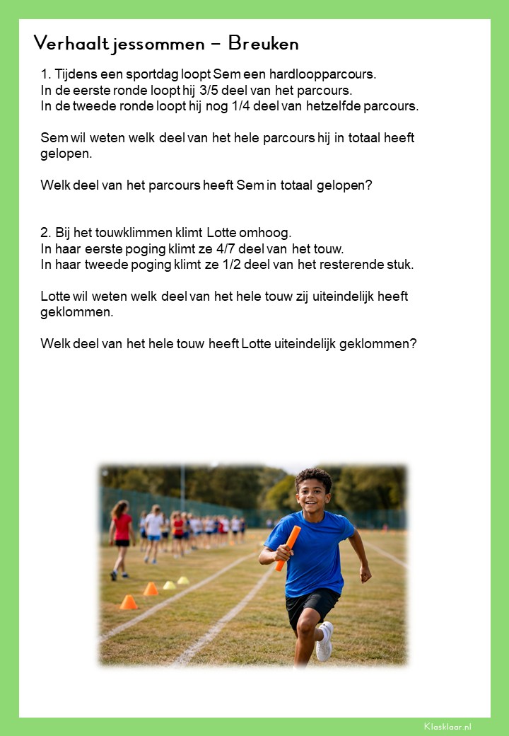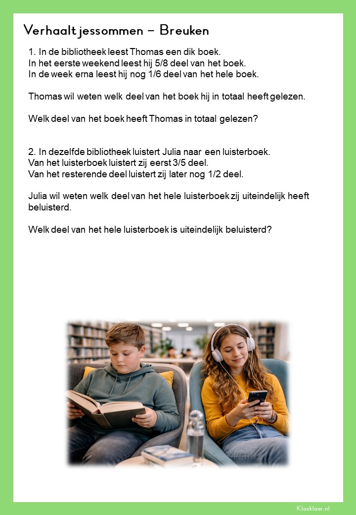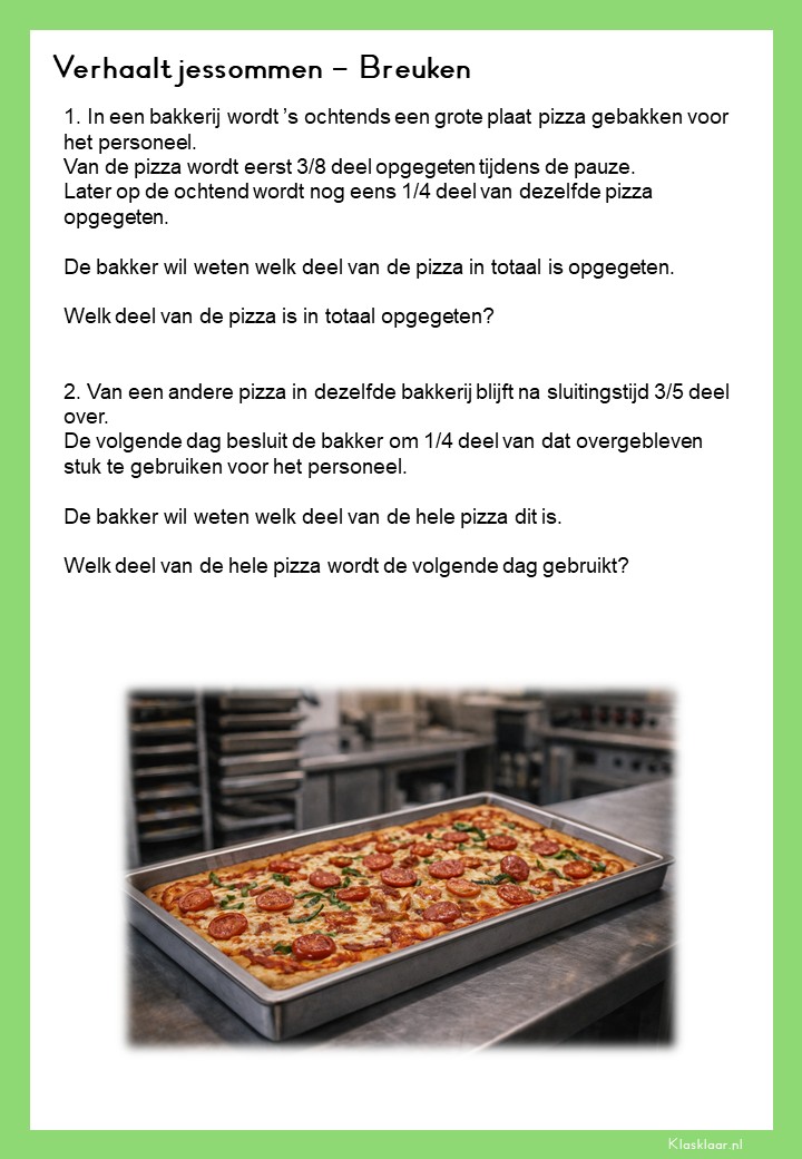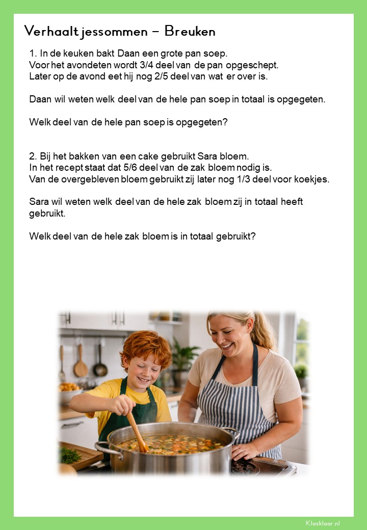 Met deze verhaalsommen over breuken leren leerlingen breuken toepassen in herkenbare en realistische situaties. Ze oefenen met delen van hoeveelheden, vergelijken van breuken en het rekenen met meerdere stappen. De opdrachten vragen om goed lezen, logisch redeneren en het kiezen van de juiste aanpak. Zo krijgen leerlingen niet alleen rekenvaardigheid, maar ook écht inzicht in hoe breuken in de praktijk werken.