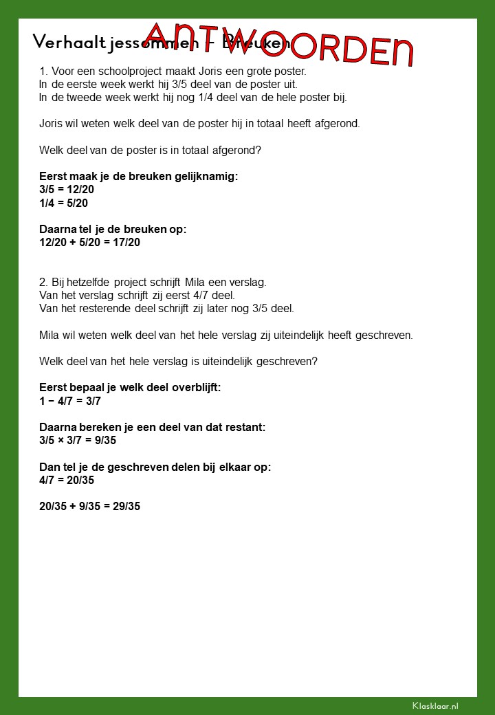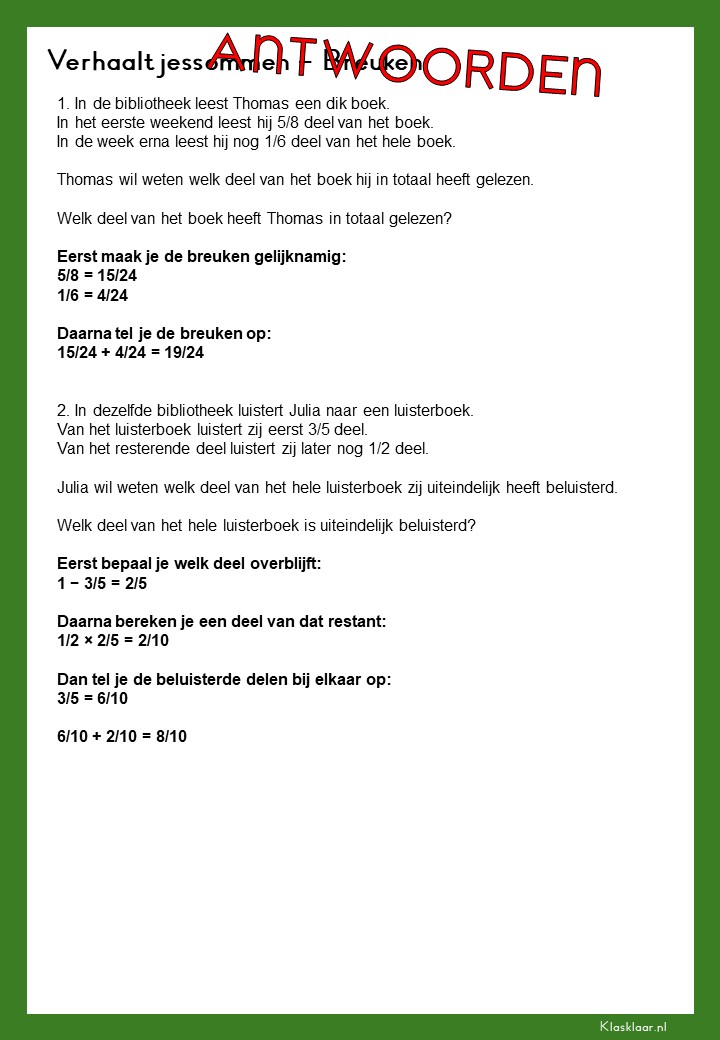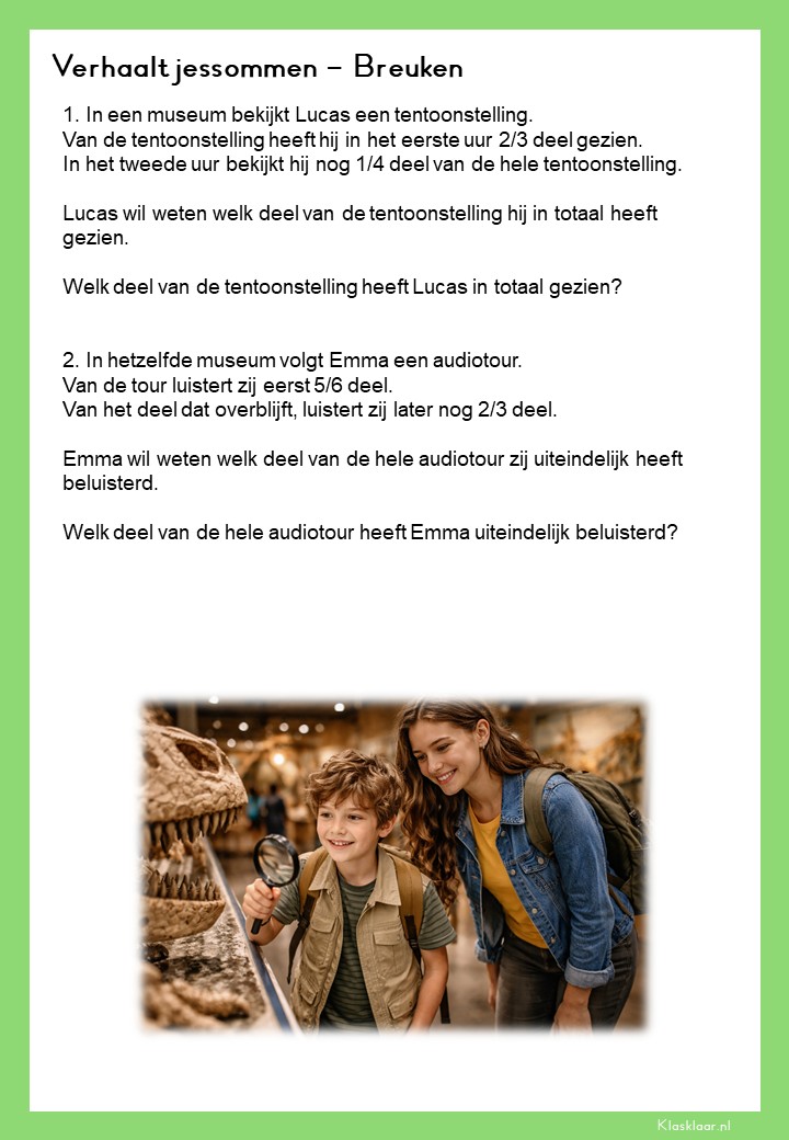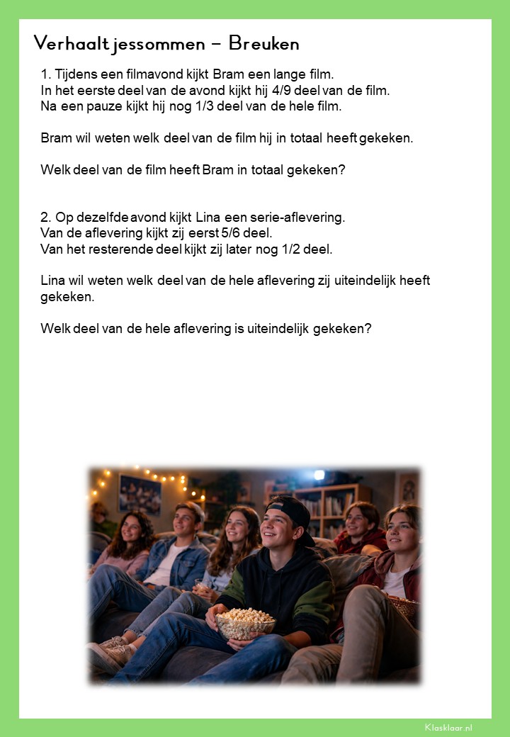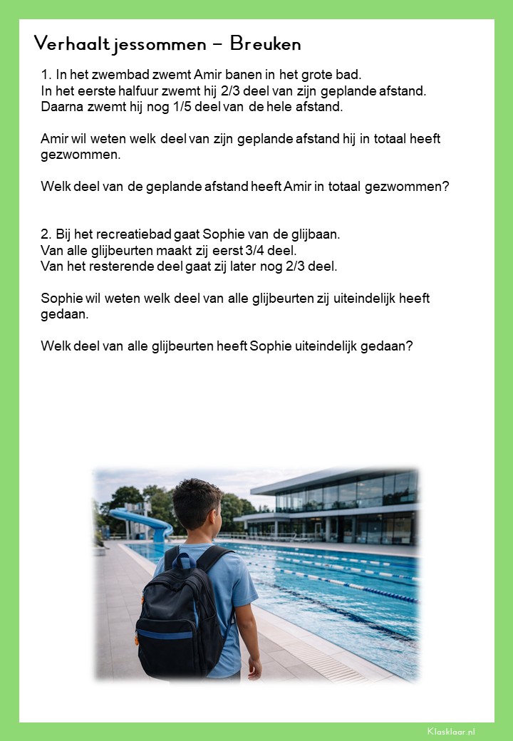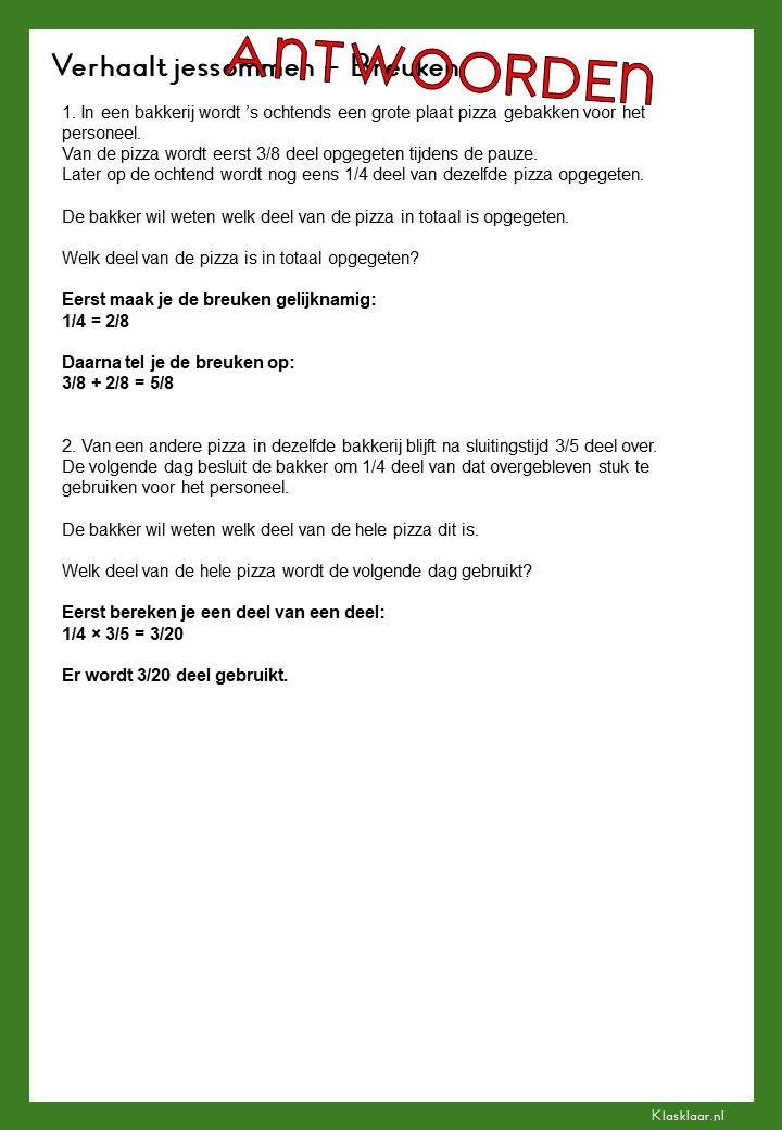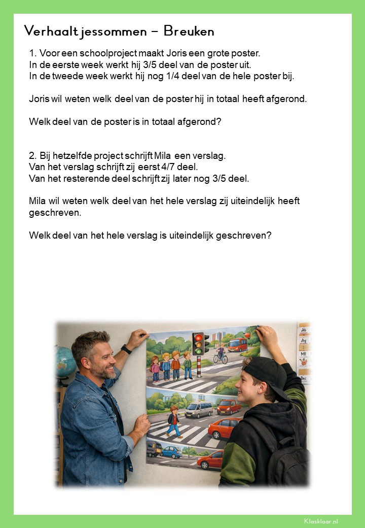 Met deze verhaalsommen over breuken leren leerlingen breuken toepassen in herkenbare en realistische situaties. Ze oefenen met delen van hoeveelheden, vergelijken van breuken en het rekenen met meerdere stappen. De opdrachten vragen om goed lezen, logisch redeneren en het kiezen van de juiste aanpak. Zo krijgen leerlingen niet alleen rekenvaardigheid, maar ook écht inzicht in hoe breuken in de praktijk werken.