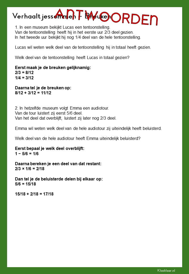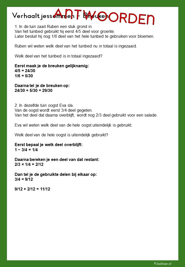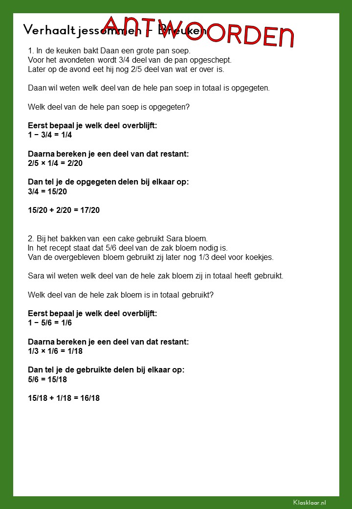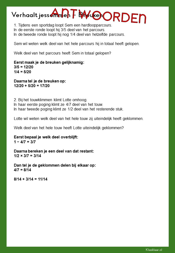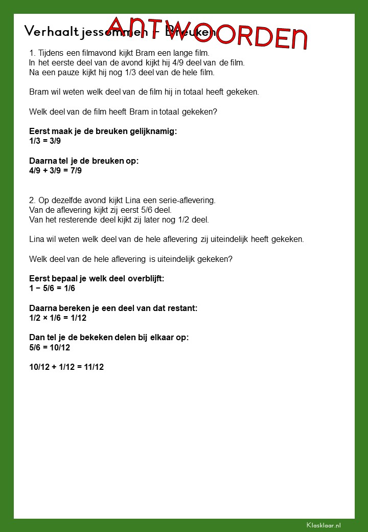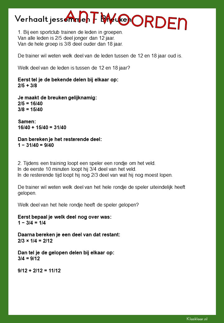 Met deze verhaalsommen over breuken leren leerlingen breuken toepassen in herkenbare en realistische situaties. Ze oefenen met delen van hoeveelheden, vergelijken van breuken en het rekenen met meerdere stappen. De opdrachten vragen om goed lezen, logisch redeneren en het kiezen van de juiste aanpak. Zo krijgen leerlingen niet alleen rekenvaardigheid, maar ook écht inzicht in hoe breuken in de praktijk werken.