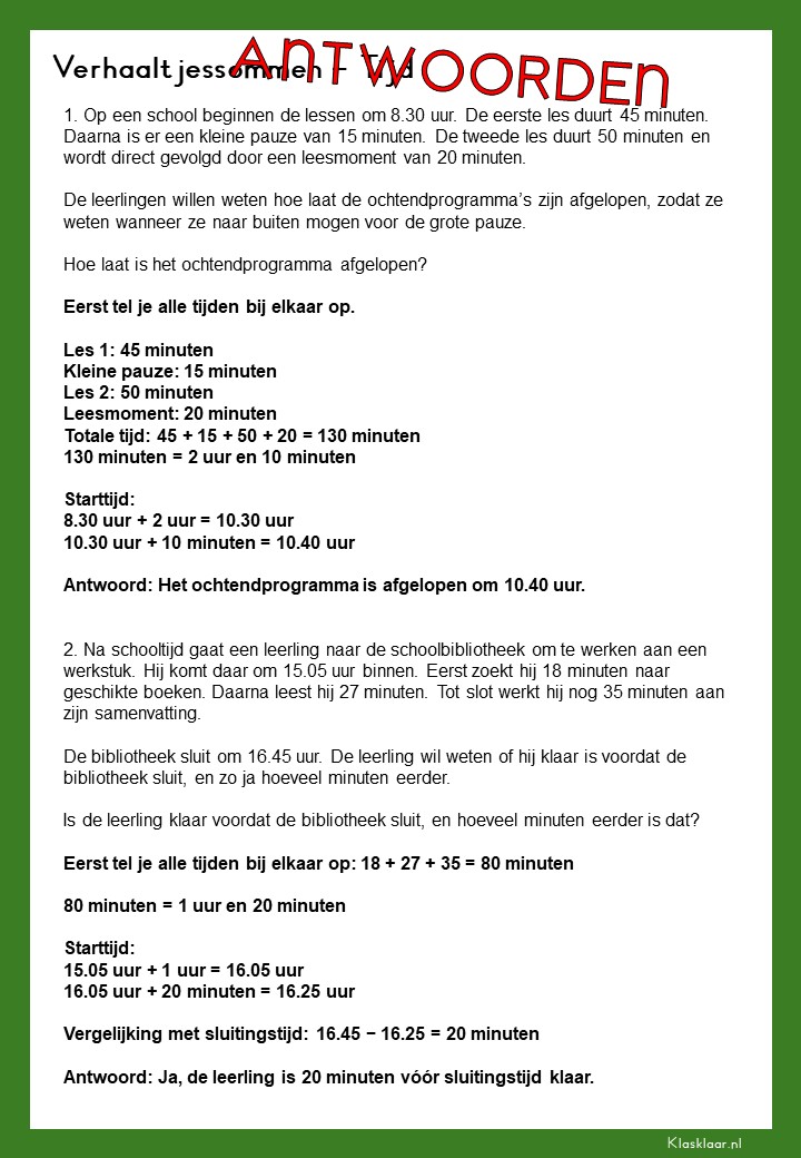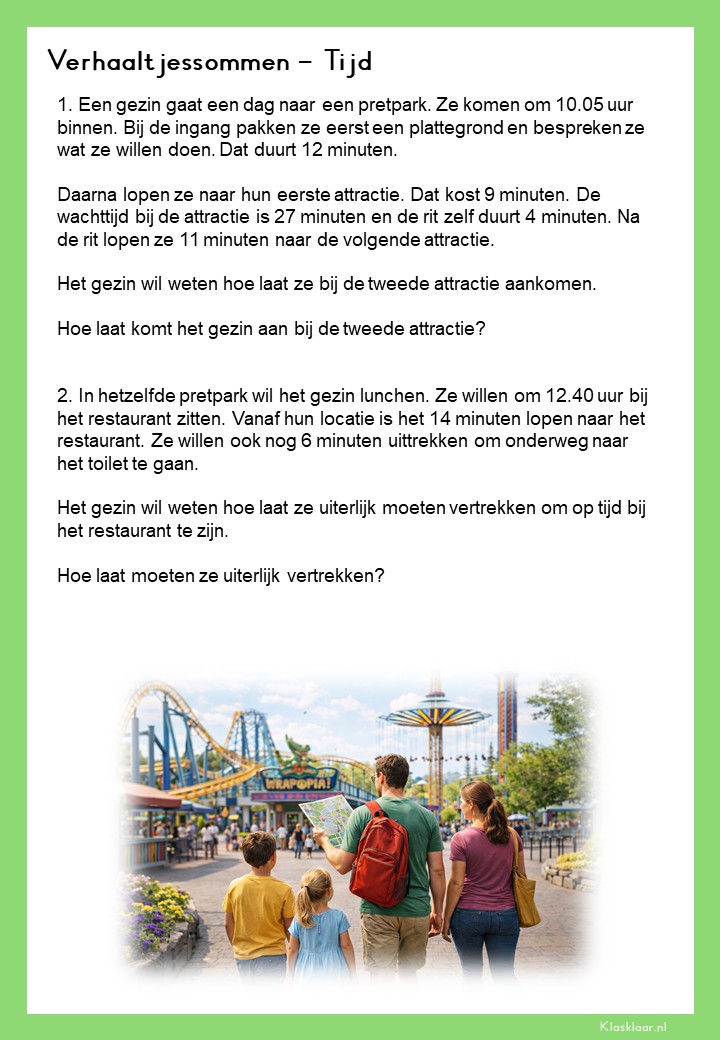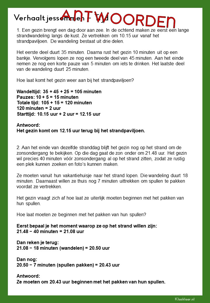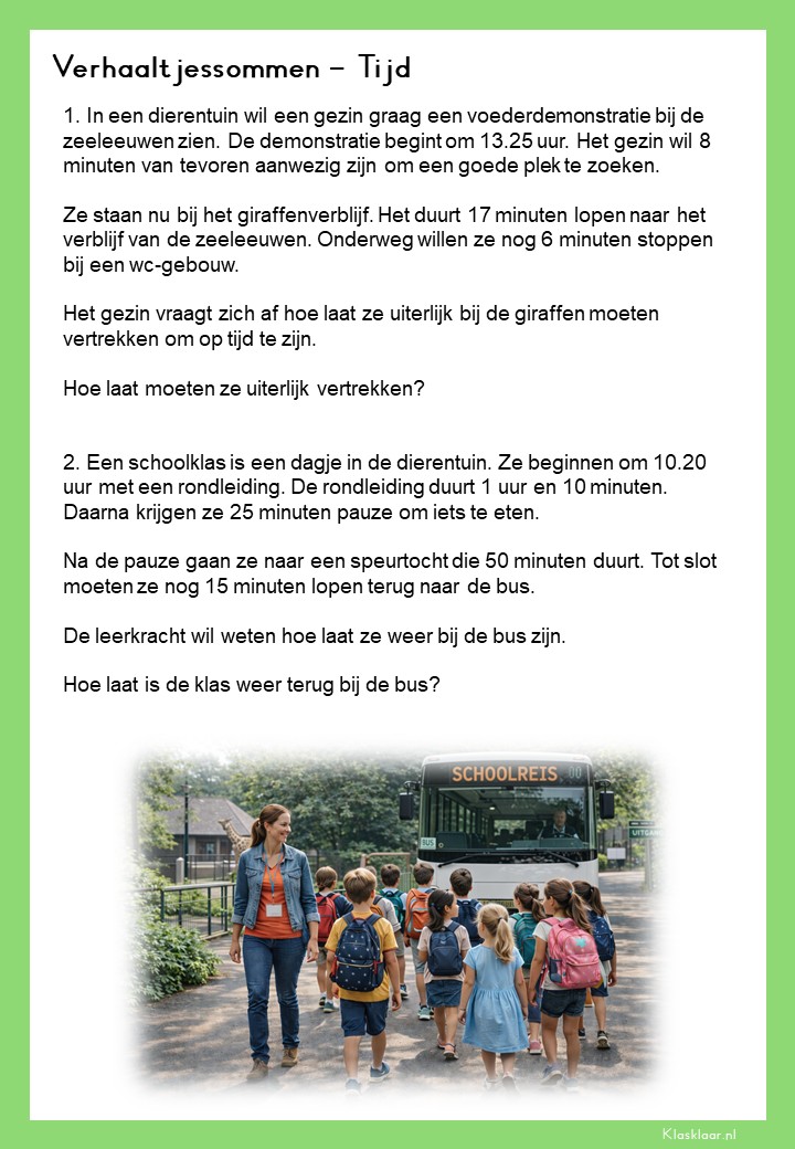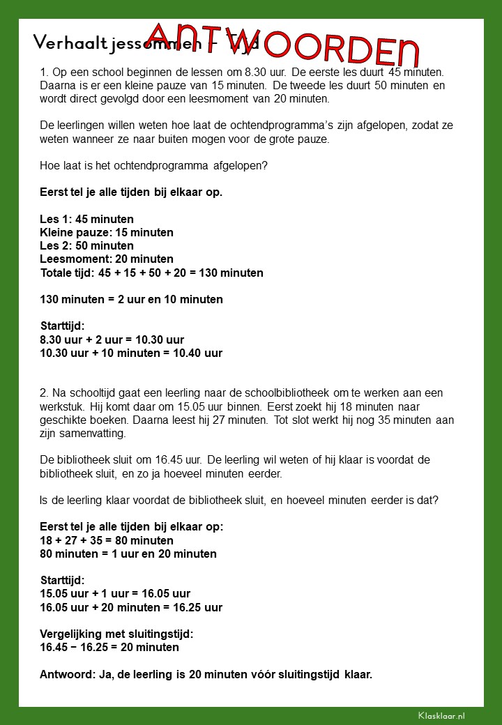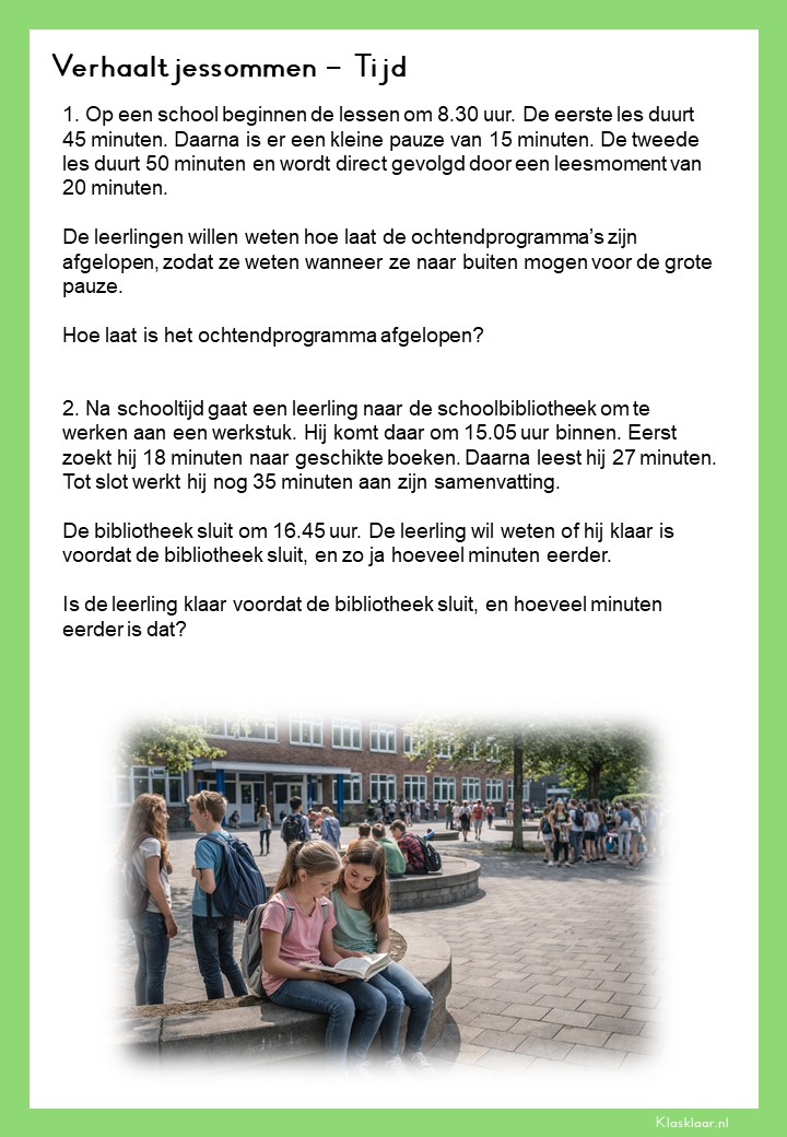 In groep 8 rekenen kinderen met tijd in steeds complexere situaties. Ze oefenen met tijdsverschillen, tijdlijnen en het omrekenen van minuten, uren en dagen. De opdrachten vragen om logisch nadenken en het plannen van stappen binnen één som. Zo ontwikkelen leerlingen een sterk tijdsbesef en zijn ze goed voorbereid op het voortgezet onderwijs.