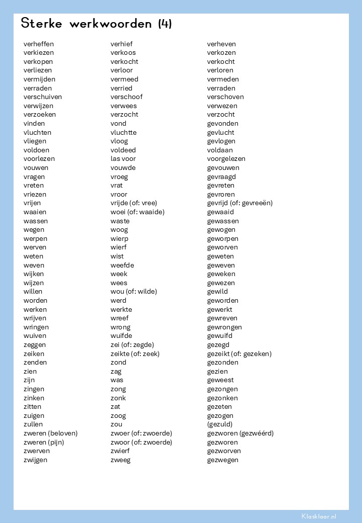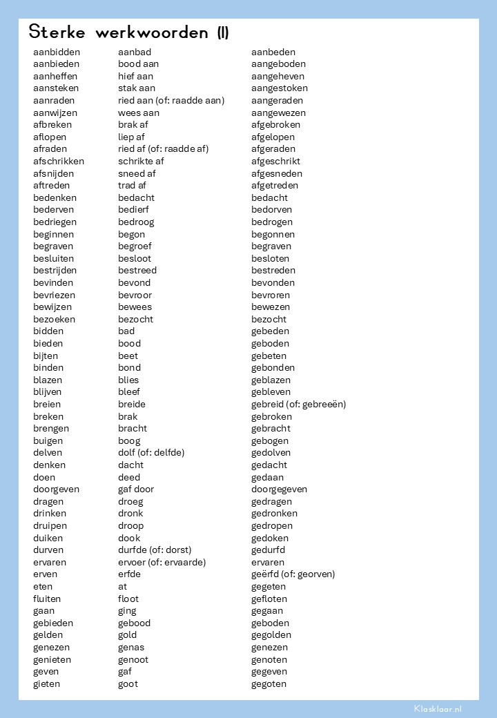Voor NT2-leerlingen zijn sterke werkwoorden vaak een lastige hobbel: de stam en verleden tijd lijken niet op elkaar, en de regels zijn niet altijd voorspelbaar. Juist daarom is het handig om een overzicht bij de hand te hebben. Met deze lijst kunnen leerlingen tijdens de les snel werkwoorden opzoeken en controleren. Het stimuleert zelfstandig werken én voorkomt dat ze blijven hangen in fouten. Door de lijst in hun la of map te bewaren, hebben ze altijd een hulpmiddel om hun taalvaardigheid te versterken en stap voor stap meer grip te krijgen op de Nederlandse grammatica.